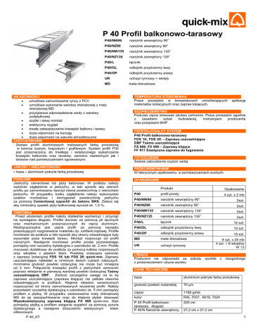 P30 profil prosty P 40 Profil balkonowo-tarasowy P40/NW90 narożnik wewnętrzny 90° P40/NZ90 narożnik zewnętrzny 90° P40/NW135 narożnik wewnętrzny 135° P40/NZ135 narożnik zewnętrzny 135° P40/L łącznik P40/OL odbojnik przyścienny lewy P40/OP odbojnik przyścienny prawy UR uchwyt rynnowy + wkręty MD mata drenażowa WŁAŚCIWOŚCI umożliwia zamontowanie rynny z PCV umożliwia wykonanie warstwy drenażowej z maty drenażowej MD przyśpiesza odprowadzenie wody z warstwy podpłytkowej szybki i łatwy montaż estetyczny wygląd trwałe zabezpieczenie krawędzi balkonu i tarasu duża odporność na korozję duża odporność na warunki atmosferyczne ZASTOSOWANIE Zestaw profili aluminiowych malowanych farbą proszkową w kolorze szarym, brązowym i grafitowym. System profili P30 jest przeznaczony do trwałego i estetycznego wykańczania krawędzi balkonów oraz tarasów, zarówno naziemnych jak i tarasów nad pomieszczeniami ogrzewanymi. JAKOŚĆ I NIEZAWODNOŚĆ • baza – aluminium pokryte farbą proszkową PODŁOŻE Jastrychy cementowe lub płyty betonowe. W podłożu należy wykonać zagłębienie w jastrychu, w taki sposób aby wierzch profilu po zamontowaniu tworzył równa powierzchnię z wierzchem jastrychu. W przypadku braku zagłębienia należy wykorzystać szablon montażowy i skorygować powierzchnię jastrychu za pomocą Cementowej szpachli do betonu BRS. Zaleca się aby minimalny spadek płyty balkonowej wynosił ok. 1,5 %. OBRÓBKA Przed ułożeniem profile należy dokładnie wymierzyć i przyciąć na wymagana długość. Profile docinać za pomocą pił ręcznych oraz mechanicznych przeznaczonych do cięcia aluminium. Niedopuszczalne jest cięcie profili za pomocą narzędzi powodujących rozgrzewanie materiału np. szlifierki kątowej. Profile montować do podłoża w taki sposób aby otwory odwadniające były wysunięte poza krawędź tarasu. Montaż rozpocząć od profili narożnych. Następnie montować profile proste pozostawiając pomiędzy nimi szczeliny dylatacyjne o szerokości ok. 2 mm. Profile mocować dodatkowo do podłoża za pomocą kołków rozporowych oraz wkrętów z płaskim łbem. Powłokę izolacyjna wykonać z zaprawy izolacyjnej FDS 1K lub FDS 2K quick-mix. Zaprawy uszczelniające nakładać w minimum dwóch cyklach roboczych, minimalna grubość powłoki izolacyjnej nie może być mniejsza od 2 mm. Połączenie krawędzi profili z jastrychem wzmocnić poprzez wklejenie w pierwszą warstwę powłoki izolacyjnej Taśmy uszczelniającej DBF. Zwrócić szczególna uwagę na to by zaprawa uszczelniająca (zaprawa klejąca) nie zatkała otworów odwadniających w profilach. Klejenie okładzin ceramicznych rozpoczynać od strony zamontowanych wcześniej profili. Należy pozostawić szczelinę dylatacyjną o szerokości ok. 5 mm pomiędzy profilem a płytką. W przypadku zastosowania maty drenażowej MD do jej zaszpachlowania oraz do klejenia płytek stosować Wysokoelastyczną zaprawę klejącą FX 900 quick-mix. Styk pomiędzy płytką a profilem wstępnie wypełnić za pomocą sznura dylatacyjnego a następnie doszczelnić elastycznym kitem silikonowym. P 40_KT TEMPERATURA STOSOWANIA Prace prowadzić w temperaturach umożliwiających materiałów izolacyjnych oraz zapraw klejących. aplikację BEZPIECZEŃSTWO Podczas cięcia stosować okulary ochronne. Prace prowadzić zgodnie z zasadami sztuki budowlanej, instrukcjami producenta oraz przepisami BHP. PROFESJONALNY SYSTEM P40 Profil balkonowo-tarasowy FDS 1K, FDS 2K – Zaprawy uszczelniające DBF Taśma uszczelniająca FX 600, FX 900 – Zaprawy klejące FF 911 Elastyczna zaprawa do fugowania CZYSZCZENIE Świeże zabrudzenia czyścić wodą PRZECHOWYWANIE W fabrycznym opakowaniu, w pomieszczeniach suchych. OPAKOWANIE Produkt Opakowanie P40 profil prosty 4 szt. x 2 mb P40/NW90 narożnik wewnętrzny 90° 2szt. P40/NZ90 narożnik zewnętrzny 90° 2szt. P40/NW135 narożnik wewnętrzny 135° 2szt. P40/NZ135 narożnik zewnętrzny 135° P40/L łącznik 10 szt. P40/OL odbojnik przyścienny lewy 10 szt. P40/OP odbojnik przyścienny prawy 10 szt. MD mata drenażowa UR uchwyt rynnowy 2szt. 6 szt. x 25 mb 4 szt. + 8 wkrętów W 13 UWAGA Producent nie odpowiada za szkody wynikłe z niezgodnego z przeznaczeniem użycia wyrobu. DANE TECHNICZNE baza aluminium pokryte farba proszkową grubość powłoki malarskiej 70 µm ciężar kolor 1180 g/mb RAL 7037, 8019, 7024 P 40 Profil balkonowotarasowy, długość P 40/N Narożnik zewnętrzny, 200 cm 27,2 cm x 27,2 cm 1 wymiar zewnętrzny Wysokość profilu (grubość warstwy: izolacja + mata MD + klej + płytka) 22 mm Przedstawione powyżej informacje uzyskano w wyniku obszernych prób i wieloletniego doświadczenia praktycznego. Nie daje się ono jednak przenieść na każdy wariant zastosowania. Dlatego też zalecamy wykonanie we własnym zakresie prób zastosowań. Zastrzegamy sobie prawo dokonywania zmian technicznych w ramach rozwoju produktu. W kwestiach pozostałych zastosowanie znajdują nasze ogólne warunki handlowe. P 40 Profil balkonowo- tarasowy Stan: maj 2015 Wraz z ukazaniem się niniejszej instrukcji technicznej, tracą ważność instrukcje poprzednie. P 40/NZ90 Narożnik zewnętrzny 90° P 40/L Łącznik Szersze informacje można uzyskać: quick-mix sp. z o.o. ul. Nyska 36 57-100 Strzelin P 40/O Odbojnik przyścienny tel. 71/ 392 72 20, 15 fax. 71/ 392 72 23, 24 e-mail: [email protected] www.quick-mix.pl UR Uchwyt rynnowy Wkręty Profil P 40 (przekrój) Narożniki (rzut) P 40_KT P 40/NZ90 P 40/NW90 P 40/NZ135 P 40/NW135 2