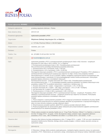 Numer ogłoszenia: 8939062 A RCHI WA L N E Kategoria ogłoszenia: przetarg zapytanie ofertowe - Polska Data dodania oferty: 2014-01-24 Przedmiot ogłoszenia: wykonanie posadzki z PCV Organizator: Wojskowe Zakłady Inżynieryjne S.A. w Dęblinie Adres: ul. 15 Pułku Piechoty Wilków 3, 08-530 Dęblin Województwo / powiat: lubelskie, pow. rycki Państwo: Polska Telefon / fax: tel.: (81)880-15-45 lub 504-144-748 E-mail: [email protected] Opis: wykonanie posadzki z PCV w pomieszczeniach produkcyjnych (hala nr 82) i biurowo - socjalnych (biurowiec B-l oraz hala nr 84) w WZInż. S.A. w Dęblinie I. Pomieszczenia produkcyjne (hala nr 82). Charakterystyka pomieszczeń. N/w pomieszczenia posiadają standardową posadzkę betonową: 1. Pomieszczenie ml4 o wymiarach: 6,80 x 4,90 [m], 2. Pomieszczenie nr 32 o wymiarach: 4,85 x 10,00 [m] Wymagania dotyczące posadzki z PCV w pomieszczeniach produkcyjnych Posadzka z PCV układana w pomieszczeniach produkcyjnych powinna być odporna na oleje i smary oraz przejazdy wózków akumulatorowych o nacisku na oś 2 OOOkG. Należy uwzględnić wykonanie kolorem kontrastowym tzw. pasa transportowego o szerokości 2,0 [m] przebiegającego wzdłuż środka pomieszczeń. Kolorystyka posadzki będzie omówiona w kontaktach roboczych. Pomieszczenia biurowo - socjalne (biurowiec B-l i hala nr 82). Charakterystyka pomieszczeń. N/w pomieszczenia (poz. 1, 2 i 3) posiadają posadzkę wyłożoną parkietem na podłożu betonowym oraz posadzkę z płytek PCV na podłożu betonowym i częściowo z terakoty (poz. 4): 1. Korytarz (biurowiec B-l, I piętro - księgowość) o wymiarach: 1,70 x 17,90 [m], 2. Korytarz (biurowiec B-l, II piętro - cały ciąg) o wymiarach: 1,70 x (17,90 + 9,00)[m], 3. Hol (biurowiec B-l, II piętro) o wymiarach: 5,65 x 3,20 [m], 4. Pomieszczenie nr 2 (hala nr 82) o wymiarach: 4,90 x 5,40 [m] Wymagania dotyczące posadzki z PCV w pomieszczeniach biurowo - socjalnych. Posadzka z PCV układana w pomieszczeniach biurowo - socjalnych powinna być odporna na ścieranie. Kolorystyka posadzki będzie omówiona w kontaktach roboczych. Uwaga: 1. Prace związane z wykonywaniem posadzki z PCV mogą być prowadzone niezależnie od pracy Spółki. Pomieszczenia przeznaczone do ułożenia posadzki aktualnie są wyposażone w osprzęt technologiczny, który na czas remontu zostanie usunięty własnymi siłami, 2. Dotychczasowe posadzki (parkiet, płytki PCV) zostaną usunięte własnymi siłami, 3. Przed przystąpieniem do opracowania oferty wskazane jest przeprowadzenie oględzin pomieszczeń przeznaczonych do ułożenia posadzek z PCV, Miejsce i termin składania ofert: Ofertę należy przesłać do siedziby Spółki przy ul. 15-go Pułku Piechoty „Wilków" 3 w Dęblinie, w terminie do dnia 10 lutego 2014 r. do godz. 14:00. Na kopercie należy umieścić napis „Zapytanie ofertowe posadzka z PCV" oraz „ NIE OTWIERAĆ DO DNIA 11 LUTEGO 2014 r. DO GODZ. 11:00". Otwarcie ofert: Otwarcia ofert dokona komisja przetargowa w dniu 11 lutego 2014 r. o godz. 11:00, po czym niezwłocznie zawiadomi telefonicznie Oferenta, którego oferta została przyjęta i z którym należy zawrzeć umowę na wykonanie usługi. Termin składania: 2014-02-10 Wymagania: Z Oferentem, którego oferta zostanie zaakceptowana, niezbędne będzie zawarcie umowy na wykonanie posadzek z PCV, Wykonawca, po wykonaniu usługi, zobowiązany jest doręczyć atesty materiałów użytych do wykonania posadzek z PCV, które będą załącznikami do Protokołu zdawczo - odbiorczego, 7. Przewidywany termin rozpoczęcia przedsięwzięcia - 8 tydzień 2014 r. (po podpisaniu umowy). Oferta powinna zawierać: 1. Dokładne oznaczenie Oferenta - pełna nazwa firmy z adresem i numerem kontaktowym, 2. Cenę ogółem netto i brutto wykonania powyższych prac w rozbiciu na cenę netto i brutto wykonania prac w hali nr 84 i biurowcu B-l, 3. Termin rozpoczęcia i zakończenia prac, 4. Warunki gwarancji, 5. Listę inwestycji przeprowadzonych w ostatnich 3 latach z podaniem adresu inwestora i nr telefonu. Kontakt: Osobą uprawnioną do udzielania informacji w powyższym temacie jest pan Lesław Zwoliński tel.: (81)880-15-45 lub 504-144-748, e-mail: [email protected] Źródło: Internet i własne Załączniki: ZIP specyfikacja