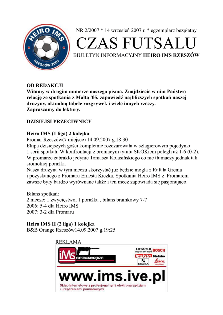 NR 2/2007 * 14 wrzesień 2007 r. * egzemplarz bezpłatny CZAS FUTSALU BIULETYN INFORMACYJNY HEIRO IMS RZESZÓW OD REDAKCJI Witamy w drugim numerze naszego pisma. Znajdziecie w nim Państwo relację ze spotkania z Maltą '05, zapowiedź najblizszych spotkań naszej drużyny, aktualną tabele rozgrywek i wiele innych rzeczy. Zapraszamy do lektury. DZISIEJSI PRZECIWNICY Heiro IMS (1 liga) 2 kolejka Promar Rzeszów(7 miejsce) 14.09.2007 g.18:30 Ekipa dzisiejszych gości kompletnie rozczarowała w szlagierowym pojedynku 1 serii spotkań. W konfrontacji z broniącym tytułu SKOKiem polegli aż 1-6 (0-2). W promarze zabrakło jedynie Tomasza Kolasińskiego co nie tłumaczy jednak tak sromotnej porażki. Nasza druzyna w tym meczu skorzystać juz będzie mogła z Rafała Grenia i pozyskanego z Promaru Ernesta Kiczka. Spotkania Heiro IMS z Promarem zawsze były bardzo wyrównane także i ten mecz zapowiada się pasjonująco. Bilans spotkań: 2 mecze: 1 zwycięstwo, 1 porażka , bilans bramkowy 7-7 2006: 5-4 dla Heiro IMS 2007: 3-2 dla Promaru Heiro IMS II (2 liga) 1 kolejka B&B Orange Rzeszów14.09.2007 g.19:25 REKLAMA TABELA 1 LIGI po 1 kolejce 1 HEIRO IMS RZESZÓW 1 3 9-4 2 SKOK Stefczyka Rzeszów 1 3 6-1 1 3 6-1 4 Tomy Więcpol Rzeszów 1 3 4-0 5 Bać-Pol Rzeszów 1 0 0-4 6 Malta '05 Rzeszów 1 0 4-9 7 Promar Rzeszów 1 0 1-6 1 0 1-6 0 0 0-0 B&B Orange Rzeszów 0 0 0-0 C8038 Rzeszów 0 0 0-0 OrlenPetrotank Widełka 0 0 0-0 Polchemia Rzeszów 0 0 0-0 Sigma-Apollo Rzeszów 0 0 0-0 Techmet Rzeszów 0 0 0-0 WP Rzeszów 0 0 0-0 Pudliszki Rzeszów FC Plastyk Rzeszów Wyniki 1 kolejki: Malta '05 - HEIRO IMS 4-9 (1-4) relacja na str. 3 Promar – SKOK 1-6 (0-2) Tomy Więcpol – Bać-Pol 4-0 (2-0) FC Plastyk – Pudliszki 1-6 (0-2) WYKAZ EKIP 2 LIGI 1 HEIRO IMS II RZESZÓW Program 1 kolejki: 12.09, g.18:30 WP Rzeszów – Polchemia 12.09, g.21:15 Techmet - C8038 14.09, g.19:25 Heiro IMS II - B&B Orange 14.09, g.20:20 Orlen PetroTank – Sigma-Apollo strona 2 OSTATNIE SPOTKANIE Malta '05 Rzeszów – Heiro IMS Rzeszów 4-9 (1-4) Heiro IMS do tego spotkania przystąpiło w roli faworyta. Niestety nie mogliśmy skorzystać ze wszystkich wzmocnień jakie poczynilismy (brak Grenia i Kiczka). Od pierwszych minut nasza ekipa zyskała przewagę. Stwarzaliśmy dużo więcej sytuacji bramkowych niz przeciwnik i na przerwę schodziliśmy prowadząc 4-1. Tylko jedna bramka stracona to zasluga dobrze dysponowanego golkipera Heiro IMS, Dariusza Brzyskiego. Po przerwie mimo zdobytych 5 bramek zmarnowaliśmy mnóstwo klarownych sytuacji do podwyższenia wyniku. Dodatkowo po banalnych błędach obrony i bramkarza rywale doprowadzili do wyniku 4-6. Później jednak konsekwentna gra w defensywie i dobrze wyprowadzane kontry pozwoliły na zwiększenie przewagi do 5 bramek. Ostatecznie wynik 9-4 może cieszyć, gdyż różnie bywało w inaguracyjnych spotkaniach naszej ekipy. Bramki dla Heiro IMS: Pietrucha 3, Krawczyk Ł. 2, Mrzygłód 2, Krawczyk P. 1, Krupa 1. Skład: Brzyski, Kordas – Amarowicz, Krawczyk Ł., Krawczyk P., Krupa, Kubicz, Mrzygłód, Pietrucha. Aktualna tabela na str. 2 SPONSORZY Dziękujemy za wsparcie firmom: ERPATECH, IMS, HEIRO oraz WISPOL bez których ciężko byłoby zapoczątkować działalność naszego klubu. ROZPOCZNIJ WSPOŁPRACĘ Heiro IMS to dynamicznie rozwijająca się drużyna piłki nożnej halowej. Posiadamy m.in. własny profesjonalny serwis internetowy oraz biuletyn klubowy. Minimalne nakłady finansowe pozwolą na ciekawą, skuteczną reklamę Państwa firmy, a naszemu klubowi pomoże to w funkcjonowaniu. Zapraszamy do współpracy wszystkie zainteresowane firmy. strona 3 CO POWINNEŚ WIEDZIEĆ Chciałbym zagrać w Heiro IMS co muszę zrobić ? Przede wszystkim należy ze strony klubowej pobrać deklarację, wypełnic ją, podpisac i przesłac na adres klubu. Dodatkowo należy wpłacić składkę rejestracyjną w wysokości 20 złotych. Od tego momentu mozna uczestniczyć w działalności klubu. Chciałbym pomóc organizacyjnie klubowi co należy zrobić ? Jako „raczkujący” klub poszukujemy osób, które zaangażują się w działalność naszego stowarzyszenia. Wystarczy jedynie skontaktować się z prezesem klubu p. Łukaszem Krawczykiem (dane kontaktowe poniżej). Na jakiej zasadzie działa klub i czym się zajmuje ? Heiro IMS oparte jest na strukturach stowarzyszenia Heiro Futsal. Jestesmy organizacją niedochodową co oznacza, że wszystkie fundusze przeznaczamy na naszą działalność statutową czyli w praktyce na: sprzęt sportowy, wynajem hali, mecze, w przyszłości turnieje dla młodzieży i inne. Podstawowe informacje o klubie: HEIRO IMS RZESZÓW Siedziba: ul. Lewakowskiego 5A/6, 35-125 Rzeszów tel. 600-418-812, mail: [email protected] www.futsal.heiro.pl Oficjalny rok powstania: 2007 Barwy: granatowo-biało-czerwone Prezes: Łukasz Krawczyk Kierownik: Wojciech Spirała strona 4