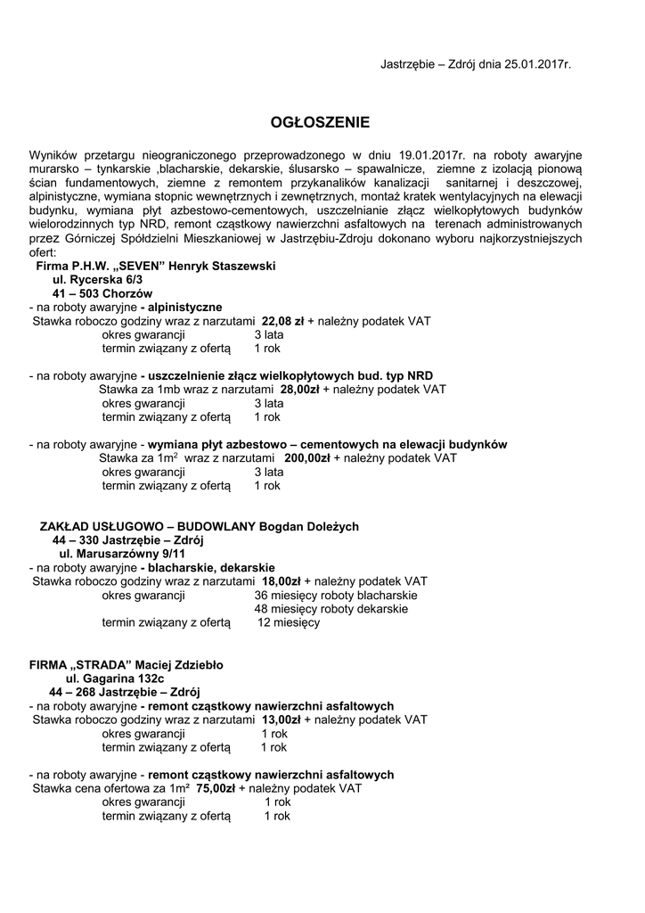 Jastrzębie – Zdrój dnia 25.01.2017r. OGŁOSZENIE Wyników przetargu nieograniczonego przeprowadzonego w dniu 19.01.2017r. na roboty awaryjne murarsko – tynkarskie ,blacharskie, dekarskie, ślusarsko – spawalnicze, ziemne z izolacją pionową ścian fundamentowych, ziemne z remontem przykanalików kanalizacji sanitarnej i deszczowej, alpinistyczne, wymiana stopnic wewnętrznych i zewnętrznych, montaż kratek wentylacyjnych na elewacji budynku, wymiana płyt azbestowo-cementowych, uszczelnianie złącz wielkopłytowych budynków wielorodzinnych typ NRD, remont cząstkowy nawierzchni asfaltowych na terenach administrowanych przez Górniczej Spółdzielni Mieszkaniowej w Jastrzębiu-Zdroju dokonano wyboru najkorzystniejszych ofert: Firma P.H.W. „SEVEN” Henryk Staszewski ul. Rycerska 6/3 41 – 503 Chorzów - na roboty awaryjne - alpinistyczne Stawka roboczo godziny wraz z narzutami 22,08 zł + należny podatek VAT okres gwarancji 3 lata termin związany z ofertą 1 rok - na roboty awaryjne - uszczelnienie złącz wielkopłytowych bud. typ NRD Stawka za 1mb wraz z narzutami 28,00zł + należny podatek VAT okres gwarancji 3 lata termin związany z ofertą 1 rok - na roboty awaryjne - wymiana płyt azbestowo – cementowych na elewacji budynków Stawka za 1m2 wraz z narzutami 200,00zł + należny podatek VAT okres gwarancji 3 lata termin związany z ofertą 1 rok ZAKŁAD USŁUGOWO – BUDOWLANY Bogdan Doleżych 44 – 330 Jastrzębie – Zdrój ul. Marusarzówny 9/11 - na roboty awaryjne - blacharskie, dekarskie Stawka roboczo godziny wraz z narzutami 18,00zł + należny podatek VAT okres gwarancji 36 miesięcy roboty blacharskie 48 miesięcy roboty dekarskie termin związany z ofertą 12 miesięcy FIRMA „STRADA” Maciej Zdziebło ul. Gagarina 132c 44 – 268 Jastrzębie – Zdrój - na roboty awaryjne - remont cząstkowy nawierzchni asfaltowych Stawka roboczo godziny wraz z narzutami 13,00zł + należny podatek VAT okres gwarancji 1 rok termin związany z ofertą 1 rok - na roboty awaryjne - remont cząstkowy nawierzchni asfaltowych Stawka cena ofertowa za 1m² 75,00zł + należny podatek VAT okres gwarancji 1 rok termin związany z ofertą 1 rok Zakład Instalacyjno – Budowlany „INSTAL- MIEDŹ” s.c. ul. Gagarina 28G 44 – 268 Jastrzębie - Zdrój - na roboty awaryjne - ziemne z izolacja pionowa ścian fundamentowych, ziemne z remontem przykanalików kanalizacji sanitarnej i deszczowej, wymiana stopnic wewnętrznych i zewnętrznych Stawka roboczo godziny wraz z narzutami 18,40 zł + należny podatek VAT okres gwarancji 36 miesięcy termin związany z ofertą 1 rok od upływu składania ofert INSTAL – MIEDŹ Robert Zalewski Mariusz Ochnio Spółka Jawna ul. Gagarina 28G 44 – 268 Jastrzębie - Zdrój - na roboty awaryjne - roboty ślusarsko – spawalnicze, roboty ziemne z remontem przykanalików wymiana stopnic wewnętrznych i zewnętrznych Stawka roboczo godziny wraz z narzutami 18,40 zł + należny podatek VAT okres gwarancji 3 lata termin związany z ofertą 1 rok od upływu terminu składania ofert AJ DECOR FHU Agnieszka Jeziorska - Ścigała 43 – 225Wola ul. Słoneczna 18/9 - na roboty awaryjne - ślusarsko - spawalnicze Stawka roboczo godziny wraz z narzutami 17,80 zł + należny podatek VAT okres gwarancji 3 lata termin związany z ofertą 1 rok WODNIK USŁUGI WOD. – KAN., CO. GAZ I OGOLNOBUDOWLANE Augustyn Szpiech ul. Słowackiego 15g 43 – 410 Zebrzydowice - na roboty awaryjne - murarsko tynkarskie, blacharskie, dekarskie Stawka roboczo godziny wraz z narzutami 18,00 zł + należny podatek VAT okres gwarancji 1 rok termin związany z ofertą 30 dni Ponadto przyjęto w drugiej kolejności oferty firm dodatkowo na wykonanie robót awaryjnych. Niżej wymienione firmy będą brane pod uwagę, jeżeli wybrane firmy nie będą w stanie wykonać robót w określonym terminie. WODNIK USŁUGI WOD. – KAN., CO. GAZ I OGOLNOBUDOWLANE Augustyn Szpiech ul. Słowackiego 15g 43 – 410 Zebrzydowice - na roboty awaryjne - ślusarsko – spawalnicze, ziemne z izolacją pionową ścian fundamentowych, ziemne z remontem przykanalików kanalizacji sanitarnej i deszczowej, wymiana stopnic wewnętrznych i zewnętrznych Stawka roboczo godziny wraz z narzutami 18,00 zł + należny podatek VAT okres gwarancji 1 rok termin związany z ofertą 30 dni Zakład Remontowo –Budowlany „REMOBUD” ul. Marusarzówny 3/9 44 – 330 Jastrzębie – Zdrój - na roboty awaryjne - murarsko – tynkarskie, dekarskie, ziemne z izolacją pionową ścian fundamentowych, ziemne z remontem przykanalików kanalizacji sanitarnej i deszczowej, wymiana stopnic wewnętrznych i zewnętrznych Stawka roboczo godziny wraz z narzutami 18,40 zł + należny podatek VAT okres gwarancji 3 lata termin związany z ofertą jeden rok „BIES-BUD” ZAKŁAD USŁUG BUDOWLANYCH Józef Biesiada oś Ks. Władysława 3A/4 44 – 240 Żory - na roboty awaryjne - ślusarsko – spawalnicze, wymiana stopnic wewnętrznych i zewnętrznych Stawka roboczo godziny wraz z narzutami 18,41 zł + należny podatek VAT okres gwarancji 36 miesięcy termin związany z ofertą 1 rok Przedsiębiorstwo Budownictwa Wodnego i Drogowego „ALWAREX” ul. Szczygłów 17B 44 – 200 Rybnik - na roboty awaryjne - ziemne z izolacją pionową ścian fundamentowych, ziemne z remontem przykanalików kanalizacji sanitarnej i deszczowej Stawka roboczo godziny wraz z narzutami 19,80 zł + należny podatek VAT okres gwarancji 3 lata termin związany z ofertą 1 rok (do 19.01.2018r.) Podpisy członków komisji przetargowej.