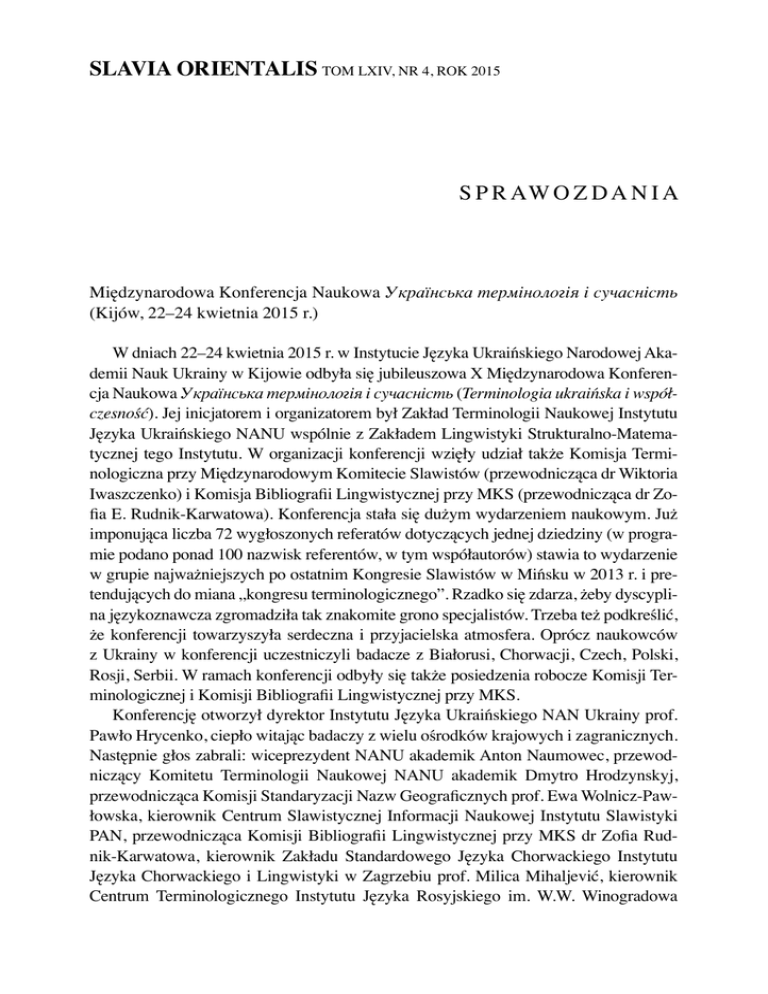 SLAVIA ORIENTALIS TOM LXIV, NR 4, ROK 2015 S P R AW O Z D A N I A Międzynarodowa Konferencja Naukowa Українська термiнологiя i сучаснiсть (Kijów, 22–24 kwietnia 2015 r.) W dniach 22–24 kwietnia 2015 r. w Instytucie Języka Ukraińskiego Narodowej Akademii Nauk Ukrainy w Kijowie odbyła się jubileuszowa X Międzynarodowa Konferencja Naukowa Українська термiнологiя i сучаснiсть (Terminologia ukraińska i współczesność). Jej inicjatorem i organizatorem był Zakład Terminologii Naukowej Instytutu Języka Ukraińskiego NANU wspólnie z Zakładem Lingwistyki Strukturalno-Matematycznej tego Instytutu. W organizacji konferencji wzięły udział także Komisja Terminologiczna przy Międzynarodowym Komitecie Slawistów (przewodnicząca dr Wiktoria Iwaszczenko) i Komisja Bibliografii Lingwistycznej przy MKS (przewodnicząca dr Zofia E. Rudnik-Karwatowa). Konferencja stała się dużym wydarzeniem naukowym. Już imponująca liczba 72 wygłoszonych referatów dotyczących jednej dziedziny (w programie podano ponad 100 nazwisk referentów, w tym współautorów) stawia to wydarzenie w grupie najważniejszych po ostatnim Kongresie Slawistów w Mińsku w 2013 r. i pretendujących do miana „kongresu terminologicznego”. Rzadko się zdarza, żeby dyscyplina językoznawcza zgromadziła tak znakomite grono specjalistów. Trzeba też podkreślić, że konferencji towarzyszyła serdeczna i przyjacielska atmosfera. Oprócz naukowców z Ukrainy w konferencji uczestniczyli badacze z Białorusi, Chorwacji, Czech, Polski, Rosji, Serbii. W ramach konferencji odbyły się także posiedzenia robocze Komisji Terminologicznej i Komisji Bibliografii Lingwistycznej przy MKS. Konferencję otworzył dyrektor Instytutu Języka Ukraińskiego NAN Ukrainy prof. Pawło Hrycenko, ciepło witając badaczy z wielu ośrodków krajowych i zagranicznych. Następnie głos zabrali: wiceprezydent NANU akademik Anton Naumowec, przewodniczący Komitetu Terminologii Naukowej NANU akademik Dmytro Hrodzynskyj, przewodnicząca Komisji Standaryzacji Nazw Geograficznych prof. Ewa Wolnicz-Pawłowska, kierownik Centrum Slawistycznej Informacji Naukowej Instytutu Slawistyki PAN, przewodnicząca Komisji Bibliografii Lingwistycznej przy MKS dr Zofia Rudnik-Karwatowa, kierownik Zakładu Standardowego Języka Chorwackiego Instytutu Języka Chorwackiego i Lingwistyki w Zagrzebiu prof. Milica Mihaljević, kierownik Centrum Terminologicznego Instytutu Języka Rosyjskiego im. W.W. Winogradowa 866 SPRAWOZDANIA RAN prof. Siergiej Szełow, doc. dr Kaciaryna Lubieckaja z Katedry Współczesnego Języka Białoruskiego Białoruskiego Uniwersytetu Państwowego, dr hab. Vladan Jovanović z Instytutu Języka Serbskiego Serbskiej Akademii Nauk i Sztuk. Nagranie video z przyjacielskimi pozdrowieniami z Pragi przekazali uczestnikom konferencji profesor honorowy Uniwersytetu Dalhousie Rostislav Kocourek i dr Ivana Bozděchová z Instytutu Języka Czeskiego i Teorii Komunikacji Uniwersytetu Karola w Pradze. Po części oficjalnej odbyło się posiedzenie plenarne, na którym wygłoszonych zostało 8 referatów. Ludmyła Symonenko (Kijów) w referacie Десята ювiлейна Мiжнародна наукoвa конференцiя «Українська термiнологiя i сучаснiсть» przeprowadziła analizę dziewięciu poprzednich konferencji terminologicznych z tego cyklu, określiła najważniejsze problemy i ich rozwiązanie. Wiktoria Iwaszczenko (Kijów) wystąpiła z referatem Перiодизацiя iсторiї становлення української термiнологiї на тлi термiнологiчної дiяльностi в Українi: традицiйнi вимiри, w którym omówiła chronologicznie poglądy ukraińskich językoznawców na periodyzację historii kształtowania się ukraińskiej terminologii naukowej i zaprezentowała własną koncepcję tego zagadnienia. W wystąpieniu Ewy Wolnicz-Pawłowskiej i Mariusza Górnicza (Warszawa) Standaryzacja terminologii w Polsce w końcu XX i na początku XXI wieku przedstawione zostały podstawowe publikacje polskich autorów poświęcone normalizacji terminologii, a także działalność polskich organizacji w tym zakresie. Kaciaryna Lubieckaja (Mińsk) w wystąpieniu Белорусская национальная терминология: тенденции формирования в ХХ–ХХI вв. rozpatrzyła podstawowe tendencje kształtowania się terminologii narodowej w języku białoruskim. Przedmiotem analizy Siergieja Szelowa (Moskwa) w referacie Термин как основная единица терминологии: разнообразие определений и единство понимания było pojęcie ‘termin’. Autor dopuszcza możliwość uznania za terminy jednostek, które nie mają definicji, lecz są w pełni motywowane swoją budową złożoną z terminoelementów i budową składniową, oraz proponuje własną definicję terminu o charakterze kognitywnym. W referacie chorwackich badaczek Lany Hudeček i Milicy Michaljević (Zagrzeb) Croatian Orthographic Manual and Standarization of Terminology analizie został poddany wpływ przepisów ortograficznych języka chorwackiego na chorwacką terminologię. Z kolei Iryna Koczan (Lwów) w swoim wystąpieniu Термiнологiчнi питання на стoрiнках часопису «Рiдна мова» omówiła publikacje dotyczące terminologii w ukraińskim czasopiśmie (miesięczniku) wydawanym w Warszawie w latach 1933–1939 przez prof. Iwana Ohijenko. W referacie Konstantina Awerbucha (Moskwa) Современное терминоведение: прописные истины и классические заблуждения rozpatrywane były podstawy współczesnego terminoznawstwa jako złożonej dziedziny, składającej się z wielu powiązanych ze sobą elementów. Obrady popołudniowe pier