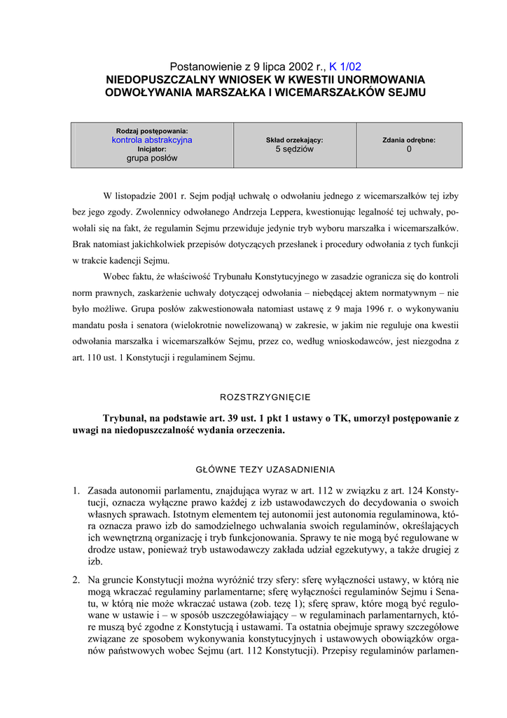 Postanowienie z 9 lipca 2002 r., K 1/02 NIEDOPUSZCZALNY WNIOSEK W KWESTII UNORMOWANIA ODWOŁYWANIA MARSZAŁKA I WICEMARSZAŁKÓW SEJMU Rodzaj postępowania: kontrola abstrakcyjna Inicjator: grupa posłów Skład orzekający: Zdania odrębne: 5 sędziów 0 W listopadzie 2001 r. Sejm podjął uchwałę o odwołaniu jednego z wicemarszałków tej izby bez jego zgody. Zwolennicy odwołanego Andrzeja Leppera, kwestionując legalność tej uchwały, powołali się na fakt, że regulamin Sejmu przewiduje jedynie tryb wyboru marszałka i wicemarszałków. Brak natomiast jakichkolwiek przepisów dotyczących przesłanek i procedury odwołania z tych funkcji w trakcie kadencji Sejmu. Wobec faktu, że właściwość Trybunału Konstytucyjnego w zasadzie ogranicza się do kontroli norm prawnych, zaskarżenie uchwały dotyczącej odwołania – niebędącej aktem normatywnym – nie było możliwe. Grupa posłów zakwestionowała natomiast ustawę z 9 maja 1996 r. o wykonywaniu mandatu posła i senatora (wielokrotnie nowelizowaną) w zakresie, w jakim nie reguluje ona kwestii odwołania marszałka i wicemarszałków Sejmu, przez co, według wnioskodawców, jest niezgodna z art. 110 ust. 1 Konstytucji i regulaminem Sejmu. ROZSTRZYGNIĘCIE Trybunał, na podstawie art. 39 ust. 1 pkt 1 ustawy o TK, umorzył postępowanie z uwagi na niedopuszczalność wydania orzeczenia. GŁÓWNE TEZY UZASADNIENIA 1. Zasada autonomii parlamentu, znajdująca wyraz w art. 112 w związku z art. 124 Konstytucji, oznacza wyłączne prawo każdej z izb ustawodawczych do decydowania o swoich własnych sprawach. Istotnym elementem tej autonomii jest autonomia regulaminowa, która oznacza prawo izb do samodzielnego uchwalania swoich regulaminów, określających ich wewnętrzną organizację i tryb funkcjonowania. Sprawy te nie mogą być regulowane w drodze ustaw, ponieważ tryb ustawodawczy zakłada udział egzekutywy, a także drugiej z izb. 2. Na gruncie Konstytucji można wyróżnić trzy sfery: sferę wyłączności ustawy, w którą nie mogą wkraczać regulaminy parlamentarne; sferę wyłączności regulaminów Sejmu i Senatu, w którą nie może wkraczać ustawa (zob. tezę 1); sferę spraw, które mogą być regulowane w ustawie i – w sposób uszczegóławiający – w regulaminach parlamentarnych, które muszą być zgodne z Konstytucją i ustawami. Ta ostatnia obejmuje sprawy szczegółowe związane ze sposobem wykonywania konstytucyjnych i ustawowych obowiązków organów państwowych wobec Sejmu (art. 112 Konstytucji). Przepisy regulaminów parlamen- 2 tarnych dotyczące tych zagadnień muszą być zgodne zarówno z Konstytucją, jak i z ustawami. 3. Ani z art. 110, ani z innego przepisu Konstytucji nie wynika, iżby zagadnienia związane z odwołaniem marszałka i wicemarszałków Sejmu miały być uregulowane w ustawie. Sprawy te dotyczą organizacji wewnętrznej Sejmu i jako takie należą – wobec braku unormowania w Konstytucji – do zakresu wyłączności regulaminu Sejmu, uchwalanego na podstawie art. 112 Konstytucji, nie mogą zaś być regulowane w ustawie. Z drugiej strony z przepisów Konstytucji nie można wyprowadzić bezwzględnego nakazu uregulowania w regulaminie izby przesłanek i trybu odwoływania marszałka i wicemarszałków Sejmu. Wobec nieistnienia kadencyjności tych funkcji kwestie związane z odwołaniem mogą być też pozostawione do rozstrzygnięcia przez praktykę parlamentarną. 4. Konstytucja w art. 188 wyczerpująco określa zakres kompetencji jurysdykcyjnych Trybunału Konstytucyjnego. Do zakresu tego nie należy ocena zgodności z prawem aktów stosowania prawa przez parlament i jego organy. 5. W postępowaniu przed Trybunałem Konstytucyjnym regulaminy Sejmu i Senatu mogą stanowić podstawę kontroli ustawy z punktu widzenia dochowania przy jej stanowieniu trybu wymaganego przez przepisy prawa. Wspomniane regulaminy nie mogą być natomiast wzorcem kontroli treści aktów normatywnych. 6. Trybunał Konstytucyjny bada treści normatywne pozytywnie wyrażone w aktach normatywnych. Trybunał nie ma kompetencji do orzekania o zaniechaniach ustawodawcy polegających na niewydaniu aktu ustawodawczego, choćby obowiązek jego wydania wynikał z norm konstytucyjnych. W przypadku natomiast aktu ustawodawczego wydanego i obowiązującego Trybunał ma kompetencję do oceny jego konstytucyjności również z tego punktu widzenia, czy w jego przepisach nie brakuje unormowań, bez których, ze względu na naturę objętej aktem regulacji, może on budzić wątpliwości natury konstytucyjnej. Zarzut niekonstytucyjności może więc dotyczyć zarówno tego, co ustawodawca w danym akcie unormował, jak i tego, co w akcie tym pominął, choć postępując zgodnie z Konstytucją powinien był unormować. 7. Przedstawiony w niniejszej sprawie zarzut zaniechania ustawodawczego, dotyczący braku uregulowania trybu odwoływania marszałka i wicemarszałków Sejmu, nie pozostaje w związku z zakresem regulacji ustawy z dnia 9 maja 1996 r. o wykonywaniu mandatu posła i senatora. Przepisy Konstytucji i ustawy o TK Konstytucja Art. 110. 1. Sejm wybiera ze swojego grona Marszałka Sejmu i wicemarszałków. 2. Marszałek Sejmu przewodniczy obradom Sejmu, strzeże praw Sejmu oraz reprezentuje Sejm na zewnątrz. 3. Sejm powołuje komisje stałe oraz może powoływać komisje nadzwyczajne. Art. 112. Organizację wewnętrzną i porządek prac Sejmu oraz tryb powoływania i działalności jego organów, jak też sposób wykonywania konstytucyjnych i ustawowych obowiązków organów państwowych wobec Sejmu określa regulamin Sejmu uchwalony przez Sejm. Art. 124. Do Senatu stosuje się odpowiednio przepisy art. 110, art. 112, art. 113 i art. 120. Art. 188. Trybunał Konstytucyjny orzeka w sprawach: 1) zgodności ustaw i umów międzynarodowych z Konstytucją, 2) zgodności ustaw z ratyfikowanymi umowami międzynarodowymi, których ratyfikacja wymagała uprzedniej zgody wyrażonej w ustawie, 3) zgodności prze