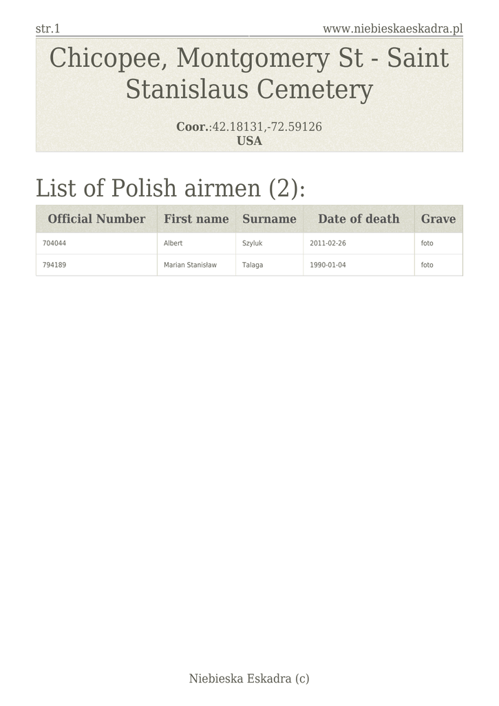 str.1 www.niebieskaeskadra.pl Chicopee, Montgomery St - Saint Stanislaus Cemetery Coor.:42.18131,-72.59126 USA List of Polish airmen (2): Official Number First name Surname 704044 Albert Szyluk 2011-02-26 foto 794189 Marian Stanisław Talaga 1990-01-04 foto Niebieska Eskadra (c) Date of death Grave