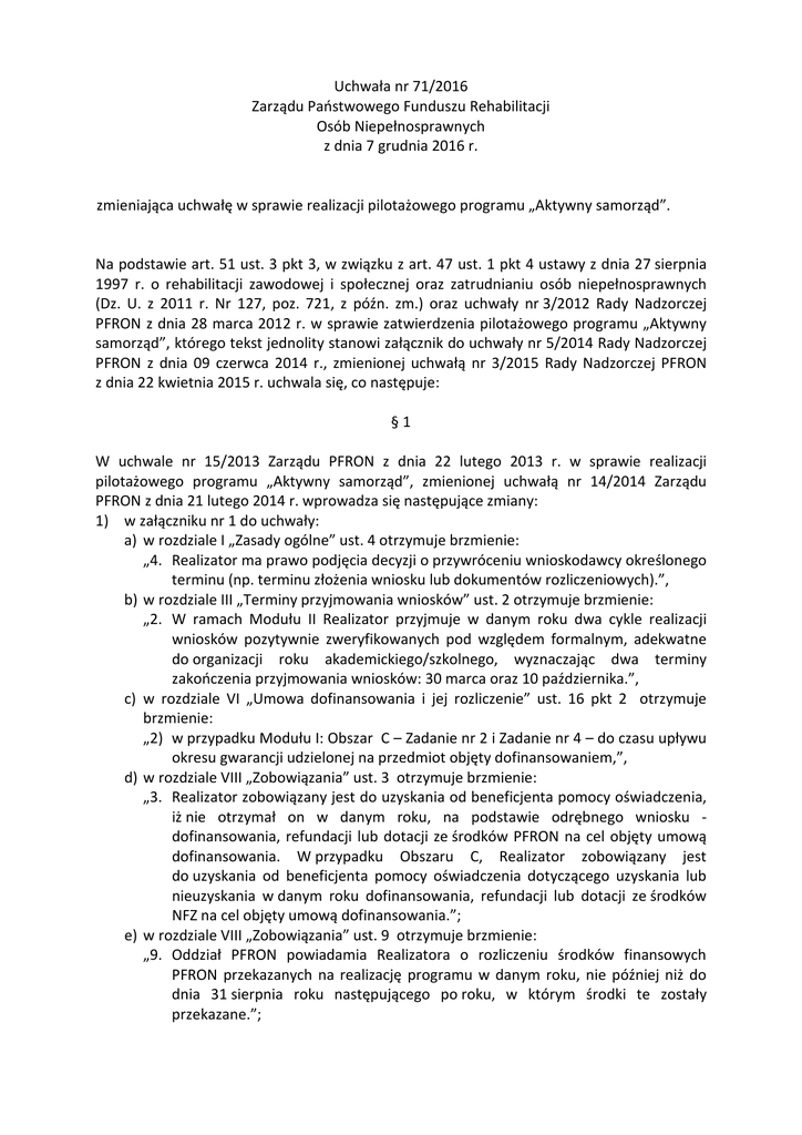 Uchwała nr 71/2016 Zarządu Państwowego Funduszu Rehabilitacji Osób Niepełnosprawnych z dnia 7 grudnia 2016 r. zmieniająca uchwałę w sprawie realizacji pilotażowego programu „Aktywny samorząd”. Na podstawie art. 51 ust. 3 pkt 3, w związku z art. 47 ust. 1 pkt 4 ustawy z dnia 27 sierpnia 1997 r. o rehabilitacji zawodowej i społecznej oraz zatrudnianiu osób niepełnosprawnych (Dz. U. z 2011 r. Nr 127, poz. 721, z późn. zm.) oraz uchwały nr 3/2012 Rady Nadzorczej PFRON z dnia 28 marca 2012 r. w sprawie zatwierdzenia pilotażowego programu „Aktywny samorząd”, którego tekst jednolity stanowi załącznik do uchwały nr 5/2014 Rady Nadzorczej PFRON z dnia 09 czerwca 2014 r., zmienionej uchwałą nr 3/2015 Rady Nadzorczej PFRON z dnia 22 kwietnia 2015 r. uchwala się, co następuje: §1 W uchwale nr 15/2013 Zarządu PFRON z dnia 22 lutego 2013 r. w sprawie realizacji pilotażowego programu „Aktywny samorząd”, zmienionej uchwałą nr 14/2014 Zarządu PFRON z dnia 21 lutego 2014 r. wprowadza się następujące zmiany: 1) w załączniku nr 1 do uchwały: a) w rozdziale I „Zasady ogólne” ust. 4 otrzymuje brzmienie: „4. Realizator ma prawo podjęcia decyzji o przywróceniu wnioskodawcy określonego terminu (np. terminu złożenia wniosku lub dokumentów rozliczeniowych).”, b) w rozdziale III „Terminy przyjmowania wniosków” ust. 2 otrzymuje brzmienie: „2. W ramach Modułu II Realizator przyjmuje w danym roku dwa cykle realizacji wniosków pozytywnie zweryfikowanych pod względem formalnym, adekwatne do organizacji roku akademickiego/szkolnego, wyznaczając dwa terminy zakończenia przyjmowania wniosków: 30 marca oraz 10 października.”, c) w rozdziale VI „Umowa dofinansowania i jej rozliczenie” ust. 16 pkt 2 otrzymuje brzmienie: „2) w przypadku Modułu I: Obszar C – Zadanie nr 2 i Zadanie nr 4 – do czasu upływu okresu gwarancji udzielonej na przedmiot objęty dofinansowaniem,”, d) w rozdziale VIII „Zobowiązania” ust. 3 otrzymuje brzmienie: „3. Realizator zobowiązany jest do uzyskania od beneficjenta pomocy oświadczenia, iż nie otrzymał on w danym roku, na podstawie odrębnego wniosku dofinansowania, refundacji lub dotacji ze środków PFRON na cel objęty umową dofinansowania. W przypadku Obszaru C, Realizator zobowiązany jest do uzyskania od beneficjenta pomocy oświadczenia dotyczącego uzyskania lub nieuzyskania w danym roku dofinansowania, refundacji lub dotacji ze środków NFZ na cel objęty umową dofinansowania.”; e) w rozdziale VIII „Zobowiązania” ust. 9 otrzymuje brzmienie: „9. Oddział PFRON powiadamia Realizatora o rozliczeniu środków finansowych PFRON przekazanych na realizację programu w danym roku, nie później niż do dnia 31 sierpnia roku następującego po roku, w którym środki te zostały przekazane.”; 2) w załączniku nr 4 do uchwały: a) w § 2 ust. 1, wyrazy: „1. Przekazanie przyznanych przez PFRON środków finansowych na realizację programu w 20.... roku”, zastępuje się wyrazami: „1. Przekazanie przyznanych przez PFRON w 20.... roku środków finansowych na realizację programu”, b) w § 2 ust. 3 otrzymuje brzmienie: „3. Wysokość środków, o których mowa w ust. 1 pkt 2 ustalana jest przez PFRON z uwzględnieniem możliwości finansowych PFRON, stopnia wykorzystania przez Realizatora środków przekazanych w ramach pierwszej transzy oraz proporcjonalnie do liczby wniosków o dofinansowanie lub kwoty zapotrzebowania we wnioskach zweryfikowanych pozytywnie pod względem formalnym/ merytorycznym.”, c) w § 5 ust. 1 otrzymuje brzmienie: „1. Realizator zobowiązany jest do złożenia do PFRON rozliczenia przekazanych przez PFRON środków finansowych na realizację Modułów: I i II programu, w następujących terminach: 1) do dnia 15 października każdego roku – w zakresie środków, o których mowa w § 2 ust. 1 pkt 1, 2) do dnia 31 stycznia roku następującego po zakończeniu danego roku realizacji programu - w zakresie całości środków przekazanych w danym roku, 3) do dnia 15 kwietnia roku następującego po zakończeniu danego roku realizacji programu - w zakresie całości środków przekazanych w danym roku, z zastrzeżeniem § 2 ust. 7-9.”, d) w § 5 ust. 2 pkt 2 otrzymuje brzmienie: „2) zaktualizowaną bazę danych z realizacji programu, prowadzoną zgodnie z wymaganiami określonymi w § 3 ust. 4 pkt 2, z wyłączeniem terminu, o którym mowa w ust. 1 pkt 2,”, e) w § 5 ust. 2 pkt 3 otrzymuje brzmienie: „3) w przypadku rozliczenia, o którym mowa w ust. 1 pkt 3 - historię rachunku bankowego, o którym mowa w § 2 ust. 4, celem potwierdzenia przekazania na rachunek bankowy PFRON środków niewykorzystanych oraz odsetek zgromadzonych na tym rachunku,”, f) w § 6 ust. 1 otrzymuje brzmienie: „1. Środki finansowe PFRON przekazane w danym roku na realizację programu mogą być wydatkowane przez Realizatora nie później niż do dnia złożenia rozliczenia, o którym mowa w § 5 ust. 1 pkt 3, o ile wydatki te będą uwzględnione w tym rozliczeniu. W przypadku wykorzystania na realizację Modułów: I i II programu tylko części przekazanych przez PFRON środków finansowych, niewykorzystana część środków podlega zwrotowi.”, g) w § 6 ust. 2 otrzymuje brzmienie: „2. Zwrot środków finansowych PFRON, o którym mowa w ust. 1, wraz z odsetkami bankowymi powstałymi na wydzielonym dla środków PFRON rachunku bankowym Realizatora, nastąpi na rachunek bankowy wskazany przez PFRON, nie później niż do dnia 15 kwietnia roku następującego po roku realizacji programu, którego dotyczy zwrot środków.”, 2 h) § 8 otrzymuje brzmienie: „§ 8 W sprawach nieuregulowanych w programie i przez PFRON w dokumentach obowiązujących w ramach realizacji programu, dotyczących trybu postępowania i zasad dofinansowania osób niepełnosprawnych, stosuje się odpowiednio przepisy określone w rozporządzeniu Ministra Pracy i Polityki Społecznej z dn
