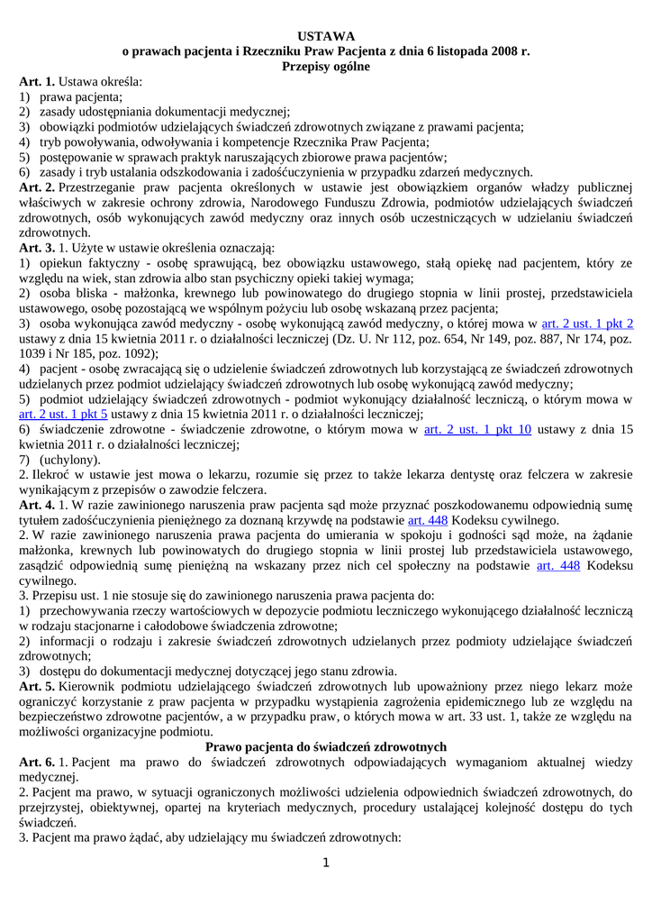 USTAWA o prawach pacjenta i Rzeczniku Praw Pacjenta z dnia 6 listopada 2008 r. Przepisy ogólne Art. 1. Ustawa określa: 1) prawa pacjenta; 2) zasady udostępniania dokumentacji medycznej; 3) obowiązki podmiotów udzielających świadczeń zdrowotnych związane z prawami pacjenta; 4) tryb powoływania, odwoływania i kompetencje Rzecznika Praw Pacjenta; 5) postępowanie w sprawach praktyk naruszających zbiorowe prawa pacjentów; 6) zasady i tryb ustalania odszkodowania i zadośćuczynienia w przypadku zdarzeń medycznych. Art. 2. Przestrzeganie praw pacjenta określonych w ustawie jest obowiązkiem organów władzy publicznej właściwych w zakresie ochrony zdrowia, Narodowego Funduszu Zdrowia, podmiotów udzielających świadczeń zdrowotnych, osób wykonujących zawód medyczny oraz innych osób uczestniczących w udzielaniu świadczeń zdrowotnych. Art. 3. 1. Użyte w ustawie określenia oznaczają: 1) opiekun faktyczny - osobę sprawującą, bez obowiązku ustawowego, stałą opiekę nad pacjentem, który ze względu na wiek, stan zdrowia albo stan psychiczny opieki takiej wymaga; 2) osoba bliska - małżonka, krewnego lub powinowatego do drugiego stopnia w linii prostej, przedstawiciela ustawowego, osobę pozostającą we wspólnym pożyciu lub osobę wskazaną przez pacjenta; 3) osoba wykonująca zawód medyczny - osobę wykonującą zawód medyczny, o której mowa w art. 2 ust. 1 pkt 2 ustawy z dnia 15 kwietnia 2011 r. o działalności leczniczej (Dz. U. Nr 112, poz. 654, Nr 149, poz. 887, Nr 174, poz. 1039 i Nr 185, poz. 1092); 4) pacjent - osobę zwracającą się o udzielenie świadczeń zdrowotnych lub korzystającą ze świadczeń zdrowotnych udzielanych przez podmiot udzielający świadczeń zdrowotnych lub osobę wykonującą zawód medyczny; 5) podmiot udzielający świadczeń zdrowotnych - podmiot wykonujący działalność leczniczą, o którym mowa w art. 2 ust. 1 pkt 5 ustawy z dnia 15 kwietnia 2011 r. o działalności leczniczej; 6) świadczenie zdrowotne - świadczenie zdrowotne, o którym mowa w art. 2 ust. 1 pkt 10 ustawy z dnia 15 kwietnia 2011 r. o działalności leczniczej; 7) (uchylony). 2. Ilekroć w ustawie jest mowa o lekarzu, rozumie się przez to także lekarza dentystę oraz felczera w zakresie wynikającym z przepisów o zawodzie felczera. Art. 4. 1. W razie zawinionego naruszenia praw pacjenta sąd może przyznać poszkodowanemu odpowiednią sumę tytułem zadośćuczynienia pieniężnego za doznaną krzywdę na podstawie art. 448 Kodeksu cywilnego. 2. W razie zawinionego naruszenia prawa pacjenta do umierania w spokoju i godności sąd może, na żądanie małżonka, krewnych lub powinowatych do drugiego stopnia w linii prostej lub przedstawiciela ustawowego, zasądzić odpowiednią sumę pieniężną na wskazany przez nich cel społeczny na podstawie art. 448 Kodeksu cywilnego. 3. Przepisu ust. 1 nie stosuje się do zawinionego naruszenia prawa pacjenta do: 1) przechowywania rzeczy wartościowych w depozycie podmiotu leczniczego wykonującego działalność leczniczą w rodzaju stacjonarne i całodobowe świadczenia zdrowotne; 2) informacji o rodzaju i zakresie świadczeń zdrowotnych udzielanych przez podmioty udzielające świadczeń zdrowotnych; 3) dostępu do dokumentacji medycznej dotyczącej jego stanu zdrowia. Art. 5. Kierownik podmiotu udzielającego świadczeń zdrowotnych lub upoważniony przez niego lekarz może ograniczyć korzystanie z praw pacjenta w przypadku wystąpienia zagrożenia epidemicznego lub ze względu na bezpieczeństwo zdrowotne pacjentów, a w przypadku praw, o których mowa w art. 33 ust. 1, także ze względu na możliwości organizacyjne podmiotu. Prawo pacjenta do świadczeń zdrowotnych Art. 6. 1. Pacjent ma prawo do świadczeń zdrowotnych odpowiadających wymaganiom aktualnej wiedzy medycznej. 2. Pacjent ma prawo, w sytuacji ograniczonych możliwości udzielenia odpowiednich świadczeń zdrowotnych, do przejrzystej, obiektywnej, opartej na kryteriach medycznych, procedury ustalającej kolejność dostępu do tych świadczeń. 3. Pacjent ma prawo żądać, aby udzielający mu świadczeń zdrowotnych: 1 1) lekarz zasięgnął opinii innego lekarza lub zwołał konsylium lekarskie; 2) pielęgniarka (położna) zasięgnęła opinii innej pielęgniarki (położnej). 4. Lekarz może odmówić zwołania konsylium lekarskiego lub zasięgnięcia opinii innego lekarza, jeżeli uzna, że żądanie, o którym mowa w ust. 3, jest bezzasadne. 5. Żądanie, o którym mowa w ust. 3, oraz odmowę, o której mowa w ust. 4, odnotowuje się w dokumentacji medycznej. 6. Przepisy ust. 4 i 5 stosuje się do pielęgniarki (położnej) w zakresie zasięgania opinii innej pielęgniarki (położnej). Art. 7. 1. Pacjent ma prawo do natychmiastowego udzielenia świadczeń zdrowotnych ze względu na zagrożenie zdrowia lub życia. 2. W przypadku porodu pacjentka ma prawo do uzyskania świadczeń zdrowotnych związanych z porodem. Art. 8. Pacjent ma prawo do świadczeń zdrowotnych udzielanych z należytą starannością przez podmioty udzielające świadczeń zdrowotnych w warunkach odpowiadających określonym w odrębnych przepisach wymaganiom fachowym i sanitarnym. Przy udzielaniu świadczeń zdrowotnych osoby wykonujące zawód medyczny kierują się zasadami etyki zawodowej określonymi przez właściwe samorządy zawodów medycznych. Prawo pacjenta do informacji Art. 9. 1. Pacjent ma prawo do informacji o swoim stanie zdrowia. 2. Pacjent, w tym małoletni, który ukończył 16 lat, lub jego ustawowy przedstawiciel mają prawo do uzyskania od lekarza przystępnej informacji o stanie zdrowia pacjenta, rozpoznaniu, proponowanych oraz możliwych metodach diagnostycznych i leczniczych, dających się przewidzieć następstwach ich zastosowania albo zaniechania, wynikach leczenia oraz rokowaniu. 3. Pacjent lub jego ustawowy przedstawiciel mają prawo do wyrażenia zgody na udzielenie informacji wymienionych w ust. 2 innym osobom. 4. Pacjent ma