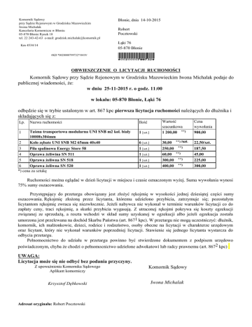 Komornik Sądowy przy Sądzie Rejonowym w Grodzisku Mazowieckim Iwona Michalak Kancelaria Komornicza w Błoniu 05-870 Błonie Rynek 18 tel. 22 243-42-63 e-mail: [email protected] Błonie, dnia 14-10-2015 Robert Pocztowski Łąki 76 05-870 Błonie Km 4534/14 *0020000799732* #KD *0020000799732*/0419/ OBWIESZCZENIE O LICYTACJI RUCHOMOŚCI Komornik Sądowy przy Sądzie Rejonowym w Grodzisku Mazowieckim Iwona Michalak podaje do publicznej wiadomości, że: w dniu 25-11-2015 r. o godz. 11:00 w lokalu: 05-870 Błonie, Łąki 76 odbędzie się w trybie ustalonym w art. 867 kpc pierwsza licytacja ruchomości należących do dłużnika i składających się z: Lp. Nazwa ruchomości Taśma transportowa modularna UNI SNB m2 kol. biały 10008x304mm 2 Koło zębate UNI SNB M2 65mm 40x40 3 Piła spalinowa Energy Store 58 4 Oprawa żeliwina SN 511 5 Oprawa żeliwna SN 518 6 Oprawa żeliwna SN 520 *) cena za sztukę 1 1 [szt.] Wartość szacunkowa 1 200,00 **) 6 [szt.] 1 [szt.] 1 [szt.] 1 [szt.] 1 [szt.] 30,00 250,00 60,00 300,00 400,00 Ilość **) /szt. **) **) **) **) Cena wywołania 900,00 22,50/szt. 187,50 45,00 225,00 300,00 Ruchomości można oglądać w dzień licytacji w miejscu i czasie oznaczonym wyżej. Suma wywołania wynosi 75% sumy oszacowania. Przystępujący do przetargu obowiązany jest złożyć rękojmię w wysokości jednej dziesiątej części sumy oszacowania. Rękojmię złożoną przez licytanta, któremu udzielono przybicia, zatrzymuje się; pozostałym licytantom rękojmię zwraca się niezwłocznie. Jeżeli nabywca nie wykonał w terminie warunków licytacji co do zapłaty ceny, traci rękojmię, a skutki przybicia wygasają. Z utraconej rękojmi pokrywa się koszty egzekucji związanej ze sprzedażą, a reszta wchodzi w skład sumy uzyskanej w egzekucji albo jeżeli egzekucja została umorzona jest przelewana na dochód Skarbu Państwa (art. 8671 kpc). W przetargu nie mogą uczestniczyć: dłużnik, komornik, ich małżonkowie, dzieci, rodzice i rodzeństwo, osoby obecne na licytacji w charakterze urzędowym oraz licytant, który nie wykonał warunków poprzedniej licytacji. Stawienie się jednego licytanta wystarcza do odbycia przetargu. Pełnomocnictwo do udziału w przetargu powinno być stwierdzone dokumentem z podpisem urzędowo poświadczonym, chyba że chodzi o pełnomocnictwo udzielone adwokatowi lub radcy prawnemu (art. 8672 kpc) UWAGA: Licytacja może się nie odbyć bez podania przyczyny. Z upoważnienia Komornika Sądowego Aplikant komorniczy Komornik Sądowy Krzysztof Dębkowski Iwona Michalak Adresat oryginału: Robert Pocztowski Do wiadomości: 1. Radca Prawny Agata Krakowińska, 90-503 Łódź 2. Robert Pocztowski, 05-870 Błonie 3. Sąd Rejonowy w Grodzisku Maz. Wydział Administracyjny, 05-825 Grodzisk Mazowiecki 4. Urząd Miejski w Błoniu Wydział Administracyjny, 05-870 Błonie 5. a/a
