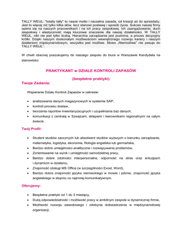 TALLY WEIJL: "totally tally" to nasze motto i naczelna zasada, od kreacji aż do sprzedaży. Jest to więcej niż tylko kilka słów, lecz stanowi postawę i sposób życia. Sukces naszej firmy opiera się na naszych pracownikach i na ich pracy zespołowej. Ich zaangażowanie, duch zespołowy i elastyczność mają kluczowe znaczenie dla naszej działalności. W TALLY WEiJL, nikt nie jest tylko liczbą. Hierarchia zarządzania jest pozioma, a proces decyzyjny krótki. Dzięki naszym doskonałym możliwościom wewnętrznego rozwoju kariery i naszym działaniom międzynarodowym, wszystko jest możliwe. Słowo „Niemożliwe” nie pasuje do TALLY WEiJL”. W chwili obecnej poszukujemy do naszego zespołu do biura w Warszawie Kandydata na stanowisko: PRAKTYKANT w DZIALE KONTROLI ZAPASÓW (bezpłatne praktyki) Twoje Zadania: Wspieranie Działu Kontroli Zapasów w zakresie: analizowania danych magazynowych w systemie SAP, kontroli procesu dostaw, tworzenia raportów inwentaryzacyjnych i uzupełniania baz danych, komunikacji z centralą w Szwajcarii, sklepami i kierownikami regionalnymi na całym świecie. Twój Profil: Student studiów zaocznych lub absolwent studiów wyższych o kierunku zarządzanie, matematyka, logistyka, ekonomia, filologia angielska lub germańska, Bardzo dobre umiejętności analityczne i rozwiązywania problemów, Zorientowanie na wynik i umiejętność samodzielnej pracy, Bardzo dobre zdolności interpersonalne, odporność na stres oraz entuzjazm i dynamizm w działaniu, Znajomość obsługi MS Office (w szczególności Excel, Word), Bardzo dobra znajomość języka niemieckiego w mowie i piśmie, znajomość języka angielskiego w stopniu co najmniej komunikatywnym. Oferujemy: Bezpłatne praktyki od 1 do 3 miesięcy, Dużą odpowiedzialność i możliwość pracy w ambitnym zespole w dynamicznej firmie, Możliwość rozwoju zawodowego i zdobycia doświadczenia w międzynarodowej organizacji, Biuro w centrum Warszawy, Referencje po zakończeniu współpracy. Osoby zainteresowane prosimy o przesłanie CV i listu motywacyjnego wyłącznie w języku angielskim na adres e-mail: [email protected] w terminie do 14 dni od daty ukazania się ogłoszenia z dopiskiem: Praktykant w Dziale Kontroli Zapasów "Wyrażam zgodę na przetwarzanie moich danych osobowych zawartych w ofercie pracy dla potrzeb procesu rekrutacji zgodnie z ustawą z dnia 27.08.1997r. Dz. U. z 2002 r., Nr 101, poz. 923 ze zm." Uprzejmie informujemy, że odpowiemy tylko na wybrane aplikacje. Więcej naszych ofert znajduje się na www.tally-weijl.com
