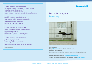 Już dziś możemy zacząć od nowa, gdy się uspokoimy, wsłuchamy w nasze wnętrze, dostrzeżemy nasze życzenia, nasze potrzeby, zauważymy co jest ważne i istotne. Już dziś możemy zacząć od nowa, gdy ruszymy sobie nawzajem naprzeciw, gdy pokażemy jacy jesteśmy: Silni ale i podatni na zranienia. Diakonia na wynos Źródła siły Już dziś możemy zacząć od nowa, kiedy uzmysłowimy sobie nasze życzenia, wypowiemy potrzeby zdamy sobie sprawę z naszych granic. Już dziś możemy zacząć od nowa, jeśli uwierzymy w siebie weźmiemy siebie na poważnie i pozwolimy rosnąć temu, co w nas zaczęte. Dziwne zdjęcie: Niczym Superman chce on lecieć i ratować świat. Ale mu się nie powiedzie. On przecież nie leci, tylko leży na dwóch słupkach, które go podtrzymują. Max Feigenwinter Jesteśmy zdani na sensowne „systemy podtrzymujące“. Aby żyć, potrzebujemy czegoś, co nas wzmocni i doda nowej energii. Diakonia na wynos Pastorin Birgit Berg, [email protected] Diakonia Źródła siły Szczególnie praca w zawodach opiekuńczych i pielęgniarskich jest bardzo stresująca. Biega się „wokół własnego ogona“ ryzykując całkowite wyczerpanie. Gdy zabraknie sił, ciało i duch wysyłają sygnały ostrzegawcze: wówczas czuję niezadowolenie, jestem często zdenerwowany, niecierpliwy, wyczerpany, chory. Żeby do tego nie doszło muszę uważać na równowagę pomiędzy dawaniem i braniem: Dobrzy przyjaciele i bliscy mogą dodać siły. Nowego zapału doznają ci, którzy są aktywni, uprawiają sport i poświęcają trochę czasu na swoje zainteresowania. Wiara może być także źródłem mocy. Wiara nadaje sens i obdarza spokojem. W zaufaniu do Boga łatwiej jest pokonywać trudne sytuacje. Wypocząć i nabrać nowych sił. Jakże to ważne! Potrzebujemy czegoś, co nas wzmocni i doda nowej energii. Czym są moje źródła sił, moje zasoby? Do osobistych zasobów należą: wiedza, zdolność do refleksji, zdrowe poczucie własnej wartości, pozytywne spojrzenie na świat, socjalne kompetencje, zdolności\hobby\zaintersowania, pozytywne wspomnienia, przekonania religijne, inne szczególne zalety. Do fizycznych zasobów zalicza się: stabilną kondycję, dobrą sprawność ruchową, wartości wymierne jak dobre wyniki czy ciśnienie krwi… Materialne zasoby to: pieniądze, dobra, usługi. Socjalne zasoby to: rodzina, przyjaciele, sąsiedzi, itp., zwierzęta i stabilna sieć kontaktów międzyludzkich. E Z których źródeł korzystam? E Jakie źródła chciałbym ożywić? Jak źródła wody ożywiają suchą ziemię, tak własne zasoby wzmacniają nasze życie. O tym mówią pierwsze strony Biblii: Ważnym jest by: Bóg odpoczął dnia siódmego po całym swym trudzie, jaki podjął. Wtedy Bóg pobłogosławił ów siódmy dzień i uczynił go świętym; w tym bowiem dniu »Kochać bliźniego swego jak siebie samego.« (Biblia) odpoczął po całej swej pracy, którą wykonał stwarzając. 1 Rodz. 2, następne. Diakonia na wynos Pastorin Birgit Berg, [email protected]