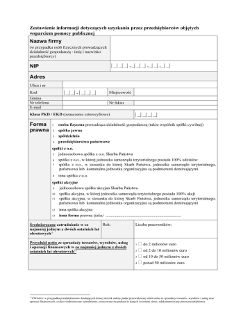 Zestawienie informacji dotyczących uzyskania przez przedsiębiorców objętych wsparciem pomocy publicznej Nazwa firmy (w przypadku osób fizycznych prowadzących działalność gospodarczą - imię i nazwisko przedsiębiorcy) --- NIP Adres Ulica i nr - Kod Gmina Nr telefonu E-mail Miejscowość Nr faksu Klasa PKD / EKD (oznaczenie czterocyfrowe) Forma prawna 1 2 3 4 osoba fizyczna prowadząca działalność gospodarczą (także wspólnik spółki cywilnej) spółka jawna spółdzielnia przedsiębiorstwo państwowe spółki z o.o. 5 jednoosobowa spółka z o.o. Skarbu Państwa 6 spółka z o.o., w której jednostka samorządu terytorialnego posiada 100% udziałów 7 spółka z o.o., w stosunku do której Skarb Państwa, jednostka samorządu terytorialnego, państwowa lub komunalna jednostka organizacyjna są podmiotami dominującymi 8 inna spółka z o.o. spółki akcyjne 9 jednoosobowa spółka akcyjna Skarbu Państwa 10 spółka akcyjna, w której jednostka samorządu terytorialnego posiada 100% akcji 11 spółka akcyjna, w stosunku do której Skarb Państwa, jednostka samorządu terytorialnego, państwowa lub komunalna jednostka organizacyjna są podmiotami dominującymi 12 13 inna spółka akcyjna inna forma prawna (jaka) ........................................................................ Rok: Średnioroczne zatrudnienie w co najmniej jednym z dwóch ostatnich lat obrotowych1) Przychód netto ze sprzedaży towarów, wyrobów, usług i operacji finansowych w co najmniej jednym z dwóch ostatnich lat obrotowych1) 1 Liczba pracowników: do 2 milionów euro 2 od 2 do 10 milionów euro 3 od 10 do 50 milionów euro 4 ponad 50 milionów euro 1 UWAGA: w przypadku przedsiębiorców działających krócej niż rok należy podać przewidywany obrót netto ze sprzedaży towarów, wyrobów i usług oraz operacji finansowych, a także średnioroczne zatrudnienie, oszacowane na podstawie danych za ostatni okres, udokumentowany przez przedsiębiorcę. Suma aktywów bilansu na koniec jednego z dwóch ostatnich lat obrotowych 1 0-2 mln euro 2 2- 10 mln euro 3 10- 43 mln euro 4 ponad 43 mln euro Czy inni przedsiębiorcy, Skarb Państwa oraz jednostki samorządu terytorialnego posiadają w Państwa firmie: (1) 25% i więcej wkładów, udziałów lub akcji, lub (2) prawo do 25% i więcej udziału w zysku, lub (3) 25% i więcej głosów w zgromadzeniu wspólników, walnym zgromadzeniu akcjonariuszy albo walnym zgromadzeniu spółdzielni Forma opodatkowania Data (dd-mm-rr) (data podpisania umowy-zgłoszenia) tak 2 nie 1 ryczałt 2 zasady ogólne – podatek od osób fizycznych 3 karta 4 podatek od osób prawnych 1 - - Tytuł szkolenia Rodzaj szkolenia Imiona i nazwiska pracowników, którzy skorzystali ze szkolenia w ramach projektu Liczba pracowników w gorszym położeniu, którzy skorzystali ze szkolenia w ramach projektu X ogólne specjalistyczne 1. ........................................................................................ 2. ........................................................................................ 3. ........................................................................................ 4. ........................................................................................ 5. ........................................................................................ 6. ........................................................................................ 7. ........................................................................................ 8. ........................................................................................ 9. ........................................................................................ 10......................................................................................... nie dotyczy Kwota otrzymanej pomocy publicznej w postaci usługi szkoleniowej zrealizowanej w ramach projektu2) Procentowa wysokość otrzymanej pomocy publicznej z tytułu szkolenia jednej osoby3) (osobno należy podać procentową wysokość otrzymanej pomocy publicznej z tytułu szkolenia pracowników w gorszym położeniu – nie dotyczy) Pracownik w gorszym położeniu nie dotyczy ..............% ................% Podpis osoby uprawnionej do reprezentowania przedsiębiorstwa Data i miejsce sporządzenia formularza 2) Informację o kwocie otrzymanej pomocy publicznej przedsiębiorca uzyskuje od Beneficjenta. Prosimy wpisać tu różnicę pomiędzy jednostkową ceną szkolenia 100% a kwotą, którą Przedsiębiorca zapłaci (20% ceny szkolenia pomnożoną przez liczbę zgłaszanych osób). 3) 80%