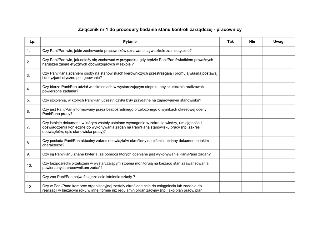 Załącznik nr 1 do procedury badania stanu kontroli zarządczej - pracownicy Lp. Pytanie 1. Czy Pani/Pan wie, jakie zachowania pracowników uznawane są w szkole za nieetyczne? 2. Czy Pani/Pan wie, jak należy się zachować w przypadku, gdy będzie Pani/Pan świadkiem poważnych naruszeń zasad etycznych obowiązujących w szkole ? 3. Czy Pani/Pana zdaniem osoby na stanowiskach kierowniczych przestrzegają i promują własną postawą i decyzjami etyczne postępowanie? 4. Czy bierze Pani/Pan udział w szkoleniach w wystarczającym stopniu, aby skutecznie realizować powierzone zadania? 5. Czy szkolenia, w których Pani/Pan uczestniczył/a były przydatne na zajmowanym stanowisku? 6. Czy jest Pani/Pan informowany przez bezpośredniego przełożonego o wynikach okresowej oceny Pani/Pana pracy? 7. Czy istnieje dokument, w którym zostały ustalone wymagania w zakresie wiedzy, umiejętności i doświadczenia konieczne do wykonywania zadań na Pani/Pana stanowisku pracy (np. zakres obowiązków, opis stanowiska pracy)? 8. Czy posiada Pani/Pan aktualny zakres obowiązków określony na piśmie lub inny dokument o takim charakterze? 9. Czy są Pani/Panu znane kryteria, za pomocą których oceniane jest wykonywanie Pani/Pana zadań? 10. Czy bezpośredni przełożeni w wystarczającym stopniu monitorują na bieżąco stan zaawansowania powierzonych pracownikom zadań? 11. Czy zna Pani/Pan najważniejsze cele istnienia szkoły ? 12. Czy w Pani/Pana komórce organizacyjnej zostały określone cele do osiągnięcia lub zadania do realizacji w bieżącym roku w innej formie niż regulamin organizacyjny (np. jako plan pracy, plan Tak Nie Uwagi działalności itp.)? 13. Czy cele i zadania Pani/Pana komórki organizacyjnej na bieżący rok mają określone mierniki, wskaźniki bądź inne kryteria, za pomocą których można sprawdzić, czy cele i zadania zostały zrealizowane? – należy odpowiedzieć tylko w przypadku, gdy odpowiedź na pytanie nr 12 brzmi TAK 14. Czy w Pani/Pana komórce organizacyjnej w udokumentowany sposób identyfikuje się zagrożenia/ryzyka, które mogą przeszkodzić w realizacji celów i zadań komórki (np. poprzez sporządzanie rejestru ryzyka lub innego dokumentu zawierającego zidentyfikowane zagrożenia/ryzyka)? 15. Czy wśród zidentyfikowanych zagrożeń/ryzyk wskazuje się zagrożenia/ryzyka istotne, które w znaczący sposób mogą przeszkodzić w realizacji celów i zadań? 16. Czy w Pani/Pana komórce organizacyjnej podejmuje się wystarczające działania mające na celu ograniczenie zidentyfikowanych zagrożeń/ryzyk, w szczególności tych istotnych? 17. Czy posiada Pani/Pan bieżący dostęp do procedur/instrukcji obowiązujących w szkole (np. poprzez intranet)? 18. Czy w wystarczającym stopniu sposób realizacji zadań w Pani/Pana komórce organizacyjnej jest określony w pisemnych procedurach/instrukcjach? 19. Czy obowiązujące Panią/Pana procedury/instrukcje są aktualne, tzn. zgodne z obowiązującymi przepisami prawa i regulacjami wewnętrznymi (np. regulaminem organizacyjnym, innymi procedurami)? 20. Czy nadzór ze strony przełożonych zapewnia skuteczną realizację zadań? 21. Czy wie Pani/Pan, jak postępować w przypadku wystąpienia sytuacji nadzwyczajnej, np. pożaru, powodzi, poważnej awarii? 22. Czy dokumenty/materiały/zasoby informatyczne, z których korzysta Pani/Pan w swojej pracy, są Pani/Pana zdaniem odpowiednio chronione przed utratą lub zniszczeniem? 23. Czy ma Pani/Pan dostęp do wszystkich informacji i danych niezbędnych do realizacji swoich zadań? 24. Czy postawa osób na stanowiskach kierowniczych zachęca pracowników do sygnalizowania problemów i zagrożeń w realizacji zadań? 25. Czy w przypadku wystąpienia trudności w realizacji zadań zwraca się Pani/Pan w pierwszej kolejności do bezpośredniego przełożonego z prośbą o pomoc? 26. Czy Pani/Pana zdaniem istnieje sprawny przepływ informacji wewnątrz Pani/Pana komórki organizacyjnej? 27. Czy Pani/Pana zdaniem istnieje sprawny przepływ informacji pomiędzy poszczególnymi komórkami organizacyjnymi w szkole? 28. Czy zna Pani/Pan zasady kontaktów pracowników szkoły z podmiotami zewnętrznymi (np.: wnioskodawcami, dostawcami, oferentami) i swoje uprawnienia w tym zakresie? 29. Czy Pani/Pana komórka organizacyjna utrzymuje dobre kontakty z podmiotami zewnętrznymi, które mają wpływ na realizację jej zadań (np.: z innymi urzędami, dostawcami, klientami)? 30. Czy przełożeni na co dzień zwracają wystarczającą uwagę na przestrzeganie przez pracowników obowiązujących w szkole zasad, procedur, instrukcji itp.? Wyjaśnienie: • komórka organizacyjna – podstawowa komórka organizacyjna w szkole.
