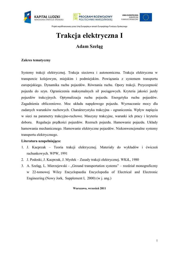 Projekt współfinansowany przez Unię Europejską w ramach Europejskiego Funduszu Społecznego Trakcja elektryczna I Adam Szeląg Zakres tematyczny Systemy trakcji elektrycznej. Trakcja sieciowa i autonomiczna. Trakcja elektryczna w transporcie kolejowym, miejskim i podmiejskim. Powiązania z systemem transportu europejskiego. Dynamika ruchu pojazdów. Równania ruchu. Opory trakcji. Przyczepność pojazdu do szyn. Ograniczenia maksymalnych sił pociągowych. Kryteria jakości jazdy pojazdów trakcyjnych. Optymalizacja ruchu pojazdu. Energetyka ruchu pojazdów. Zagadnienia obliczeniowe. Moc układu napędowego pojazdu. Wyznaczanie mocy dla zadanych warunków ruchowych. Charakterystyka trakcyjna - ograniczenia. Wpływ napięcia w sieci na parametry trakcyjno-ruchowe. Maszyny trakcyjne, warunki ich pracy i kryteria doboru. Regulacja prędkości pojazdów. Rozruch pojazdu. Hamowanie pojazdu. Układy hamowania mechanicznego. Hamowanie elektryczne pojazdów. Niekonwencjonalne systemy transportu elektrycznego. Literatura uzupełniająca: 1. J. Kacprzak – Teoria trakcji elektrycznej. Materiały do wykładów i ćwiczeń rachunkowych. WPW, 1991 2. J. Podoski, J. Kacprzak, J. Mysłek – Zasady trakcji elektrycznej. WKiŁ, 1980 3. A. Szeląg, L. Mierzejewski - „Ground transportation systems” – rozdział monograficzny w 22-tomowej Wiley Encyclopaedia Encyclopedia of Electrical and Electronic Engineering (Nowy Jork, Supplement I, 2000) (w j. ang.) Warszawa, wrzesień 2011 1 Projekt współfinansowany przez Unię Europejską w ramach Europejskiego Funduszu Społecznego SPIS TREŚCI 1. Wstęp .................................................................................................................................................. 3 2. Rola transportu szynowego w gospodarce integrującej się Europy ............................................. 4 3. Rys historyczny................................................................................................................................ 10 4. Zalety trakcji elektrycznej...............................................................................................................14 5. Ruch pojazdu ................................................................................................................................... 22 5.1 Równania ruchu. ......................................................................................................................................... 23 5.2 Opory ruchu ................................................................................................................................................ 25 5.3 Ograniczenia siły pociągowej . ................................................................................................................... 27 5.4. Fazy ruchu pojazdu trakcyjnego: ............................................................................................................... 37 6. Silniki trakcyjne .............................................................................................................................. 43 6.1 Wymagania stawiane silnikom trakcyjnym................................................................................................. 43 6.2 Charakterystyki silnika szeregowego prądu stałego.................................................................................... 45 6.3 Silniki prądu przemiennego ........................................................................................................................ 56 6.4 Przeniesienie momentu z silnika na koła pojazdu.................................................................................. 60 7. Pojazdy trakcyjne............................................................................................................................ 68 7.1 Podstawowe dane lokomotyw elektrycznych.............................................................................................. 72 7.2 .Elektryczne zespoły trakcyjne.................................................................................................................... 79 7.4 Pociągi TGV ............................................................................................................................................... 87 7.5 Tramwaje elektryczne. ................................................................................................................................ 95 7.7. Tabor metra .............................................................................................................................................. 104 7.8 Trakcja autonomiczna ............................................................................................................................... 110 7.9. Pojazdy niekonwencjonalne - maglev ...................................................................................................... 115 2