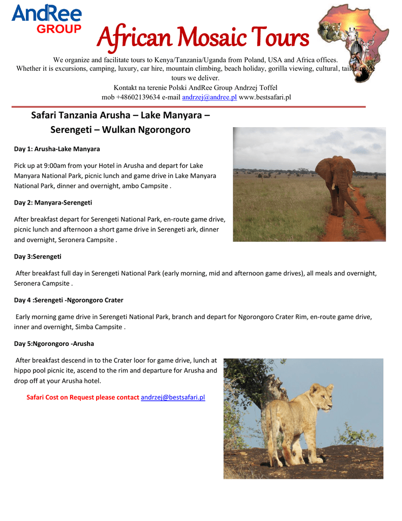 African Mosaic Tours We organize and facilitate tours to Kenya/Tanzania/Uganda from Poland, USA and Africa offices. Whether it is excursions, camping, luxury, car hire, mountain climbing, beach holiday, gorilla viewing, cultural, tailor-made tours we deliver. Kontakt na terenie Polski AndRee Group Andrzej Toffel mob +48602139634 e-mail [email protected] www.bestsafari.pl Safari Tanzania Arusha – Lake Manyara – Serengeti – Wulkan Ngorongoro Day 1: Arusha-Lake Manyara Pick up at 9:00am from your Hotel in Arusha and depart for Lake Manyara National Park, picnic lunch and game drive in Lake Manyara National Park, dinner and overnight, ambo Campsite . Day 2: Manyara-Serengeti After breakfast depart for Serengeti National Park, en-route game drive, picnic lunch and afternoon a short game drive in Serengeti ark, dinner and overnight, Seronera Campsite . Day 3:Serengeti After breakfast full day in Serengeti National Park (early morning, mid and afternoon game drives), all meals and overnight, Seronera Campsite . Day 4 :Serengeti -Ngorongoro Crater Early morning game drive in Serengeti National Park, branch and depart for Ngorongoro Crater Rim, en-route game drive, inner and overnight, Simba Campsite . Day 5:Ngorongoro -Arusha After breakfast descend in to the Crater loor for game drive, lunch at hippo pool picnic ite, ascend to the rim and departure for Arusha and drop off at your Arusha hotel. Safari Cost on Request please contact [email protected]