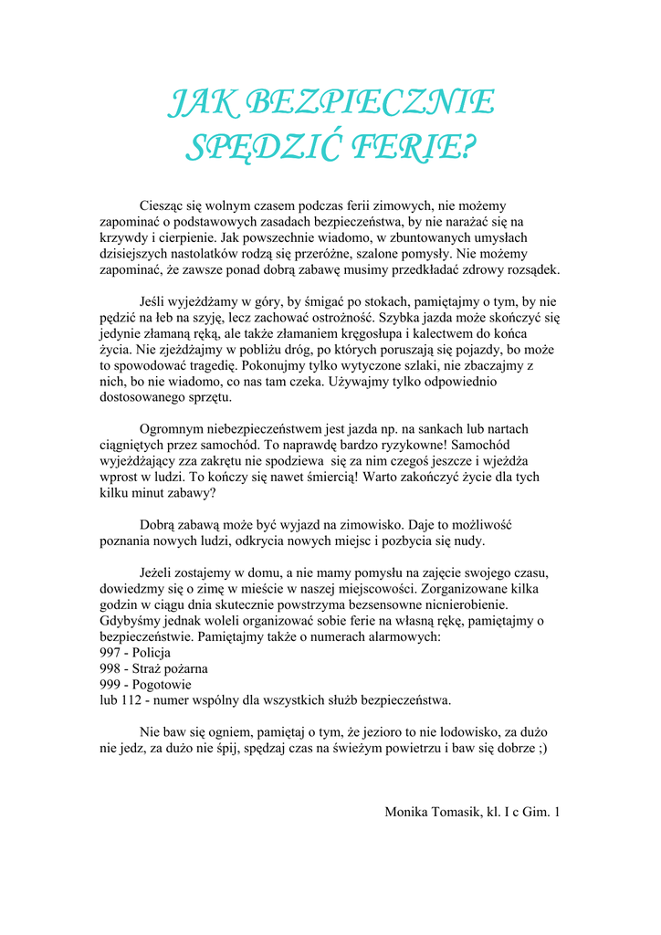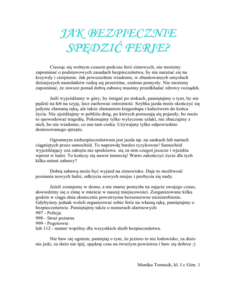 JAK BEZPIECZNIE SPĘ SPĘDZIĆ DZIĆ FERIE? Ciesząc się wolnym czasem podczas ferii zimowych, nie moŜemy zapominać o podstawowych zasadach bezpieczeństwa, by nie naraŜać się na krzywdy i cierpienie. Jak powszechnie wiadomo, w zbuntowanych umysłach dzisiejszych nastolatków rodzą się przeróŜne, szalone pomysły. Nie moŜemy zapominać, Ŝe zawsze ponad dobrą zabawę musimy przedkładać zdrowy rozsądek. Jeśli wyjeŜdŜamy w góry, by śmigać po stokach, pamiętajmy o tym, by nie pędzić na łeb na szyję, lecz zachować ostroŜność. Szybka jazda moŜe skończyć się jedynie złamaną ręką, ale takŜe złamaniem kręgosłupa i kalectwem do końca Ŝycia. Nie zjeŜdŜajmy w pobliŜu dróg, po których poruszają się pojazdy, bo moŜe to spowodować tragedię. Pokonujmy tylko wytyczone szlaki, nie zbaczajmy z nich, bo nie wiadomo, co nas tam czeka. UŜywajmy tylko odpowiednio dostosowanego sprzętu. Ogromnym niebezpieczeństwem jest jazda np. na sankach lub nartach ciągniętych przez samochód. To naprawdę bardzo ryzykowne! Samochód wyjeŜdŜający zza zakrętu nie spodziewa się za nim czegoś jeszcze i wjeŜdŜa wprost w ludzi. To kończy się nawet śmiercią! Warto zakończyć Ŝycie dla tych kilku minut zabawy? Dobrą zabawą moŜe być wyjazd na zimowisko. Daje to moŜliwość poznania nowych ludzi, odkrycia nowych miejsc i pozbycia się nudy. JeŜeli zostajemy w domu, a nie mamy pomysłu na zajęcie swojego czasu, dowiedzmy się o zimę w mieście w naszej miejscowości. Zorganizowane kilka godzin w ciągu dnia skutecznie powstrzyma bezsensowne nicnierobienie. Gdybyśmy jednak woleli organizować sobie ferie na własną rękę, pamiętajmy o bezpieczeństwie. Pamiętajmy takŜe o numerach alarmowych: 997 - Policja 998 - StraŜ poŜarna 999 - Pogotowie lub 112 - numer wspólny dla wszystkich słuŜb bezpieczeństwa. Nie baw się ogniem, pamiętaj o tym, Ŝe jezioro to nie lodowisko, za duŜo nie jedz, za duŜo nie śpij, spędzaj czas na świeŜym powietrzu i baw się dobrze ;) Monika Tomasik, kl. I c Gim. 1