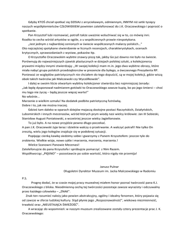 Gdyby KTOŚ chciał spotkać się DZISIAJ z arcyciekawym, odmiennym, INNYM niż setki tysięcy naszych współplemieńców CZŁOWIEKIEM powinien zatelefonować do J.K. Oraczewskiego i poprosić o spotkanie. Pan Krzysztof lubi rozmawiać, potrafi także uważnie wsłuchiwać się w to, co mówią inni. Rzadka to cecha wśród artystów w ogóle, a u współczesnych prawie niespotykana. „Jest jednym z najbardziej cenionych w świecie współczesnych malarzy polskich…” Oto najczęściej spotykane stwierdzenie w licznych recenzjach, charakterystykach, ocenach krytycznych, sprawozdaniach z wystaw, pokazów itp. O Krzysztofie Oraczewskim wybitni znawcy piszą tak, jakby Go już dawno nie było na świecie. Porównują do najważniejszych zjawisk plastycznych w dziejach polskiej sztuki, a kolekcjonerzy prywatni między innymi stwierdzają: „W swojej kolekcji mam m.in. jego dwa wybitne obrazy, które miała nabyć grupa polskich przedsiębiorców w prezencie dla byłego, a ówczesnego Prezydenta RP. Ponieważ ze względów patriotycznych nie chciałem do tego dopuścić, są w mojej kolekcji, gdzie wiszą obok takich twórców jak Malczewski czy Wyczółkowski”. I dalej w swoim liście otwartym wybitny kolekcjoner stwierdza bez najmniejszej żenady: „Jak będę dysponował nadmiarem gotówki to Oraczewskiego zawsze kupię, bo po jego śmierci – choć mu tego nie życzę – będą jeszcze więcej warte!” No właśnie… Marzenie o wielkim szmalu! Na dodatek podbite patriotyczną futrówką. Dobre i to, jak nie można inaczej. Gdzieś tam daleko w oparach dziejów majaczą dostojne postaci Raczyńskich, Działyńskich, Lubomirskich i innych mecenasów, wśród których prym wiodą nasi wielcy królowie: Jan III Sobieski, Stanisław August Poniatowski, a wcześniej jeszcze wielcy Jagiellonowie. To już było. A na nowe przyjdzie pewno długo poczekać. A pan J.K. Oraczewski żyje teraz i dzielnie walczy o przetrwanie. A walczyć potrafi! Nie tylko On zresztą, wielu jego kolegów znajduje się w podobnej sytuacji. Popijając cienką kawkę siedzimy sobie i gwarzymy z Panem Krzysztofem: jeszcze tyle do zrobienia. Wielkie wizje, nowe cykle i marzenia, marzenia, marzenia.! Wielce Szanowni Panowie Mecenasi! Zatelefonujcie do pana Krzysztofa i spróbujcie pomarzyć z Nim Razem. Współtworząc „PIĘKNO” – pozostawcie po sobie wartość, która nigdy nie przemija! Janusz Pulnar Długoletni Dyrektor Muzeum im. Jacka Malczewskiego w Radomiu P.S. Pragnę dodać, że w czasie mojej pracy muzealnej miałem honor poznać twórczość pana K.J. Oraczewskiego z bliska. Nieodmienną cechą tej twórczości pozostaje zawsze wyrazisty i odczuwalny przez każdego człowieka – „ZNAK”. Znak ten rozumieć należy jako pewien abstrakcyjny, ogólny i idealny fenomen, który pojawia się od zawsze w sferze ludzkiej kultury. Stąd płynie jego „Rozpoznawalność”, wiekowa niezmienność, trwałość oraz „NIEUSTAJĄCA ŚWIEŻOŚĆ”. A wracając do wspomnień: w naszym muzeum zrealizowane zostały cztery prezentacje prac J. K. Oraczewskiego: 1. „Ostatnia wieczerza” organizowana wspólnie z wybitnym artystą niemieckim, panem Andreasem von Weitzelzerem; 2. „Chasydzi”; 3.”Drzewo życia”; mająca później wiele prezentacji międzynarodowych. 3. „Krucyfiks”, który otwierał i zapowiadał jednocześnie wielką wystawę milenijną (2000 r.); prezentowana była na Zamku Królewskim w Warszawie i na Jasnej Górze. Każda z tych wystaw była zarówno wielkim doznaniem estetycznym, jak również niezapomnianym przeżyciem intelektualnym. Janusz Pulnar