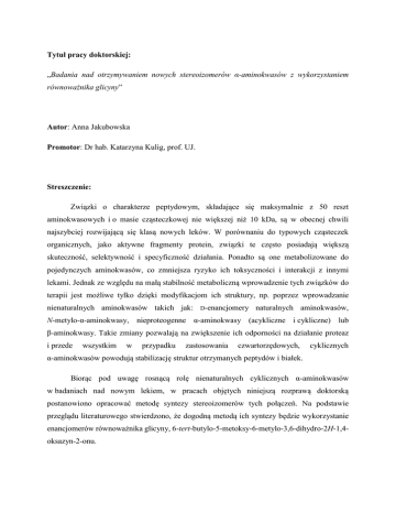 Tytuł pracy doktorskiej: „Badania nad otrzymywaniem nowych stereoizomerów α-aminokwasów z wykorzystaniem równoważnika glicyny” Autor: Anna Jakubowska Promotor: Dr hab. Katarzyna Kulig, prof. UJ. Streszczenie: Związki o charakterze peptydowym, składające się maksymalnie z 50 reszt aminokwasowych i o masie cząsteczkowej nie większej niż 10 kDa, są w obecnej chwili najszybciej rozwijającą się klasą nowych leków. W porównaniu do typowych cząsteczek organicznych, jako aktywne fragmenty protein, związki te często posiadają większą skuteczność, selektywność i specyficzność działania. Ponadto są one metabolizowane do pojedynczych aminokwasów, co zmniejsza ryzyko ich toksyczności i interakcji z innymi lekami. Jednak ze względu na małą stabilność metaboliczną wprowadzenie tych związków do terapii jest możliwe tylko dzięki modyfikacjom ich struktury, np. poprzez wprowadzanie nienaturalnych aminokwasów takich jak: D-enancjomery naturalnych aminokwasów, N-metylo-α-aminokwasy, nieproteogenne α-aminokwasy (acykliczne i cykliczne) lub β-aminokwasy. Takie zmiany pozwalają na zwiększenie ich odporności na działanie proteaz i przede wszystkim w przypadku zastosowania czwartorzędowych, cyklicznych α-aminokwasów powodują stabilizację struktur otrzymanych peptydów i białek. Biorąc pod uwagę rosnącą rolę nienaturalnych cyklicznych α-aminokwasów w badaniach nad nowym lekiem, w pracach objętych niniejszą rozprawą doktorską postanowiono opracować metodę syntezy stereoizomerów tych połączeń. Na podstawie przeglądu literaturowego stwierdzono, że dogodną metodą ich syntezy będzie wykorzystanie enancjomerów równoważnika glicyny, 6-tert-butylo-5-metoksy-6-metylo-3,6-dihydro-2H-1,4oksazyn-2-onu. Pierwszy etap realizacji badań obejmował optymalizację syntezy enancjomerów równoważnika glicyny (1). W ramach tej części badań skalę syntezy podniesiono czterokrotnie w porównaniu do literaturowej. Ponadto do syntezy równoważnika glicyny użyto zsyntetyzowanych pochodnych odczynnika Mukaiyamy zaczepionych na fazie stałej lub na rozpuszczalnych polimerach. Następnie postanowiono zbadać możliwość zastosowania równoważnika glicyny w reakcji jednoczesnego bis-alkilowania. W badaniach tych jako czynniki alkilujące zastosowano związki o charakterze bis-elektrofili. Były to: związki łączące w swojej strukturze fragment pochodzący od siarczanu(IV) lub (VI) i halogenopochodnej, związki stanowiące pochodne cyklicznych siarczanów(IV) lub (VI). Realizacja tej części badań zaowocowała otrzymaniem grupy 14 pochodnych, w większości nieopisanych do tej pory w literaturze. Ponadto dla większości związków opracowano metodę otrzymania ich enancjomerów. Na kolejnym etapie badań zsyntetyzowane bis-elektrofile zostały użyte w reakcji alkilowania równoważnika glicyny. Reakcje te prowadzono w bezwodnym THF-ie, stosując jako zasady: NaHMDS i t-BuP4. Otrzymane pochodne spiranowe zostały poddane szczegółowej analizie fizykochemicznej mającej na celu wyznaczenie ich konfiguracji absolutnej. Określono zależności pomiędzy strukturą przestrzenną substratów i produktów. Zaproponowano etapy alkilowania równoważnika glicyny za pomocą enancjomerów tlenku 4-(2-jodoetylo)-1,3,2-dioksotiolanu. Ponadto za pomocą metod modelowania molekularnego wyjaśniono stereochemię reakcji alkilowania równoważnika glicyny przy użyciu ditlenku (R)-4-chlorometylo-1,3,2-dioksotiolanu. Na postawie analizy otrzymanych wyników wykazano, że na konfigurację przestrzenną spiranowego atomu węgla otrzymanych produktów alkilacji w zależności od stosowanych reagentów ma wpływ nie tylko konfiguracja równoważnika glicyny, ale również konfiguracja czynników alkilujących. Końcowym etapem przeprowadzonych prac było opracowanie warunków hydrolizy produktów alkilacji. W wyniku tych prac otrzymano pochodne enancjomerów następujących cyklicznych aminokwasów: karboksylowego. kwasu 1-aminocyklopropano- i 1-aminocyklopenatano-
