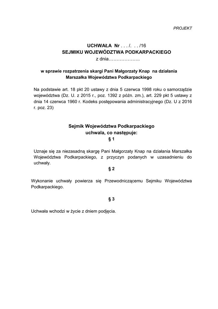PROJEKT UCHWAŁA Nr . . . /. . . /16 SEJMIKU WOJEWÓDZTWA PODKARPACKIEGO z dnia……………….. w sprawie rozpatrzenia skargi Pani Małgorzaty Knap na działania Marszałka Województwa Podkarpackiego Na podstawie art. 18 pkt 20 ustawy z dnia 5 czerwca 1998 roku o samorządzie województwa (Dz. U. z 2015 r., poz. 1392 z późn. zm.), art. 229 pkt 5 ustawy z dnia 14 czerwca 1960 r. Kodeks postępowania administracyjnego (Dz. U z 2016 r. poz. 23) Sejmik Województwa Podkarpackiego uchwala, co następuje: §1 Uznaje się za niezasadną skargę Pani Małgorzaty Knap na działania Marszałka Województwa Podkarpackiego, z przyczyn podanych w uzasadnieniu do uchwały. §2 Wykonanie uchwały powierza się Przewodniczącemu Sejmiku Województwa Podkarpackiego. §3 Uchwała wchodzi w życie z dniem podjęcia. UZASADNIENIE W dniu 18.02.2016 do Kancelarii Sejmiku wpłynęła skarga Pani Małgorzata Knap zam. Targowiska ul. A. Krajowej 25 , Miejsce Piastowe 38-430 na działania Pana Władysława Ortyla Marszałka Województwa Podkarpackiego polegające na podaniu fałszywych informacji na Jej temat w piśmie z dnia 01.02.2016 r. znak: RGII.1510.1.2016.EL skierowanym do pana Stanisława Ożoga Posła do Parlamentu Europejskiego, w zakresie tytułu prawnego jaki miała (umowa najmu) do lokalu mieszkalnego w budynku położonym w miejscowości Targowiska. Wymiana korespondencji z Panią Małgorzatą Knap trwa od stycznia 2013 r. i dotyczy działki ewidencyjnej nr 854 położonej w miejscowości Targowiska gmina Miejsce Piastowe. Pani Knap wielokrotnie była informowana, iż przedmiotowa nieruchomość nigdy nie była i nie jest własnością Województwa Podkarpackiego (pismo z dnia 14.02.2013 r. znak: GG-IV.1510.1.2013, z dnia 30.04.2015 r. znak: RGII.1510.1.2015.AO – które odmówiła przyjąć, z dnia 04.12.2015 r. znak: RGII.1510.1.2015.EL – które nie odebrała pomimo powtórnego awizowania przez Pocztę Polską). Według księgi wieczystej nr KS1K/00091271/7 działka nr 854 stanowi obecnie własność osób prywatnych tj. Pawła i Beaty Malinowskich, w lutym 2013 r. (przy pierwszej odpowiedzi Marszałka Województwa) stanowiła własność Spółdzielni Zdrowia im. Św. Jana z siedzibą w Targowiskach. Pismem z dnia 25.01.2016 r. Pan Stanisław Ożóg Poseł do Parlamentu Europejskiego zwrócił się do Pana Władysława Ortyla Marszałka Województwa Podkarpackiego o odniesienie się do sprawy Pani Knap. W odpowiedzi otrzymał szczegółowe wyjaśnienia zawarte w piśmie z dnia 01.02.2016 r. znak: RGII.1510.1.2016.EL, w którym powołując się na pismo Ministerstwa Skarbu Państwa z dnia 01.08.2012 r. znak: BK-JP-053-109/12 napisano, iż „Pani Knap została prawomocnie eksmitowana komorniczo z mieszkania , do którego nie miała tytułu prawnego”, a do którego zgłasza swoje roszczenia (lokalu w budynku zlokalizowanym na działce nr 854 położonej w miejscowości Targowiska przy ul. A. Krajowej 25), oraz „że zostało Jej zaproponowane mieszkanie uprzednio wyremontowane w miejscowości Rogi”. Przedmiotową informację wprost przepisano z pisma Ministerstwa Skarbu Państwa, zaznaczając przy czym odpowiednią adnotację. Województwo Podkarpackie nie nabyło (i nie starało się nabyć, bo nie miało podstaw prawnych) nieruchomości zabudowanej oznaczonej jako działka ewidencyjna nr 854, położonej w miejscowości Targowiska. W związku z czym rozpatrzenie roszczeń Pani Knap w zakresie lokalu mieszkalnego zlokalizowanego w budynku położonym na w/w działce nie należy do kompetencji samorządu Województwa Podkarpackiego. Z powyższych względów skargę uznaje się za niezasadną. Przewodnicząca Komisji Rewizyjnej Sejmiku Województwa Podkarpackiego Anna HUK