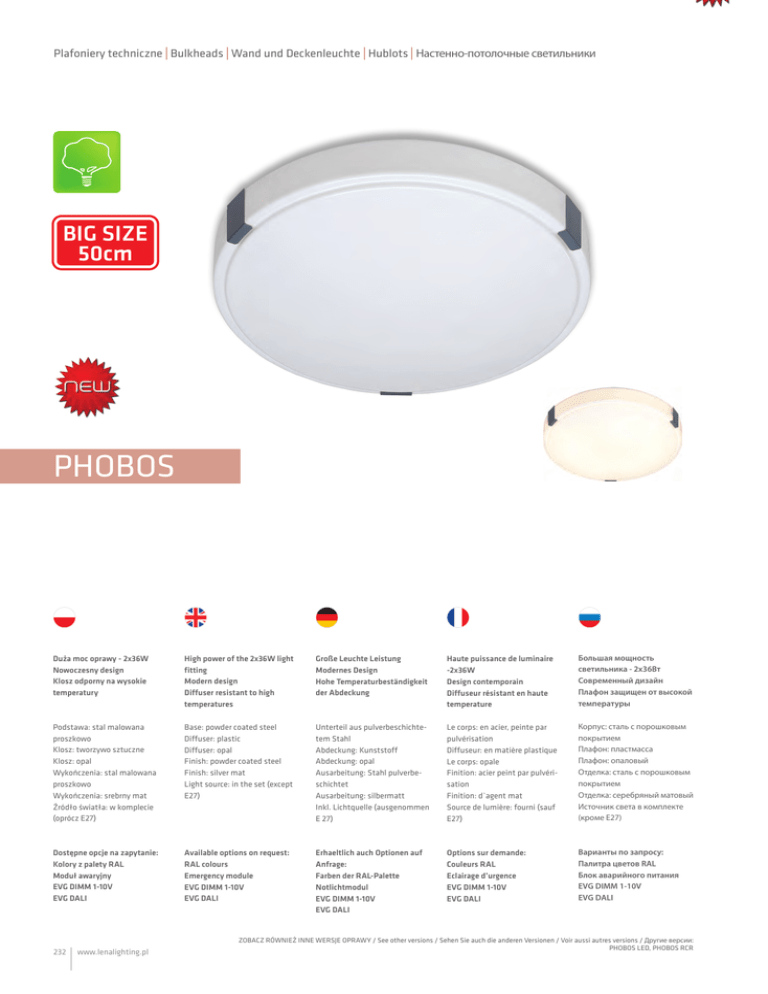 Plafoniery techniczne Bulkheads Wand und Deckenleuchte Hublots Настенно-потолочные светильники PHOBOS Duża moc oprawy - 2x36W Nowoczesny design Klosz odporny na wysokie temperatury High power of the 2x36W light fitting Modern design Diffuser resistant to high temperatures Große Leuchte Leistung Modernes Design Hohe Temperaturbeständigkeit der Abdeckung Haute puissance de luminaire -2x36W Design contemporain Diffuseur résistant en haute temperature Большая мощность светильника - 2х36Вт Современный дизайн Плафон защищен от высокой температуры Podstawa: stal malowana proszkowo Klosz: tworzywo sztuczne Klosz: opal Wykończenia: stal malowana proszkowo Wykończenia: srebrny mat Źródło światła: w komplecie (oprócz E27) Base: powder coated steel Diffuser: plastic Diffuser: opal Finish: powder coated steel Finish: silver mat Light source: in the set (except E27) Unterteil aus pulverbeschichtetem Stahl Abdeckung: Kunststoff Abdeckung: opal Ausarbeitung: Stahl pulverbeschichtet Ausarbeitung: silbermatt Inkl. Lichtquelle (ausgenommen E 27) Le corps: en acier, peinte par pulvérisation Diffuseur: en matière plastique Le corps: opale Finition: acier peint par pulvérisation Finition: d`agent mat Source de lumière: fourni (sauf E27) Корпус: сталь с порошковым покрытием Плафон: пластмасса Плафон: опаловый Отделка: сталь с порошковым покрытием Отделка: серебряный матовый Источник света в комплекте (кроме Е27) Dostępne opcje na zapytanie: Kolory z palety RAL Moduł awaryjny EVG DIMM 1-10V EVG DALI Available options on request: RAL colours Emergency module EVG DIMM 1-10V EVG DALI Erhaeltlich auch Optionen auf Anfrage: Farben der RAL-Palette Notlichtmodul EVG DIMM 1-10V EVG DALI Options sur demande: Couleurs RAL Eclairage d’urgence EVG DIMM 1-10V EVG DALI Варианты по запросу: Палитра цветов RAL Блок аварийного питания EVG DIMM 1-10V EVG DALI 232 www.lenalighting.pl ZOBACZ RÓWNIEŻ INNE WERSJE OPRAWY / See other versions / Sehen Sie auch die anderen Versionen / Voir aussi autres versions / Другие версии: Phobos LED, Phobos RCR Настенно-потолочные светильники Hublots Wand und Deckenleuchte Bulkheads Plafoniery techniczne index index max moc max power trzonek end cap rodzaj klosza type of diffuser EVG/VVG waga netto net weight wymiary produktu product dimensions A/B 470219 1x55W 2GX13 OPAL EVG 1,88 500/110 470318 2x36W 2G10 OPAL EVG 2,36 500/110 EVG 1,88 500/110 470110 1x40W 2GX13 OPAL 470011 1x40W G10Q OPAL EVG 2,36 500/110 470400 2x23W E27 OPAL - 1,90 500/110 1 PHOBOS 1x55W 180° 105° 105° 90° 90° 75° 75° 60° 60° 45° 45° 30° cd/klm CO - C180 15° 0° 15° 30° C9O - C270 www.lenalighting.pl 233