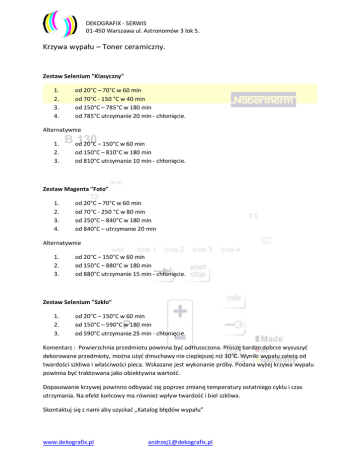 DEKOGRAFIX - SERWIS 01-450 Warszawa ul. Astronomów 3 lok 5. Krzywa wypału – Toner ceramiczny. Zestaw Selenium "Klasyczny" 1. 2. 3. 4. od 20°C – 70°C w 60 min od 70°C - 150 °C w 40 min od 150°C – 785°C w 180 min od 785°C utrzymanie 20 min - chłonięcie. Alternatywnie 1. 2. 3. od 20°C – 150°C w 60 min od 150°C – 810°C w 180 min od 810°C utrzymanie 10 min - chłonięcie. Zestaw Magenta "Foto" 1. 2. 3. 4. od 20°C – 70°C w 60 min od 70°C - 250 °C w 80 min od 250°C – 840°C w 180 min od 840°C – utrzymanie 20 min Alternatywnie 1. 2. 3. od 20°C – 150°C w 60 min od 150°C – 880°C w 180 min od 880°C utrzymanie 15 min - chłonięcie. Zestaw Selenium "Szkło" 1. 2. 3. od 20°C – 150°C w 60 min od 150°C – 590°C w 180 min od 590°C utrzymanie 25 min - chłonięcie. Komentarz : Powierzchnia przedmiotu powinna być odtłuszczona. Proszę bardzo dobrze wysuszyć dekorowane przedmioty, można użyć dmuchawy nie cieplejszej niż 30°C. Wyniki wypału zależą od twardości szkliwa i właściwości pieca. Wskazane jest wykonanie próby. Podana wyżej krzywa wypału powinna być traktowana jako obiektywna wartość. Dopasowanie krzywej powinno odbywać się poprzez zmianę temperatury ostatniego cyklu i czas utrzymania. Na efekt końcowy ma również wpływ twardość i biel szkliwa. Skontaktuj się z nami aby uzyskać „Katalog błędów wypału” www.dekografix.pl [email protected]