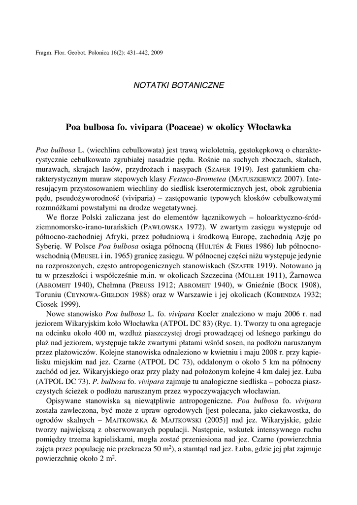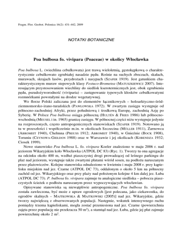 Fragm. Flor. Geobot. Polonica 16(2): 431–442, 2009 NOTATKI BOTANICZNE Poa bulbosa fo. vivipara (Poaceae) w okolicy Włocławka Poa bulbosa L. (wiechlina cebulkowata) jest trawą wieloletnią, gęstokępkową o charakterystycznie cebulkowato zgrubiałej nasadzie pędu. Rośnie na suchych zboczach, skałach, murawach, skrajach lasów, przydrożach i nasypach (SZAFER 1919). Jest gatunkiem charakterystycznym muraw stepowych klasy Festuco-Brometea (MATUSZKIEWICZ 2007). Interesującym przystosowaniem wiechliny do siedlisk kserotermicznych jest, obok zgrubienia pędu, pseudożyworodność (viviparia) – zastępowanie typowych kłosków cebulkowatymi rozmnóżkami powstałymi na drodze wegetatywnej. We florze Polski zaliczana jest do elementów łącznikowych – holoarktyczno-śródziemnomorsko-irano-turańskich (PAWŁOWSKA 1972). W zwartym zasięgu występuje od północno-zachodniej Afryki, przez południową i środkową Europę, zachodnią Azję po Syberię. W Polsce Poa bulbosa osiąga północną (HULTÉN & FRIES 1986) lub północnowschodnią (MEUSEL i in. 1965) granicę zasięgu. W północnej części niżu występuje jedynie na rozproszonych, często antropogenicznych stanowiskach (SZAFER 1919). Notowano ją tu w przeszłości i współcześnie m.in. w okolicach Szczecina (MÜLLER 1911), Żarnowca (ABROMEIT 1940), Chełmna (PREUSS 1912; ABROMEIT 1940), w Gnieźnie (BOCK 1908), Toruniu (CEYNOWA-GIEŁDON 1988) oraz w Warszawie i jej okolicach (KOBENDZA 1932; Ciosek 1999). Nowe stanowisko Poa bulbosa L. fo. vivipara Koeler znaleziono w maju 2006 r. nad jeziorem Wikaryjskim koło Włocławka (ATPOL DC 83) (Ryc. 1). Tworzy tu ona agregacje na odcinku około 400 m, wzdłuż piaszczystej drogi prowadzącej od leśnego parkingu do plaż nad jeziorem, występuje także zwartymi płatami wśród sosen, na podłożu naruszanym przez plażowiczów. Kolejne stanowiska odnaleziono w kwietniu i maju 2008 r. przy kąpielisku miejskim nad jez. Czarne (ATPOL DC 73), oddalonym o około 5 km na północny zachód od jez. Wikaryjskiego oraz przy plaży nad położonym kolejne 4 km dalej jez. Łuba (ATPOL DC 73). P. bulbosa fo. vivipara zajmuje tu analogiczne siedliska – pobocza piaszczystych ścieżek o podłożu naruszanym przez wypoczywających włocławian. Opisywane stanowiska są niewątpliwie antropogeniczne. Poa bulbosa fo. vivipara została zawleczona, być może z upraw ogrodowych [jest polecana, jako ciekawostka, do ogrodów skalnych – MAJTKOWSKA & MAJTKOWSKI (2005)] nad jez. Wikaryjskie, gdzie tworzy największą z obserwowanych populacji. Następnie, wskutek intensywnego ruchu pomiędzy trzema kąpieliskami, mogła zostać przeniesiona nad jez. Czarne (powierzchnia zajęta przez populację nie przekracza 50 m2), a stamtąd nad jez. Łuba, gdzie jej płat zajmuje powierzchnię około 2 m2. 432 Fragm. Flor. Geobot. Polonica 16(2), 2009 DC 74 DC 73 4 5 WISŁA 3 2 DC 84 DC 83 ? 1 Ryc. 1. Lokalizacja stanowisk Poa bulbosa fo. vivipara w okolicy Włocławka i prawdopodobna droga rozprzestrzeniania się gatunku. 1 – jez. Wikaryjskie, 2 – jez. Czarne, 3 – jez. Łuba, 4 – granica miasta, 5 – przypuszczalna droga rozprzestrzeniania się gatunku Fig. 1. The position of localities of Poa bulbosa fo. vivipara in vicinity of Włocławek and probable route of its distribution. 1 – Wikaryjskie Lake, 2 – Czarne Lake, 3 – Łuba Lake, 4 – city border, 5 – putative route of species distribution Rozmieszczenie Poa bulbosa na terenie Polski nie jest dostatecznie poznane, a materiał z terenu kraju budzi wątpliwości taksonomiczne (ZAJĄC & ZAJĄC 2001). Także osobniki obserwowane w okolicy Włocławka nie odpowiadały w pełni opisom gatunku. Nie tworzyły wyraźnych kępek i zasychały już na przełomie kwietnia i maja. Występowanie Poa bulbosa fo. vivipara w okolicy Włocławka jest interesującym przykładem rozprzestrzeniania się gatunków rzadkich na siedliskach antropogenicznych. Summary. Poa bulbosa fo. vivipara (Poaceae) in the vicinity of Włocławek. In 2006 and 2008 three new anthropogenic localities of Poa bulbosa L. fo. vivipara Koeler were found near Włocławek. This rare (in central and north of Poland) species grew on sunny, dry, sandy and moderately disturbed habitats, among pine woods, near bathing beaches at Wikaryjskie, Czarne and Łuba lakes (ATPOL DC 73, 83). LITERATURA ABROMEIT J. 1940. Flora von Ost- und Westpreussen. 2 Hälfte, II Teil: 686–1248. Preussischen Botanischen Verein, Königsberg. BOCK W. 1908. Taschenflora von Bromberg (Das Netzgebiet). s. 214. Bromberg. CEYNOWA-GIEŁDON M. 1988. Szata roślinna obiektów obronnych dawnej twierdzy Toruń. – Acta Univ. Nic. Copern. 32, Nauki Mat-Przyr 69: 23–40 Notatki botaniczne 433 CIOSEK M. T. 1999. Poa bulbosa fo. vivipara (Poaceae) in eastern central Poland. – W: L. FREY (red.), Taxonomy, karyology and distribution of grasses in Poland. Proceedings of the 3rd All-Polish Scientific Meeting. – Fragm. Flor. Geobot. Suppl. 7: 169–170 HULTÉN E. & FRIES M. 1986. Atlas of North European Vascular Plants. North of the Tropic of Cancer 1. s. 498. Koeltz Scientific Books, Köenigstein. KOBENDZA R. 1932. Flora Bielan. – W: Bielany pod Warszawą i konieczność ich ochrony. Państwowa Rada Ochrony Przyrody 33: 13–24. Warszawa. MAJTKOWSKA G. & MAJTKOWSKI W. 2005. Trawy mniej znane. – Agro Serwis 9. Trawy i rośliny motylkowe: 98–101 MATUSZKIEWICZ W. 2007. Przewodnik do oznaczania zbiorowisk roślinnych Polski. s. 537. Wydawnictwo Naukowe PWN, Warszawa. MEUSEL H., JÄGER E. & WEINERT E. 1965. Vergleichende Chorologie der zentraleuropäischen Flora (Karten). 1. s. 258. Veb Gustaw Fisher Verlag, Jena. MÜLLER W. 1911. Flora von Pommern. 3. Aufl. s. 376. Johs. Burmeister’s Buchhandlung, Stettin. PAWŁOWSKA S. 1972. Charakterystyka statystyczna i elementy flory polskiej. – W: W. SZAFER & K. ZARZYCKI (red.), Szata roślinna Polski 1, s. 129–206. Państwowe Wydawnictwo Naukowe, Warszawa. PREUSS H. 1912.