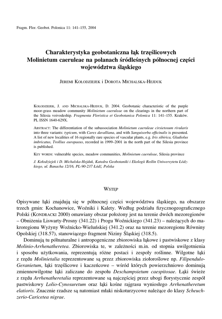 Fragm. Flor. Geobot. Polonica 11: 141–155, 2004 Charakterystyka geobotaniczna łąk trzęślicowych Molinietum caeruleae na polanach śródleśnych północnej części województwa śląskiego JEREMI KOŁODZIEJEK i DOROTA MICHALSKA-HEJDUK KOŁODZIEJEK, J. AND MICHALSKA-HEJDUK, D. 2004. Geobotanic characteristic of the purple moor-grass meadow community Molinietum caeruleae on the clearings in the northern part of the Silesia voivodeship. Fragmenta Floristica et Geobotanica Polonica 11: 141–155. Kraków. PL ISSN 1640-629X. ABSTRACT: The differentiation of the subassociation Molinietum caeruleae cirsietosum rivularis into three variants: typicum, with Carex davalliana, and with Sanguisorba officinalis is presented. A list of new localities of 16 regionally rare species of vascular plants, e.g. Iris sibirica, Gladiolus imbricatus, Trollius europaeus, recorded in 1999–2001 in the north part of the Silesia province is published. KEY WORDS: vulnerable species, meadow communities, Molinietum caeruleae, Silesia province J. Kołodziejek i D. Michalska-Hejduk, Katedra Geobotaniki i Ekologii Roślin Uniwersytetu Łódzkiego, ul. Banacha 12/16, PL-90-237 Łódź, Polska WSTĘP Opisywane łąki znajdują się w północnej części województwa śląskiego, na obszarze trzech gmin: Kochanowice, Woźniki i Kalety. Według podziału fizycznogeograficznego Polski (KONDRACKI 2000) omawiany obszar położony jest na terenie dwóch mezoregionów – Obniżenia Liswarty-Prosny (341.22) i Progu Woźnickiego (341.23) – należących do makroregionu Wyżyny Woźnicko-Wieluńskiej (341.2) oraz na terenie mezoregionu Równiny Opolskiej (318.57), stanowiącego fragment Niziny Śląskiej (318.5). Dominują tu półnaturalne i antropogeniczne zbiorowiska łąkowe i pastwiskowe z klasy Molinio-Arrhenatheretea. Zbiorowiska te, w zależności m.in. od stopnia uwilgotnienia i sposobu użytkowania, reprezentują różne postaci i zespoły roślinne. Wilgotne łąki z rzędu Molinietalia reprezentowane są przez zbiorowiska ziołoroślowe np. FilipenduloGeranietum, łąki trzęślicowe i kaczeńcowe – wśród których powierzchniowo dominują zmiennowilgotne łąki zaliczane do zespołu Deschampsietum caespitosae. Łąki świeże z rzędu Arrhenatheretalia reprezentowane są najczęściej przez ubogi florystycznie zespół pastwiskowy Lolio-Cynosuretum oraz łąki kośne rajgrasu wyniosłego Arrhenatheretum elatioris. Znacznie rzadsze są natomiast młaki niskoturzycowe należące do klasy Scheuchzerio-Caricetea nigrae. 142 Fragm. Flor. Geobot. Polonica 11, 2004 Celem niniejszej pracy jest: (1) opracowanie charakterystyki fitosocjologicznej łąk trzęślicowych północnej części województwa śląskiego, (2) inwentaryzacja florystyczna polan śródleśnych, (3) podanie propozycji ochrony najcenniejszych pod względem florystycznym i fitosocjologicznym polan. MATERIAŁY I METODY Przedstawione w pracy materiały zebrano w sezonie wegetacyjnym 2000 i 2001 r. W zbiorowiskach łąkowych z udziałem Molinia caerulea wykonano łącznie metodą Braun-Blanqueta 20 zdjęć fitosocjologicznych (Ryc. 1), które zestawiono w tabeli 1. Przynależność syntaksonomiczną gatunków przyjęto za MATUSZKIEWICZEM (2001). Ryc. 1. Lokalizacja zdjęć fitosocjologicznych na badanym terenie. 1 – rzeki, 2 – miasta, 3 – lasy, 4 – granica Parku Krajobrazowego „Lasy nad Górną Liswartą”, 5 – granica otuliny parku krajobrazowego, 6 – lokalizacja zdjęcia fitosocjologicznego. Fig. 1. Locality of phytosociological relevés on study area. 1 – rivers, 2 – towns, 3 – forests, 4 – border of the Landscape Park “Lasy nad Górną Liswartą”, 5 – border of buffor zone of the park, 6 – locality of phytosociological relevé. J. Kołodziejek & D. Michalska-Hejduk: Łąki trzęślicowe woj. śląskiego 143 Nomenklaturę roślin naczyniowych podano według MIRKA i in. (1995), a mchów według OCHYRY i SZMAJDY (1978). W celu określenia roli jaką poszczególne syntaksonomiczne grupy gatunków odgrywają w opisywanych wariantach podzespołu Molinietum caeruleae cirsietosum rivularis obliczono grupowe współczynniki pokrycia według wzoru (PAWŁOWSKI 1977): GWp = Wp1+Wp2+....Wpi gdzie Wpi – współczynnik pokrycia i-tego gatunku z analizowanej grupy syntaksonomicznej, wyrażony wzorem: × 100% gdzie: pp – przeciętny procent pokrycia danego gatunku (przyjęto następujące jego wartości dla poszczególnych stopni pokrycia: 5 – 87,5; 4 – 62,5; 3 – 37,5; 2 – 17,5; 1 – 5; + – 0,5*); n – ogólna liczba zdjęć w tabeli. * dla stopnia pokrycia + przyjęto wartość 0,5 (nie zaś 0,1 jak w większości prac) w celu zwiększenia znaczenia gatunków sporadycznych, które w badanych zbiorowiskach odgrywają niejednokrotnie ważną rolę. Ponadto w pracy zamieszczono wykaz rzadkich i chronionych gatunków roślin naczyniowych, w którym układ systematyczny przyjęto według SZAFERA i in. (1988). Przy poszczególnych gatunkach podano kolejno: łacińską nazwę taksonu, charakterystykę siedliskową jego występowania, opis stanowisk złożony z liczby stanowisk nowych i z literatury (np. 1+2) oraz z nazwy miejscowości; na końcu opisu umieszczono dane z literatury dotyczące występowania danego taksonu na badanym terenie. WYNIKI Charakterystyka fitosocjologiczna Molinietum caeruleae Koch 1926 Łąki trzęślicowe w północnej części województwa śląskiego notowano niezbyt często. Największe powierzchnie fitocenoz tego zespołu spotyka się na południe od miejscowości Lubsza, w okolicach Dyrd i Kalet. W większości przypadków zajmują one polany śródleśne i od kilku lat nie są koszone. Na badanym obszarze zespół ten ma szereg „dobrych” gatunków charakterystycznych, które podkreślają jego dużą odrębność florystyczną wśród innych zespołów łąkowych badanego terenu. Są to: Molinia caerulea (V klasa stałości), Iris sibirica (II), Gentiana pneumonanthe (II) i Silaum silaus
