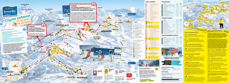 GerZKOpf Trasy zjazdowe HOHer dACHSteIn 2.996 m NOWOŚĆ! Od sezonu zimowego 2014/15 czynna będzie 8-osobowa kolejka gondolowa Donnerkogelbahn bISCHOfSmütZe 2.454 m dACHSteInGLetSCHer Eben Hüttau / Lammertal St. mArtIn Neubachloipe freeride-BAR 19 19b Jausenstation Harreit NOWOŚĆ NOWOŚĆ! Stacja pośrednia 8osobowej kolejki gondolowej Panoramajet /15 W ZIMIE 2014 bahn w a Donnerkogel ow ol nd go ka + Kolej auwinkel olowej Annaberg-Ast ej kolejki gond ow ob os 8a edni + Stacja pośr et Zwieselalm aj am or Pan ussbach – Funslope w R a w do az zj sa + Tra ne! / Hornspitz Fun for everyo tlania w Gosau ie w oś go ne cz skarb! + System sztu ki: Znajdź swój yn rz sk e w no t w.dachstein.a + Geocaching ternetowa ww in wyciągi) na ne ro w st łó a (G + Now rciarskim na u dk ro oś w + Sieć WLAN ad dla całej anych nartostr w to go zy pr ie ln tein West + 142 km idea towym Dachs ne ar K u zk ią iągów rodziny w Zw linowych i wyc k je le ko h yc sn eestyle‘u + 65 nowocze uprawiania fr do e żn zeszkodami ie śn ki +Par y z nowymi pr żn ie śn rk pa ny jlepszą opieką + Profesjonal y dla dzieci z na ub kl i ny ai kr 2 dziecko, +3 : 50% zniżki na na in dz ro ia m + Pre ! 3 dziecko GRATIS Z5 NURTYLKO SOMMERBETRIEB LATEM VOrderer GOSAuSee 17a 16b 16a 11 Sonnenalm Rottenhofhütte 16 Z3 18 A3 Nartostrada – trudna 1-osobowy wyciąg krzesełkowy (tylko latem) 15 15a A6 Holzerhütte AStAuWInKeL 9 LA 9c e4 WLAN NEU NOWOŚĆ TEST 5c WLAN e1 4 5a 4b r8 3a 3 3b r7 Snowpark Dachstein West 7a 4a 4 e2 5 4 Test result: 5 out 4c WLAN 2a 4 e1 WLAN Hornhütte 2 GOSAu HIntertAL 2 Gosaustub’n G2 1g Funslope 1 Test result: 5 out r2 of 5 stars WLAN AbtenAu 1g Trasa zjazdowa Russbach 2 Trasa zjazdowa Hornspitz II 2a Rodzina trasa zjazdowa Hornspitz 2b Brumsiland 2c Trasa zjazdowa Ötscher 2e Trasa zjazdowa Hornspitz I 3 Trasa zjazdowa Falmberg 3a Ochsenkopf 3b Wyciąg na szczyt 4 4a 4b Edtalm 4c Wilde Hilde 5 5a Höhbühel 5b Trasa narciarska z widokiem na lodowiec 5c Bockleit’n 5d Trasa dla narciarzy Rock’n Roll Loipe Süd 10 + 15 km Funslope 1 2e Regau Mondsee Moosalm G3 GOSAu WLAN Sommerer G5 G6 G7 2b 1b 1a r1 1d r5 2c r3 Zagrożenie lawinowe 1e r4 1 Hornspitz Schirmbar 1f r6 Sportlerstüberl Loipe Ost 5 + 16 km ObertrAun SCHAttAu pASS GSCHütt 1c WLAN Schirmbar Kreisverkehr ruSSbACH Tablice lawinowe ostrzegają przed ymi ogólnymi lub miejscowymi, trwał lub nagłymi zagrożeniami lawin owymi na wolnym obszarze! Osoby karze winne wykroczeń podlegać będą na podstawie ustawy o lasach. Urządzenia obsługi tras Uwaga na pracujące urządzenia obsługi tras zjazdowych. Prosimy zwrócić uwagę na ostatni przejazd kontrolny obsługi nartostrad. Prosimy zwrócić uwagę na ostatn ie połączenia skibusem Rozkłady jazdy otrzymasz bezpłatnie przy dolnyc h stacjach wyciągów. Jazda poza wyznaczonymi rasami Jazda po obszarach zadrzewionych, szkółkach leśnych i przecinkach poza oznakowanymi trasami narciarskimi jest surowo wzbroniona ze względu na zalesianie! Osoby winne wykroczeń podlegać będą karze na podstawie ustawy o lasach. Brumsiband 48 m 8m G6 Brumsiband II 57 m 8m G7 Brumsiband III 105 m 15 m Z1 Z2 Panorama Jet Zwieselalm 2296 m 4-os. wyciąg krzesełkowy Törleck 420 m 4-os. wyciąg krzes. Aussichtsberg 866 m 258 m Z4 Wyciąg Hochkögllift 737 m 199 m Z5 Gosaukammbahn (tylko latem) 1105 m 547 m R 2654 m 607 m R1 Wyciąg Hornlift I R2 Wyciąg Hornlift II R3 Wyciąg Sanhoflift R4 Wyciąg Hornbabylift 1377 m 284 m 1143 m 301 m 13 P.* 424 m 105 m 6 P.* 191 m 24 m 10 P.* Wyciąg Strubegglift R6 Zauberteppich Bärencamp R7 Wyciąg Gipfellift 177 m R8 Wyciąg Ochsenkopflift 613 m 48 m E1 6-os. wyciąg krzesełkowy Edtalmbahn 863 m 211 m E2 6-os.wyciąg krzesełkowy Höhbühel 487 m 169 m E4 Wyciąg Gletscherblicklift 367 m 42 m 324 m 41 m 36 m Trasa zjazdowa Hochkögl wyciągi talerzykowe 9d Hängleiten 10 Trasa zjazdowa Törleck 10a „Schwarzreiter“ A1 4-os. wyciąg krzes. Kopfberg 32 P.* 1053 m 286 m 10b „Donnergroll“ A2 4-os. wyciąg krzes. Astauwinkel 28 P.* 948 m 213 m Chata narciarska/restauracja 11 Trasa zjazdowa Riedlkar I A3 8-os. Donnerkogelbahn I 20 P.* 669 m 105 m Bar z parasolami 11a Trasa zjazdowa Riedlkar II A4 8-os. Donnerkogelbahn II 1225 m 509 m 12 Widokowa trasa zjazdowa A5 Wyciąg Riedlgratlift 639 m 147 m 14 Trasa zjazdowa Riedlkopf A6 Wyciąg Angerlift 612 m 149 m 14a Trasa narciarska Rottenhofhütte Przystanek skibusa 16 15a Trasa zjazdowa Riedlgrat Trasa muldowa „Rodeo“ 16b „Freier Fall“ 17 Trasa zjazdowa Astauwinkel 17a Obszar praktyki Wypożyczalnia nart 18 Trasa zjazdowa Astauwinkel 18a snowcross Astauwinkel 19 Trasa zjazdowa Kopfberg 19a Harreit trasa łatwa System sztucznego 19b Jagaschuss Speed Check Free W-LAN 19c Tor wyścigowy Marcel Hirschera SOS W razie nieszczęśliwego wypadku prosimy zwrócić się do pracownika najbliższego wyciągu! długość Wyciągi: dane w metrach = długość wyciągu * Liczba punktów w przypadku wyciągów na karnety punktowe Trasa zjazdowa Anger 16a Naturalny tor saneczkowy Abtenau Hallein Kuchl Kolej linowa Ischl, Bezpłatne skibusy dowozowe z Bad n, Golling, Bad Goisern, Hallstatt, Obertrau do Gosau, Abtenau, St. Martin oraz Lungötz e bezpłatne tkow Doda u. Russbach i do Annaberg bergu. Anna i bach Russ u, Gosa w usy Skib adłowy dla Codzienny bezpłatny transport wah i z powrotem. narciarzy z Salzburga do Russbach ładach jazdy i rozk ych scow miej Na ji: mac infor Więcej ych. tyczn w zrzeszeniach turys Telefon informacyjny +43 6242 440 lub +43 50140 Wyciągi od godz. Kasy wyciągów od godz. 9:00 do godz. 16:00 Uhr 8:30 do godz. 16:30 Uhr Godziny pracy 29.11. & 30.11.2014: Praca w weekendy (przy wystarczającej pokrywie śnieżnej) 6.12.2014 do 6.4.2015 włącznie: praca ciągła Przedsprzedaż biletów dla karnetów wielodniowych już w przeddzień od godz. 15:00. Nartostrady zamknięte są od godz.17:00 do 8:30. Przed sezonem i po sezonie oraz przy niewystarczającej pokrywie śnieżnej praca wy