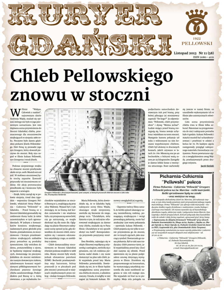 Listopad 2013 Nr 11 (58) ISSN 2080 - 4121 Chleb Pellowskiego znowu w stoczni filmie "Wałęsa. Człowiek z nadziei", najnowszym dziele Andrzeja Wajdy, znalazł się epizod, którego nie było w jego pierwotnym scenariuszu. Jest nim dopisana scena przywiezienia do Stoczni Gdańskiej chleba, przeznaczonego dla stoczniowców strajkujących w sierpniu 1980 roku. Pieczywo było darem gdańskiej piekarni Józefa Pellowskiego. Dziś firmę tę prowadzi jego syn Grzegorz, który dowoził pieczywo do stoczni. Rolę ojca zagrał w filmie Łukasz Pellowski, syn Grzegorza i wnuk Józefa. *** Podczas sierpniowego strajku na obszarze stoczni przebywało około 16 tys. osób. Musieli oni coś jeść. W stołówce stoczniowej było trochę zapasów. Żywność przynosiły też stoczniowcom rodziny. Ale akcja protestacyjna przedłużała się i konieczne było wsparcie z zewnątrz. - Strajk, który zaczął się w połowie sierpnia, trwał dwa tygodnie - wspomina Grzegorz Pellowski, właściciel firmy Piekarnia - Cukiernia "Pellowski" w Gdańsku. - Przed bramą nr 2 Stoczni Gdańskiej gromadziły się codziennie tłumy ludzi. Ja także uczestniczyłem w tych zgromadzeniach. W jednym z komunikatów komitetu strajkowego, nadawanych przez głośniki przy bramie, powiadomiono, że stoczniowcom i licznym przedstawicielom strajkujących zakładów pracy potrzebne są produkty żywnościowe. Gdy wróciłem do domu, postanowiliśmy z ojcem, że będziemy wspierać strajkujących, dostarczając im pieczywo. Jeździłem do stoczni wielokrotnie naszym dostawczym żukiem, załadowanym koszami wypełnionymi półkilogramowymi bochenkami pszenno żytniego chleba sandomierskiego. Podjeżdżałem pod Bramę nr 2, którą otwierano, a po wyładunku bo- podjechaniu samochodem dostawczym żuk pod bramę, przy której pilnujący jej stoczniowcy zapytali: "Do kogo?". Ja odpowiadam: "Pellowski, chleb przywiozłem" i słyszę "Można jechać". Ludzie stojący przed bramą rozstępują się, brama zostaje uchylona i wjeżdżam na teren stoczni. Następnie kamera pokazuje tył żuka z widocznymi na nim koszami wypełnionymi chlebem. Chleb był ułożony w drucianych koszach, jakich używano w latach 70. i 80. Mieszczą one po 40 bochenków, z którymi ważą razem po 25 kilogramów. Zastąpiły je dawno lekkie kosze z tworzywa sztucznego. Stare zachowały W się jeszcze w naszej firmie, co umożliwiło wykorzystanie ich w filmie jako autentycznych rekwizytów. Cała scena przywiezienia chleba trwa w filmie kilka sekund. Natomiast na przygotowania do niej i nakręcanie potrzeba było 8 godzin. Łukasz Pellowski i statyści musieli być ucharakteryzowani i przebrani w odzież z końca lat 70. Po każdym ujęciu następowały przegląd nakręconego materiału i konsultacje z reżyserem. Potem powtarzano ujęcie z uwzględnieniem uwag Wajdy, przekazywanych przez drugiego reżysera. Jacek Sieński Piekarnia-Cukiernia “Pellowski” poleca Grzegorz Pellowski z drucianymi koszami, tymi samymi, w których przewoził chleb do stoczni w 1980 roku Fot. Przemysław Świderski chenków wyjeżdżałem ze stoczni Bramą nr 3, znajdującą się przy ulicy Wałowej. Wyjazd był o tyle stresujący, że za bramą stał kordon zomowców i nie wiadomo było, czy przepuszczą samochód, czy go zatrzymają, co mogło skończyć się dla mnie źle. Oglądając na planie filmowym nakręcanie sceny sprzed 33 lat, gdy dowoziłem do stoczni chleb, wzruszyłem się i zarazem odczuwałem satysfakcję z tego, co zrobiliśmy z ojcem. - Chleb dostarczaliśmy stoczniowcom ze Stoczni Gdańskiej również podczas strajków w 1988 roku. Bramy stoczni były wtedy jednak obstawione patrolami ZOMO. Bochenki przekazywaliśmy więc harcerzom, którzy przenosili je w plecakach pod płot stoczni i przerzucali w miejscach niepilnowanych przez milicję - dodaje Grzegorz Pellowski. *** Maria Pellowska, która dowiedziała się, że w Gdańsku będą nakręcane sceny filmu Wajdy, ukazujące strajk sierpniowy, zwróciła się listownie do niego, pisząc m.in. "Chciałabym, żeby historia o tym, że mój ojciec ofiarowywał strajkującym za darmo tony chleba, znalazła się w Pana filmie. Chciałabym w ten sposób złożyć mu hołd". Korespondencja przyniosła pozytywny rezultat. Ewa Brodzka, zajmująca się w ekipie filmowej współpracą reżyserską i castingiem, zwróciła się z pytaniem, czy ich rodzinna piekarnia nadal działa i czy może dostarczyć na plan taki chleb, jaki wypiekała przed laty. Maria Pellowska potwierdziła. Dowiedziała się też, że w filmie będzie uwzględniona scena przywożenia chleba do stoczni, z udziałem statysty. Uznała, iż mógłby w niej zagrać jej bratanek Łukasz. Fil- mowcy uwzględnili jej sugestię. *** - Zapewne twórcy filmu uznali, że krótki epizod ukazujący naszą rzemieślniczą rodzinę, pomagającą strajkującym i wciąż prowadzącą piekarnię, może być atrakcyjny i jest warty pokazania - opowiada Łukasz Pellowski. Chleb pojawia się nie tylko w scenie przywożenia go do stoczni, ale i w innych ujęciach, jako znaczący symbol. Dostarczała go nasza piekarnia. Był to taki sam tradycyjny chleb pszenno-żytni, jaki wypiekaliśmy przed laty. Choć dziś nazywa się oliwski. Przed zjawieniem się na planie podpisałem umowę dotyczącą wystąpienia w filmie. Zrzekłem się proponowanego mi honorarium, bo wystarczającą satysfakcję stanowiła dla mnie możliwość zagrania w nim roli mojego ojca. Nie wypadało mi brać za to pieniędzy. Moja rola polegała na Firma Piekarnia - Cukiernia "Pellowski" Grzegorz Pellowski poleca na św. Marcina - rożki marcjanki. Rożki sprzedawane będą na sztuki - oraz mniejsze na wagę. 11 listopada obchodzimy dzień św. Marcina. Jak nakazuje zwyczaj, w tym dniu każdy powinien zjeść przynajmniej jednego rogala marcińskiego. Firma "Pellowski" już oferuje rożki marcjanki - tradycyjne słodkie rogale drożdżowe z nadzieniem z maku białego i czarnego oraz bakalii. Ich nazwa 