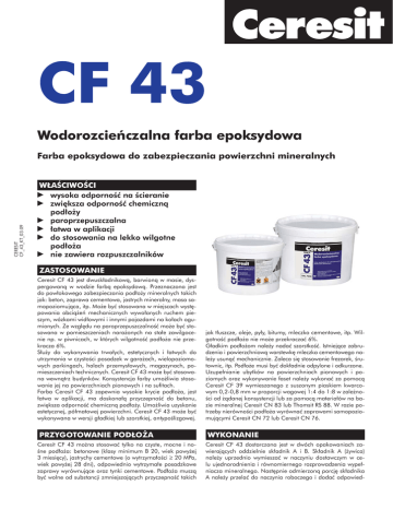 CF 43 Wodorozcieńczalna farba epoksydowa CERESIT CF_43_KT_03.09 Farba epoksydowa do zabezpieczania powierzchni mineralnych WŁAŚCIWOŚCI wysoka odporność na ścieranie zwiększa odporność chemiczną podłoży paroprzepuszczalna łatwa w aplikacji do stosowania na lekko wilgotne podłoża nie zawiera rozpuszczalników ZASTOSOWANIE Ceresit CF 43 jest dwuskładnikową, barwioną w masie, dyspergowaną w wodzie farbą epoksydową. Przeznaczona jest do powłokowego zabezpieczania podłoży mineralnych takich jak: beton, zaprawa cementowa, jastrych mineralny, masa samopoziomująca, itp. Może być stosowana w miejscach występowania obciążeń mechanicznych wywołanych ruchem pieszym, wózkami widłowymi i innymi pojazdami na kołach ogumionych. Ze względu na paroprzepuszczalność może być stosowana w pomieszczeniach narażonych na stałe zawilgocenie np. w piwnicach, w których wilgotność podłoża nie przekracza 6%. Służy do wykonywania trwałych, estetycznych i łatwych do utrzymania w czystości posadzek w garażach, wielopoziomowych parkingach, halach przemysłowych, magazynach, pomieszczeniach technicznych. Ceresit CF 43 może być stosowana wewnątrz budynków. Konsystencja farby umożliwia stosowanie jej na powierzchniach pionowych i na sufitach. Farba Ceresit CF 43 zapewnia wysokie krycie podłoża, jest łatwa w aplikacji, ma doskonałą przyczepność do betonu, zwiększa odporność chemiczną podłoży. Umożliwia uzyskanie estetycznej, półmatowej powierzchni. Ceresit CF 43 może być wykonywana w wersji gładkiej lub szorstkiej, antypoślizgowej. PRZYGOTOWANIE PODŁOŻA Ceresit CF 43 można stosować tylko na czyste, mocne i nośne podłoża: betonowe (klasy minimum B 20, wiek powyżej 3 miesięcy), jastrychy cementowe (o wytrzymałości ³ 20 MPa, wiek powyżej 28 dni), odpowiednio wytrzymałe posadzkowe zaprawy wyrównujące oraz tynki cementowe. Podłoża muszą być wolne od substancji zmniejszających przyczepność takich jak tłuszcze, oleje, pyły, bitumy, mleczko cementowe, itp. Wilgotność podłoża nie może przekraczać 6%. Gładkim podłożom należy nadać szorstkość. Istniejące zabrudzenia i powierzchniową warstewkę mleczka cementowego należy usunąć mechanicznie. Zaleca się stosowanie frezarek, śrutownic, itp. Podłoże musi być dokładnie odpylone i odkurzone. Uzupełnianie ubytków na powierzchniach pionowych i poziomych oraz wykonywanie faset należy wykonać za pomocą Ceresit CF 39 wymieszanego z suszonym piaskiem kwarcowym 0,2-0,8 mm w proporcji wagowej 1:4 do 1:8 w zależności od żądanej konsystencji lub za pomocą materiałów na bazie mineralnej Ceresit CN 83 lub Thomsit RS 88. W razie potrzeby nierówności podłoża wyrównać zaprawami samopoziomującymi Ceresit CN 72 lub Ceresit CN 76. WYKONANIE Ceresit CF 43 dostarczana jest w dwóch opakowaniach zawierających oddzielnie składnik A i B. Składnik A (żywica) należy uprzednio wymieszać w naczyniu dostawczym w celu ujednorodnienia i równomiernego rozprowadzenia wypełniacza mineralnego. Następnie odmierzoną porcję składnika A należy przelać do naczynia roboczego i dodać odpowied- UWAGA Wejście na rozprowadzoną świeżą farbę ułatwiają specjalne buty na kolcach. Narzędzia i świeże resztki materiału można zmyć ciepłą wodą. Stwardniałą farbę można usunąć tylko mechanicznie. Do wykonywania posypki z piasku 0,2-0,8 mm należy przyjąć około 4 kg piasku na 1m2. Nadmiar piasku, który pozostaje na powierzchni związanej żywicy nadaje się do ponownego użycia. Prace należy wykonywać w temperaturze powietrza od +12°C do +30°C oraz wilgotności względnej poniżej 80%. Wszystkie materiały do wykonywania posadzki powinny być sezonowane co najmniej 24 godziny w pomieszczeniu lub w warunkach w których będzie wykonywana posadzka. Temperatura podłoża nie może być niższa niż 12°C i musi być co najmniej o 3°C wyższa od temperatury punktu rosy. Wszelkie dane dotyczą temperatury +20°C i względnej wilgotności powietrza 60%. W innych warunkach należy uwzględnić szybsze lub wolniejsze twardnienie materiału. Materiał przewozić wyłącznie krytymi środkami transportu. Farba Ceresit CF 43 po utwardzeniu jest fizjologicznie obojętna dla organizmu ludzkiego. Nieutwardzony materiał zawiera substancje szkodliwe dla zdrowia i może powodować odczyny alergiczne. Stosować rękawice, ubranie i okulary ochronne. Pomieszczenia, w których odbywają się prace należy wydzielić i zabezpieczyć przed wstępem osób postronnych oraz zachować strefę ochronną przed użyciem otwartego ognia. W pomieszczeniach zapewnić dobrą wentylację. W przypadku wystąpienia mdłości należy skontaktować się z lekarzem. Skórę zabrudzoną farbą zmyć ciepłą wodą z mydłem i natłuścić kremem. W przypadku kontaktu z oczami płukać je obficie wodą i zasięgnąć porady lekarza. Chronić przed dziećmi. ZALECENIA Niniejsza karta techniczna określa zakres stosowania materiału i sposób prowadzenia robót, ale nie może zastąpić zawodowego przygotowania wykonawcy. Oprócz podanych informacji prace należy wykonywać zgodnie ze sztuką budowlaną i zasadami BHP. Producent gwarantuje jakość wyrobu, natomiast nie ma wpływu na warunki i sposób jego użycia. W przypadku wątpliwości należy wykonać własne próby stosowania. Wraz z ukazaniem się tej karty technicznej tracą ważność karty wcześniejsze. SKŁADOWANIE Do 6 miesięcy od daty produkcji przy składowaniu w suchych, przewiewnych pomieszczeniach, w temperaturze do 25°C oraz w oryginalnych, nieuszkodzonych, szczelnie zamkniętych opakowaniach. Chronić przed mrozem! OPAKOWANIA Pojemniki 15 kg (składnik A+B). CERESIT CF_43_KT_03.09 nią ilość składnika B (utwardzacz) wg podanej proporcji. Obydwa składniki wymieszać przy użyciu wiertarki z mieszadłem (300-600 obr/min.), aż do uzyskania jednorodnej kolorystyczne mieszaniny. Podczas mieszania należy zgarniać mieszadłem