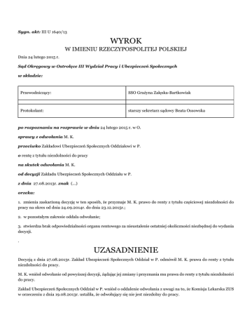 Sygn. akt: III U 1640/13 WYROK W IMIENIU RZECZYPOSPOLITEJ POLSKIEJ Dnia 24 lutego 2015 r. Sąd Okręgowy w Ostrołęce III Wydział Pracy i Ubezpieczeń Społecznych w składzie: Przewodniczący: SSO Grażyna Załęska-Bartkowiak Protokolant: starszy sekretarz sądowy Beata Ossowska po rozpoznaniu na rozprawie w dniu 24 lutego 2015 r. w O. sprawy z odwołania M. K. przeciwko Zakładowi Ubezpieczeń Społecznych Oddziałowi w P. o rentę z tytułu niezdolności do pracy na skutek odwołania M. K. od decyzji Zakładu Ubezpieczeń Społecznych Oddziału w P. z dnia 27.08.2013r. znak (...) orzeka: 1. zmienia zaskarżoną decyzję w ten sposób, że przyznaje M. K. prawo do renty z tytułu częściowej niezdolności do pracy na okres od dnia 24.09.2014r. do dnia 23.12.2015r.; 2. w pozostałym zakresie oddala odwołanie; 3. stwierdza brak odpowiedzialności organu rentowego za nieustalenie ostatniej okoliczności niezbędnej do wydania decyzji. . UZASADNIENIE Decyzją z dnia 27.08.2013r. Zakład Ubezpieczeń Społecznych Oddział w P. odmówił M. K. prawa do renty z tytułu niezdolności do pracy. M. K. wniósł odwołanie od powyższej decyzji, żądając jej zmiany i przyznania mu prawa do renty z tytułu niezdolności do pracy. Zakład Ubezpieczeń Społecznych Oddział w P. wniósł o oddalenie odwołania z uwagi na to, że Komisja Lekarska ZUS w orzeczeniu z dnia 19.08.2013r. ustaliła, że odwołujący się nie jest niezdolny do pracy. Sąd Okręgowy ustalił następujący stan faktyczny: w dniu 29.05.2013r. M. K. złożył wniosek o ustalenie uprawnień do renty z tytułu niezdolności do pracy. Orzeczeniem z dnia 25.06.2013r. lekarz orzecznik ZUS ustalił, że odwołujący jest okresowo częściowo niezdolny do pracy do 30.06.2016r., a niezdolność do pracy powstała w dniu 13.04.2013r. Na skutek zarzutu wadliwości orzeczenia wniesionego przez zastępcę Głównego Orzecznika ZUS stan zdrowia ubezpieczonego był badany przez Komisję Lekarską ZUS, która w orzeczeniu z dnia 19.08.2014r. orzekła, że ubezpieczony nie jest niezdolny do pracy. Wobec powyższego decyzją z dnia 27.08.2013r. Zakład Ubezpieczeń Społecznych Oddział w P. odmówił przyznania M. K. prawa do renty z tytułu niezdolności do pracy. Sąd zważył, co następuje: Zgodnie z art.57 ust. 1 ustawy z dnia 17.12.1998r. o emeryturach i rentach z Funduszu Ubezpieczeń Społecznych (tekst jedn. Dz. U. z 2013r., poz. 1440 ze zm.) - renta z tytułu niezdolności do pracy przysługuje ubezpieczonemu, który spełnia łącznie następujące warunki: jest niezdolny do pracy, ma wymagany okres składkowy i nieskładkowy, a niezdolność do pracy powstała we wskazanych w ustawie okresach składkowych i nieskładkowych, albo nie później niż w ciągu 18 miesięcy od ich ustania. Osobie, która spełnia powyższe warunki przysługuje, według art. 59 ust. 1 powołanej ustawy, renta stała – jeżeli niezdolność do pracy jest trwała (pkt 1), lub renta okresowa – jeżeli niezdolność do pracy jest okresowa (pkt 2). Definicję osoby niezdolnej do pracy podaje natomiast art. 12 ust. 1-3 tejże ustawy, który stanowi, że jest nią osoba, która całkowicie lub częściowo utraciła zdolność do pracy zarobkowej z powodu naruszenia sprawności organizmu i nie rokuje odzyskania zdolności do pracy po przekwalifikowaniu (ust. 1), przy czym całkowicie niezdolną do pracy jest osoba, która utraciła zdolność do wykonywania jakiejkolwiek pracy (ust. 2), zaś częściowo niezdolną do pracy jest osoba, która w znacznym stopniu utraciła zdolność do pracy zgodnej z poziomem posiadanych kwalifikacji (ust. 3). W świetle powyższych przepisów skuteczność odwołania M. K. zależna była od wykazania przez niego niezdolności do pracy. Na tę okoliczność Sąd dopuścił dowód z opinii biegłych lekarzy z zakresu kardiologii, neurologii i okulistyki. Po przeprowadzeniu wywiadu z M. K., jego zbadaniu oraz po analizie dokumentacji medycznej biegła okulista B. M., kardiolog K. S. oraz neurolog M. B. rozpoznali u niego: nadwzroczność wysoką obu oczu, astygmatyzm, stan po operacji zeza zbieżnego, zez rozbieżny wtórny, niedowidzenie oka lewego dużego stopnia, praktyczną jednooczność, nadciśnienie tętnicze. Biegli ocenili, że występujące u odwołującego się schorzenia oraz stopień ich zaawansowania stanowią podstawę do stwierdzenia, iż odwołujący jest zaadoptowany do jednooczności, drugie oko jest widzące po korekcji szkłami korekcyjnymi i orzekli że odwołujący jest zdolny do pracy z pewnymi ograniczeniami określanymi przez medycynę pracy. W uzasadnieniu opinii biegli stwierdzili, że badany nie był diagnozowany przez neurologa, jego okresowe bóle głowy wiążą się ze skokami ciśnienia tętniczego, a stwierdzone nadciśnienie tętnicze nie stanowi przeciwwskazania do pracy. Ponadto biegły okulista stwierdził, że niedowidzenie jednego oka nie czyni ubezpieczonego niezdolnym do pracy (k. 13-14). Odwołujący nie zgodził się z wnioskami biegłych. Z jego zeznań wynikało, iż jest z zawodu artystą. Specjalizuje się on w malowaniu ikon i rzeźbie z drewna. Maluje także farbami olejnymi na płótnie. Jego głównym schorzeniem jest złożona wada wzroku, powodująca, że praktycznie jest osobą jednooczną. To uniemożliwia mu wykonywanie pracy. Musi malować z lupą. Odwołujący, nie mogąc tworzyć, znalazł zastępcze źródło dochodu tj. oprawiał obrazy. Przy czym jest to praca na maszynach w ruchu i wobec powyższego wada wzroku także uniemożliwia mu aktualnie wykonywanie tej pracy. Mając na uwadze powyższe zarzuty, Sąd dopuścił dowód z opinii biegłych lekarzy z zakresu okulistyki i medycyny pracy. Po przeprowadzeniu wywiadu z M. K., jego zbadaniu oraz po analizie dokumentacji medycznej biegła okulista I. B. rozpoznała u niego: nadwzroczność wysokiego stopnia obu oczu, astygmatyzm krótkowzroczny niskiego stopnia obu oczu, niedowidzenie dużego stopnia oka leweg