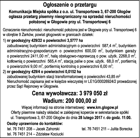 Ogłoszenie o przetargu Komunikacja Miejska spółka z o.o. ul. Transportowa 3, 67-200 Głogów ogłasza przetarg pisemny nieograniczony na sprzedaż nieruchomości położonej w Głogowie przy ul. Transportowej 6 Oznaczenie nieruchomości: nieruchomość położona jest w Głogowie przy ul. Transportowej 6 w obrębie 9 Żarków, powiat głogowski w granicach działek: 1) nr geodezyjny 429/22 o powierzchni 3,5777 ha zabudowanej budynkiem administracyjnym o powierzchni 587,4 m2, budynkiem administracyjno-gospodarczym o powierzchni 600,00 m2, budynkiem garaży o powierzchni 2411,00 m2, halą obsługowo-naprawczą o pow. użytk. 2268,0 m2, kotłownią o powierzchni 565,4 m2, stacją paliw o pow. użytk. 68,0 m2, portiernią o powierzchni 9,00 m2, portiernią kontrolną o powierzchni 6,00 m2; 2) nr geodezyjny 429/4 o powierzchni 0,0152 ha zabudowanej budynkiem stacji transformatorowej o powierzchni 43,85 m2 Nieruchomość zapisana jest w księdze wieczystej nr LE1G/00026924/2 prowadzonej przez Sąd Rejonowy w Głogowie. Cena wywoławcza: 3 979 050 zł Wadium: 200 000,00 zł Więcej informacji na stronie internetowej: www.km.glogow.pl Oferty pisemne należy składać w zaklejonej kopercie w sekretariacie spółki ul. Transportowa 3, 67-200 Głogów do dnia 28 lutego 2017 r. do godz. 11:00. Osoby uprawnione do kontaktów: 76 7451 208 – Jacek Zahorski 76 7451 211 – Julita Borecka 76 7451 214 – Zdzisław Kociucki