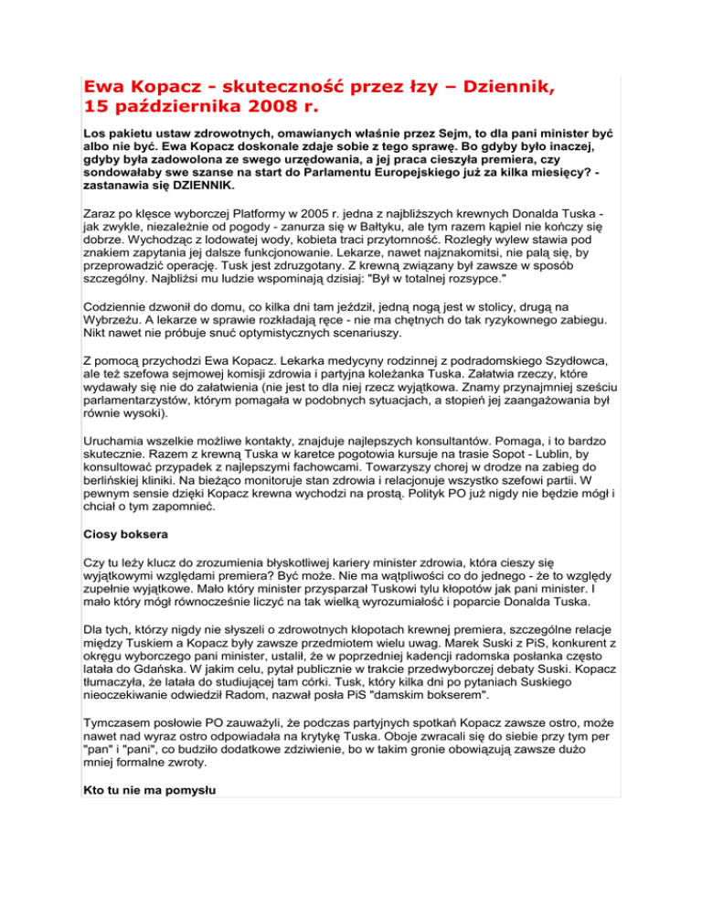 Ewa Kopacz - skuteczność przez łzy – Dziennik, 15 października 2008 r. Los pakietu ustaw zdrowotnych, omawianych właśnie przez Sejm, to dla pani minister być albo nie być. Ewa Kopacz doskonale zdaje sobie z tego sprawę. Bo gdyby było inaczej, gdyby była zadowolona ze swego urzędowania, a jej praca cieszyła premiera, czy sondowałaby swe szanse na start do Parlamentu Europejskiego juŜ za kilka miesięcy? zastanawia się DZIENNIK. Zaraz po klęsce wyborczej Platformy w 2005 r. jedna z najbliŜszych krewnych Donalda Tuska jak zwykle, niezaleŜnie od pogody - zanurza się w Bałtyku, ale tym razem kąpiel nie kończy się dobrze. Wychodząc z lodowatej wody, kobieta traci przytomność. Rozległy wylew stawia pod znakiem zapytania jej dalsze funkcjonowanie. Lekarze, nawet najznakomitsi, nie palą się, by przeprowadzić operację. Tusk jest zdruzgotany. Z krewną związany był zawsze w sposób szczególny. NajbliŜsi mu ludzie wspominają dzisiaj: "Był w totalnej rozsypce." Codziennie dzwonił do domu, co kilka dni tam jeździł, jedną nogą jest w stolicy, drugą na WybrzeŜu. A lekarze w sprawie rozkładają ręce - nie ma chętnych do tak ryzykownego zabiegu. Nikt nawet nie próbuje snuć optymistycznych scenariuszy. Z pomocą przychodzi Ewa Kopacz. Lekarka medycyny rodzinnej z podradomskiego Szydłowca, ale teŜ szefowa sejmowej komisji zdrowia i partyjna koleŜanka Tuska. Załatwia rzeczy, które wydawały się nie do załatwienia (nie jest to dla niej rzecz wyjątkowa. Znamy przynajmniej sześciu parlamentarzystów, którym pomagała w podobnych sytuacjach, a stopień jej zaangaŜowania był równie wysoki). Uruchamia wszelkie moŜliwe kontakty, znajduje najlepszych konsultantów. Pomaga, i to bardzo skutecznie. Razem z krewną Tuska w karetce pogotowia kursuje na trasie Sopot - Lublin, by konsultować przypadek z najlepszymi fachowcami. Towarzyszy chorej w drodze na zabieg do berlińskiej kliniki. Na bieŜąco monitoruje stan zdrowia i relacjonuje wszystko szefowi partii. W pewnym sensie dzięki Kopacz krewna wychodzi na prostą. Polityk PO juŜ nigdy nie będzie mógł i chciał o tym zapomnieć. Ciosy boksera Czy tu leŜy klucz do zrozumienia błyskotliwej kariery minister zdrowia, która cieszy się wyjątkowymi względami premiera? Być moŜe. Nie ma wątpliwości co do jednego - Ŝe to względy zupełnie wyjątkowe. Mało który minister przysparzał Tuskowi tylu kłopotów jak pani minister. I mało który mógł równocześnie liczyć na tak wielką wyrozumiałość i poparcie Donalda Tuska. Dla tych, którzy nigdy nie słyszeli o zdrowotnych kłopotach krewnej premiera, szczególne relacje między Tuskiem a Kopacz były zawsze przedmiotem wielu uwag. Marek Suski z PiS, konkurent z okręgu wyborczego pani minister, ustalił, Ŝe w poprzedniej kadencji radomska posłanka często latała do Gdańska. W jakim celu, pytał publicznie w trakcie przedwyborczej debaty Suski. Kopacz tłumaczyła, Ŝe latała do studiującej tam córki. Tusk, który kilka dni po pytaniach Suskiego nieoczekiwanie odwiedził Radom, nazwał posła PiS "damskim bokserem". Tymczasem posłowie PO zauwaŜyli, Ŝe podczas partyjnych spotkań Kopacz zawsze ostro, moŜe nawet nad wyraz ostro odpowiadała na krytykę Tuska. Oboje zwracali się do siebie przy tym per "pan" i "pani", co budziło dodatkowe zdziwienie, bo w takim gronie obowiązują zawsze duŜo mniej formalne zwroty. Kto tu nie ma pomysłu Właściwie nie miała kontrkandydata do tego fotela. ElŜbietę Radziszewską, nieco bardziej doświadczoną posłankę zajmującą się słuŜbą zdrowia, zmarginalizowała wcześniej w sposób spektakularny. W grę mógł wchodzić Jerzy Miller, były szef Narodowego Funduszu Zdrowia, gdyby nie jedna wada - z powodu bardzo rygorystycznego stosunku do pieniędzy nie miał szans na dobre lokaty w sondaŜach. Wydawało się poza tym, Ŝe i sama Kopacz ma wiele atutów. Jako szef komisji zdrowia bardzo sprawnie punktowała błędy rządów PiS. Wspierała pielęgniarki z białego miasteczka pod kancelarią premiera i na specjalnie zwołanym posiedzeniu komisji zdrowia ze zrozumieniem pochylała się nad ich problemami. Z trybuny sejmowej grzmiała: "To jest władza, która nie ma pomysłu na rządzenie, a swój brak kompetencji pokrywa arogancją i butą." Rzecz wyglądała więc na absolutnie oczywistą - nie tylko głowa Ewy Kopacz pełna jest pomysłów na uzdrowienie słuŜby zdrowia, ale i jej szuflady zapychają projekty ustaw, które zreformują system opieki zdrowotnej. Nie minął rok, a posłowie opozycji zgodnie podsumowują: "Pani minister nie ma wyobraźni politycznej w sprawie systemu opieki zdrowotnej. Kompletnie nie nadaje się do kierowania tym resortem." (Marek Balicki, poseł SdPl, były minister zdrowia). "Działa bardziej emocjonalnie niŜ racjonalnie. Zdziwiłem się, Ŝe powołano ją na to stanowisko, bo w PO znam bardziej kompetentne osoby." (Bolesław Piecha, szef komisji zdrowia z PiS, były wiceminister). "Ani politycznie, ani intelektualnie nie panuje nad swoim ministerstwem. Jest figurantką." (Ludwik Dorn, do niedawna członek komisji zdrowia, były wicepremier). Ulotne projekty Kłopoty zwiastowały juŜ pierwsze miesiące. "Niektórzy mówili, Ŝe na reformę trzeba 7 lat, my potrzebowaliśmy tylko 50 dni" - oznajmiła na początku stycznia pani minister, zapowiadając zgłoszenie pakietu czterech projektów ustaw: o ZOZ, koszyku świadczeń niegwarantowanych, ubezpieczeniach dodatkowych i prawach pacjenta. Jeśli wziąć pod uwagę to, co działo się na zapleczu pani minister, to oświadczenie wyglądało na wyjątkowo odwaŜne. Kilka dni wcześniej premier postanowił sprawdzić postępy prac w jej resorcie. Gdy dostał plik kartek zawierających bardzo luźne zapisy, zwołał w trybie nagłym sztab antykryzysowy. Ale Ŝaden sztab nie mógł niczemu zaradzić, skoro przedstawiciele Ministerstwa Zdrowia nie byli przygotowani. Nie mieli pojęcia, ile pieniędzy ś