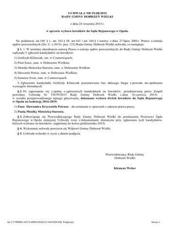 UCHWAŁA NR IX/68/2015 RADY GMINY DOBRZEŃ WIELKI z dnia 24 września 2015 r. w sprawie wyboru ławników do Sądu Rejonowego w Opolu. Na podstawie art.160 § 1, art. 162 § 10, art.163 i art. 164 § 1 ustawy z dnia 27 lipca 2001r. Prawo o ustroju sądów powszechnych (Dz. U. z 2015r. poz. 133) Rada Gminy Dobrzeń Wielki uchwala, co następuje: § 1. 1. W terminie określonym ustawą Prawo o ustroju sądów powszechnych, do Rady Gminy Dobrzeń Wielki wpłynęło 5 zgłoszeń kandydatów na ławników: 1) Gotfryda Klimczak, zm. w Czarnowąsach; 2) Piotr Kneć, zam. w Dobrzeniu Wielkim; 3) Monika Mościcka-Starosta, zam. w Dobrzeniu Wielkim 4) Sławomir Petrus, zam. w Dobrzeniu Wielkim; 5) Ireneusz Swat, zam. w Czarnowąsach. 2. Zgłoszenie kandydatki Gotfrydy Klimczak pozostawiono bez dalszego biegu z powodu nie spełnienia wymogów formalnych. § 2. Po zapoznaniu się z opinią o zgłoszonych kandydatach na ławników, przedstawioną przez Zespół powołany Uchwałą Nr VII/59/2015 Rady Gminy Dobrzeń Wielki z dnia 18 czerwca 2015r. , w wyniku przeprowadzonego tajnego głosowania, dokonano wyboru dwóch ławników do Sądu Rejonowego w Opolu na kadencję 2016-2019: 1) Pana Sławomira Krzysztofa Petrusa – do orzekania w sprawach z zakresu prawa pracy; 2) Panią Monikę Mościcką-Starosta. § 3. Zobowiązuje się Przewodniczącego Rady Gminy Dobrzeń Wielki do przekazania Prezesowi Sądu Rejonowego w Opolu niniejszej Uchwały wraz z dokumentami złożonymi przy zgłaszaniu tych kandydatów, których wybrano na ławników, najpóźniej do końca października 2015r. § 4. Wykonanie uchwały powierza się Wójtowi Gminy Dobrzeń Wielki. § 5. Uchwała wchodzi w życie z dniem podjęcia. Przewodniczący Rady Gminy Dobrzeń Wielki Klemens Weber Id: C37490D0-AFC8-400D-9E6D-CC44470EF440. Podpisany Strona 1