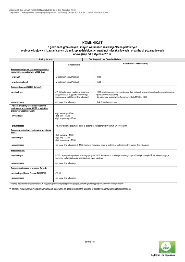 Załącznik Nr 3 do Uchwały Nr 350/2014 Zarządu BOS S.A. z dnia 23 grudnia 2014 r. Załącznik Nr 1 do Regulaminu, stanowiącego Załącznik Nr 1 do Uchwały Zarządu BOŚ S.A. Nr 222/2014 z dnia 5.08.2014 r. KOMUNIKAT o godzinach granicznych i innych warunkach realizacji Zleceń płatniczych w obrocie krajowym i zagranicznym dla mikroprzedsiębiorstw, wspólnot mieszkaniowych i organizacji pozarządowych obowiązuje od 1 stycznia 2015r. Rodzaj zlecenia Godzina graniczna/ Zlecenia składane: w bankowości elektronicznej w Placówkach Przelewy wewnętrzne realizowane pomiędzy rachunkami prowadzonymi w BOŚ S.A.: - w złotych - w godzinach pracy Placówek - 20.00 - w walutach obcych - w godzinach pracy Placówek - 15.30 - wychodzące - 15.00 (realizowane zgodnie ze wskazaną datą płatności, w przypadku dnia wolnego realizowane w najbliższym Dniu roboczym) - 15.00 (realizowane zgodnie ze wskazaną datą płatności, w przypadku dnia wolnego realizowane w najbliższym Dniu roboczym) - dla przelewów składanych w formie komunikatu MT101 – 14.30 - przychodzące - do końca dnia roboczego - do końca dnia roboczego Przelewy krajowe (ELIXIR, Sorbnet): -Polecenia wypłaty w obrocie dewizowym realizowane w systemie SWIFT (z wyjątkiem przelewów wspólnotowych): - wychodzące - tryb normalny – 15:00 - tryb pilny – 13.00 - tryb ekspresowy – 13.00 - przychodzące - 15.00 (Polecenia otrzymane przed tą godzina są rozliczane w tym samym Dniu roboczym) Przelewy wspólnotowe realizowane w systemie SWIFT: - wychodzące - przychodzące Przelewy SEPA: - wychodzące - przychodzące Przelewy realizowane w systemie Target2: 1) -- tryb tryb normalny normalny –– 15.00 13:00 -- tryb tryb pilny pilny –– 13:00 12.00 -- tryb tryb ekspresowy ekspresowy –– 13.00 11.00 - do końca dnia roboczego, tj. 17.30 (przelewy otrzymane przed tą godzina są rozliczane w tym samym Dniu roboczym) - 15.00 (Polecenia otrzymane przed tą godzina są rozliczane w tym samym Dniu roboczym) -17.00 ( w przypadku przelewu złożonego po godz. 16.30 Bank rozlicza przelew po kursie zgodnym z Tabelą kursową BOŚ S.A. obowiązującą w momencie realizacji zlecenia niezależnie od kwoty przelewu - tryb normalny – 15:00 -- tryb – 15:00 tryb normalny pilny – 13.00 tryb pilny –dnia 13.00 -- do roboczego trybkońca ekspresowy – 13.00 - tryb ekspresowy – 13.00 - wychodzące (Szybki Przelew TARGET2) -- do końca dnia roboczego, tj. przed 17.30 tą (przelewy 15.00 (Polecenia otrzymane godzina przed tą godzina są rozliczane w tym samym Dniu roboczym) -otrzymane 13.00 są rozliczane w tym samym Dniu roboczym) - przychodzące - do końca dnia roboczego wypłaty nieawizowane realizowane są w przypadku posiadania przez placówkę zapasu gotówki gwarantującego niezakłócone funkcjonowanie - 11.00 W zakresie nieujętym w niniejszym Komunikacie stosowane są godziny graniczne ustalone w odrębnych umowach bądź regulaminach. - do końca dnia roboczego - 13.00 - do końca dnia roboczego Strona 1/1 Bądź Eko – to się opłaca!
