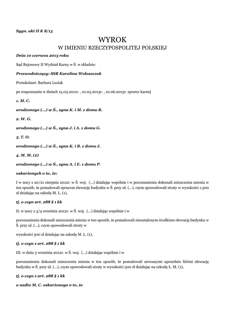 Sygn. akt II K 8/13 WYROK W IMIENIU RZECZYPOSPOLITEJ POLSKIEJ Dnia 10 czerwca 2013 roku Sąd Rejonowy II Wydział Karny w Ś. w składzie: Przewodniczący: SSR Karolina Wołoszczuk Protokolant: Barbara Lesiak po rozpoznaniu w dniach 15.03.2011r. , 10.05.2013r. , 10.06.2013r. sprawy karnej 1. M. C. urodzonego (...) w Ś., syna K. i M. z domu R. 2. W. G. urodzonego (...) w Ś., syna J. i A. z domu G. 3. T. O. urodzonego (...) w Ś., syna K. i B. z domu J. 4. M. M. (2) urodzonego (...) w Ś., syna A. i E. z domu P. oskarżonych o to, że: I w nocy z 20/21 sierpnia 2012r. w Ś. woj. (...) działając wspólnie i w porozumieniu dokonali zniszczenia mienia w ten sposób, że pomalowali sprayem elewację budynku w Ś. przy ul. (...), czym spowodowali straty w wysokości 1.500 zł działając na szkodę M. L. (1), tj. o czyn art. 288 § 1 kk II. w nocy z 3/4 września 2012r. w Ś. woj. (...) działając wspólnie i w porozumieniu dokonali zniszczenia mienia w ten sposób, że pomalowali nieustalonym środkiem elewację budynku w Ś. przy ul. (...), czym spowodowali straty w wysokości 500 zł działając na szkodę M. L. (1), tj. o czyn z art. 288 § 1 kk III. w dniu 3 września 2012r. w Ś. woj. (...) działając wspólnie i w porozumieniu dokonali zniszczenia mienia w ten sposób, że pomalowali zerwanymi uprzednio liśćmi elewację budynku w Ś. przy ul. (...), czym spowodowali straty w wysokości 300 zł działając na szkodę Ł. M. (1), tj. o czyn z art. 288 § 1 kk a nadto M. C. oskarżonego o to, że IV. w dniu 4 września 2012r. w Ś. woj. (...) działając wbrew przepisom ustawy posiadał środek odurzający w postaci marihuany w łącznej ilości 1,18 grama, tj. o czyn z art. 62 ust. 1 ustawy z dnia 29.07.2005r. o przeciwdziałaniu narkomanii a nadto T. O. oskarżonego o to, że V. w dniu 3 października 2012r. w Ś. woj. (...) przy użyciu łomu oraz kopiąc rolety aluminiowe usiłował dokonać włamania do sklepu (...) przy ul. (...), lecz zamierzonego celu nie osiągnął z uwagi na spłoszenie go, przy czym spowodował stratę w wysokości 300 zł na szkodę M. L. (2), tj. o czyn z art. 13 § 1 kk w zw. z art. 279 § 1 kk VI w dniu 3 października 2012r. w Ś. woj. (...) działając wbrew przepisom ustawy posiadał środek odurzający w postaci marihuany w łącznej ilości 0,41 grama przyjmując wypadek mniejszej wagi, tj. o czyn z art. 62 ust. 1 i 3 ustawy z dnia 29.07.2005r. o przeciwdziałaniu narkomanii I. W ramach czynów opisanych w pkt I i II części wstępnej wyroku oskarżonych M. C., W. G., T. O., M. M. (2) uznaje za winnych popełnienia czynów polegających na tym, że: - w nocy z 20/21 sierpnia 2012r. w Ś. woj. (...) działając wspólnie i w porozumieniu umyślnie dokonali zniszczenia mienia w ten sposób, że pomalowali zerwanymi uprzednio liśćmi elewację budynku w Ś. przy ul. (...), czym spowodowali straty w wysokości 200 zł działając na szkodę M. L. (1), - w nocy z 3/4 września 2012r. w Ś. woj. (...) działając wspólnie i w porozumieniu umyślnie dokonali zniszczenia mienia w ten sposób, że pomalowali zerwanymi uprzednio liśćmi elewację budynku w Ś. przy ul. (...), czym spowodowali straty w wysokości 200 zł działając na szkodę M. L. (1), tj. wykroczeń z art. 124 §1 kw i za te wykroczenia na podstawie powołanego przepisu w zw. z art. 9§2 kw wymierza każdemu z oskarżonych karę 1 (jednego) miesiąca ograniczenia wolności zobowiązując oskarżonych do wykonywania w trakcie odbywania kary ograniczenia wolności nieodpłatnej, kontrolowanej pracy na cele społeczne w wymiarze 30 (trzydziestu) godzin w stosunku miesięcznym; II. na podstawie art. 124 §4 kw zobowiązuje oskarżonych M. C., W. G., T. O., M. M. (2) do przywrócenia do stanu poprzedniego elewacji budynku mieszczącego się w Ś. przy ulicy (...); III. oskarżonych M. C., W. G., T. O., M. M. (2) uznaje za winnych popełnienia czynu opisanego w pkt III części wstępnej wyroku z tym, że przyjmuje, iż wysokość szkody wynosi nie mniej niż 450 zł (czterysta pięćdziesiąt złotych), tj. występku z art. 288§1 kk i za ten czyn na podstawie powołanego przepisu wymierza każdemu z oskarżonych karę w wymiarze 4 (czterech) miesięcy pozbawienia wolności; IV. oskarżonego M. C. uznaje za winnego popełnienia zarzucanego mu czynu opisanego w pkt IV części wstępnej wyroku, tj. występku z art. 62 ust. 1 ustawy z dnia 29 lipca 2005 roku o przeciwdziałaniu narkomanii i za ten czyn na podstawie powołanego przepisu wymierza mu karę 3 (trzech) miesięcy pozbawienia wolności; V. oskarżonego T. O. uznaje za winnego popełnienia czynu polegającego na tym , że w dniu 3 października 2012r. w Ś. woj. (...) przy użyciu łomu oraz kopiąc rolety aluminiowe usiłował dostać się do wnętrza sklepu (...) przy ul. (...), celem kradzieży znajdującego się tam mienia o nieustalonej wartości powodując jednocześnie zniszczenie rolety antywłamaniowej czym spowodował szkodę w wysokości 615,00 zł na rzecz M. L. (2), lecz zamierzonego celu nie osiągnął z uwagi na spłoszenie go, tj. występku z art. 13§1 kk w zw. z art. 279§1 kk i z art. 288 §1 kk w zw. z art. 11 §2 kk i za ten czyn na podstawie art. 14 §1 kk w zw. z art. 279§1 kk w zw. z art. 11 § 3 kk wymierza oskarżonemu karę 1 (jednego) roku pozbawienia wolności; VI. oskarżonego T. O. uznaje za winnego popełnienia zarzucanego mu czynu opisanego w pkt VI części wstępnej wyroku, tj. występku z art. 62 ust. 1 i 3 ustawy z dnia 29 lipca 2005 roku o przeciwdziałaniu narkomanii i za ten czyn na podstawie art. 62 ust. 3 ustawy z dnia 29 lipca 2005 roku o przeciwdziałaniu narkomanii wymierza mu karę 1 (jednego) miesiąca pozbawienia wolności; VII. na podstawie art. 85 kk i art. 86 § 1 kk łączy kary orzeczone w pkt III i IV części dyspozytywnej wyroku i wymierza oskarżonemu M. C. karę łączną 6 (sześciu) miesięcy pozbawienia wolności; VIII. na podstawie art. 85 kk i art. 86 § 1 kk łączy
