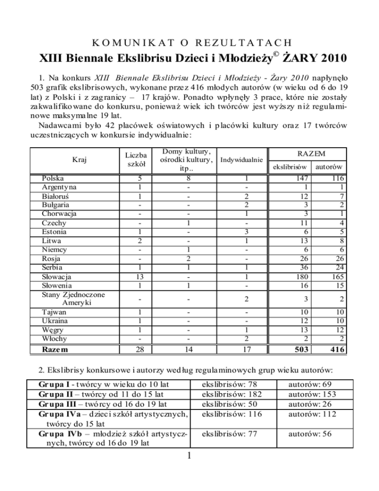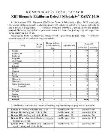 K O M UN I K A T O R E Z U L T A T A C H XIII Biennale Ekslibrisu Dzieci i Młodzieży© ŻARY 2010 1. Na konkurs XIII Biennale Ekslibrisu Dzieci i Młodzieży - Żary 2010 napłynęło 503 grafik ekslibrisowych, wykonane przez 416 młodych autorów (w wieku od 6 do 19 lat) z Polski i z zag ranicy – 17 krajó w. Ponadto wpłynęły 3 prace, które nie zostały zakwalifiko wane do konkursu, ponieważ wiek ich twórców jest wyższy n iż regulaminowe maksymalne 19 lat. Nadawcami było 42 placówek oświatowych i p lacówki kultury oraz 17 t wórców uczestniczących w konkursie indywidualnie: Kraj Liczba szkół Polska Argentyna Białoruś Bułgaria Chorwacja Czechy Estonia Litwa Niemcy Rosja Serbia Słowacja Słowenia Stany Zjednoczone Ameryki Tajwan Ukraina Węgry Włochy 5 1 1 1 2 1 13 1 Razem Domy kultury, ośrodki kultury, Indywidualnie itp.. 8 1 2 2 1 1 3 1 1 2 1 1 1 1 - RAZEM ekslibrisów autorów 147 1 12 3 3 11 6 13 6 26 36 180 16 116 1 7 2 1 4 5 8 6 26 24 165 15 - - 2 3 2 1 1 1 - - 1 2 10 12 13 2 10 10 12 2 28 14 17 503 416 2. Ekslibrisy konkursowe i autorzy wed ług regulaminowych grup wieku autorów: Grupa I - t wórcy w wieku do 10 lat Grupa II – twórcy od 11 do 15 lat Grupa III – twó rcy od 16 do 19 lat Grupa IVa – d zieci szkół artystycznych, twórcy do 15 lat Grupa IVb – młodzież szkó ł artystycznych, twórcy od 16 do 19 lat 1 ekslibrisów: 78 ekslibrisów: 182 ekslibrisów: 50 ekslibrisów: 116 autorów: 69 autorów: 153 autorów: 26 autorów: 112 ekslibrisów: 77 autorów: 56 3. Organizator – Miejska Biblioteka Publiczna w Żarach przedkłada je, stosownie do regulaminu, pod ocenę JURY, które obradowało 18 czerwca 2010 r. pod przewodnictwem artysty plastyka Marka Głowackiego. 4. J UR Y pos tanowił o przyznać następujące nagrody i wyróżnieni a; (laur eaci równorzędni wym ienieni w porządku alfabetycznym) Gru pa I – autorzy ekslibrisów w wieku do 10 lat: NAGRODA 1.: - Xun Yi Cai (7 lat), Taipei city Rixin Primary School – Tajwan NAGRODA 2.: - Oliwia Gólska (9 lat), Szkoła Podst awowa Nr 1, Żary – Polska - Damian N guyen Ba (8 lat), Szkoła P odstawow a Nr 1, Żary – Polska NAGRODY 3.: - Anna Be dnarek (10 lat), M łodzieżowy Dom Kultury, Częstochow a – Polska - M arta S woszowska (10 lat) ) - M łodzieżowy Dom Kultury, Gliwice – Polska - Aleksandra Zychla (10 lat), Szkoła Podstawow a Nr 1, Ż ary – Polska WYRÓŻNIENIA : - Katarzyna Górka (10 lat), Zespół Szkół Społecznych STO, Augustów – Polska - M aria Jarkiewicz (10 lat), Pow. M łodzieżowy Dom Kultury, Nowy Targ – Polska - Viola Kovács (10 lat), M adars ki K ulturni Centar N EPKER, Subotica – S erbia - Gleb Lissovsk y (10 lat), „StArtAcademy”, Sankt Petersburg – Rosja -Julia Opania (10 lat) - M łodz ieżowy Dom Kultury, Gliwice – Polska Gru pa II – autorzy w wieku od 11 do 15 lat: NAGRODA 1.: - Endre Köteles (13 lat), M adarski K ulturni Centar N EPKER, Subotica – S erbia - M arek Petřík (12 lat), M ĕstský Dúm Détí a M ládeže, Týn nad Vltavou – Czechy NAGRODY 2.: - Katarzyna Mrożek (15 lat), Pow. M łodzieżowy Dom Kultury, Nowy Targ – Polska - Weicheng Wu (13 lat), Taipei country Fu-Ying Junior High School – Tajwan NAGRODY 3.: - M iriam Barutiaková (15 lat), P úchov – S łowacja - Katia Lazar (14 lat), M ińsk – Białoruś WYRÓŻNIENIA : - Barbara Banaszak (11 lat), M łodzieżowy Dom K ultury, G liw ice – Polska - Ziying Chen (13 lat), Taipei country Fu-Ying Junior High School – Tajwan - Julita Femlak (12 lat), Szkoła Podstawow a Nr 1, Żary – Polska - Alexandra Ivanova (11 lat), „StArtAcademy”, Sankt Petersburg – Rosja Gru pa III - – autorzy w wieku od 16 do 19 lat: NAGRODA 1.: - Klaudia Kolovics (18 lat), M adarski Kulturni Centar NEPK ER, Subotica – S erbia NAGRODA 2.: - Gytis Budavičius (19 lat), Panevėžio raj. – Litwa - M ichael Horák (19 lat), M ĕstský Dúm Détí a M ládeže, Týn nad Vltavou – Czechy 2 NAGRODA 3.: - M arius Balčiūnas (18 lat), „Saulėt ekis ” Gymnasium, Šiauliai – Litwa - Luka Gabriel (17 lat), II gimnazja, M aribor – S łowenia - Ivona Me dić (16 lat), M adars ki K ulturni Centar N EPKER, Subotica – S erbia WYRÓŻNIEN IA: - M arija Ambras aitė (18 lat), „Saulėtekis” Gymnas ium, Šiauliai – Litwa - M ichaela Kielarová ( 17 lat), M ĕstský Dúm Détí a M ládeže, Týn nad Vltavou – Czechy - Klaudia Kolovics (18 lat), M adarski Kulturni Centar NEPK ER, Subotica – S erbia - Ivona Me dić (16 lat), M adars ki K ulturni Centar N EPKER, Subotica – S erbia - Sylw ia Wojciechowska (16 lat), M iędzyszkolna Św iet lica M łodzieżow a, Siedlce – Polska Gru pa IV – dzieci i młodzież szkół artystycznych Jury postanawia w tej grupie podzielić uczniów z uwz ględnieniem ich w ieku, to jest uczniowie do lat 15 i uczniow ie od lat 16. Grupa młodsz a do 15 lat: NAGRODA 1.: - M ária S edláková (13 lat), Cerkevná základná umelecká š kola sv. M ikuláša, Preš ov S łowacja NAGRODY 2.: - Natália Kováčová (15 lat), Základná umelecká škola, Prievidza – Słowacja - Klára Lepišová (7 lat), Základná umelecká škola Frica Kafendu, Vrútky – S łowacja NAGRODA 3.: - Elenka Valašíková (9 lat), Základná umelecká škola Frica Kafendu, Vrútky – S łowacja WRÓŻNIENIA : - Daniel Bu bla (12 lat), Súkromná základná umelecká škola, M ichalovce - S łowacja - M onika Murgová (10 lat), Súkromná základná umelecká škola, M ichalovce – S łowacja - M artin Pavolko (14 lat), Súkromná základná umelecká škola, M ichalovce - S łowacja Grupa młodzi eży – od 16 do 19 lat: NAGRODA 1.: - M artina Rusnáková (19 lat), Škola úžitkového výtvarníctva, Kremnica – S łowacja NAGRODY 2.: - Erik Koš ťál (16 lat), Škola úžitkového výtvarníctva Josefa Vydru, Bratis lava – S łowacja - Ksenia Š pakovsk aja (18 lat), Koht la-Järve – Estonia NAGRODY 3.: - Anna Hudecová (19 lat), Škola 