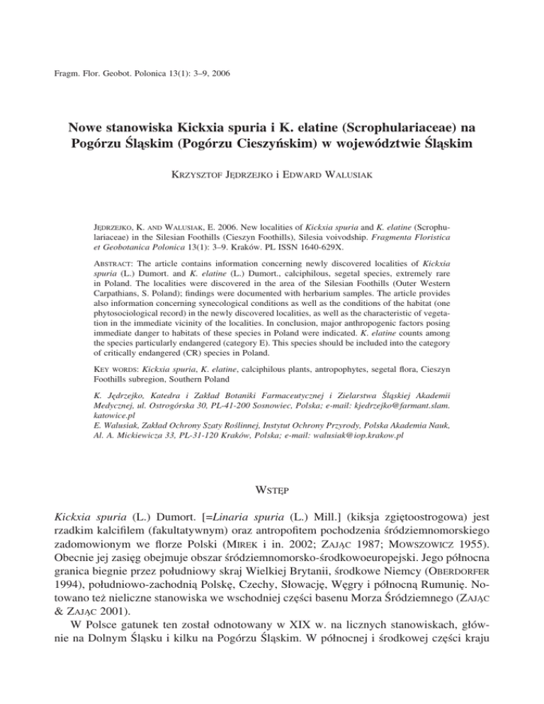 Fragm. Flor. Geobot. Polonica 13(1): 3–9, 2006 Nowe stanowiska Kickxia spuria i K. elatine (Scrophulariaceae) na Pogórzu Śląskim (Pogórzu Cieszyńskim) w województwie Śląskim KRZYSZTOF JĘDRZEJKO i EDWARD WALUSIAK JĘDRZEJKO, K. AND WALUSIAK, E. 2006. New localities of Kickxia spuria and K. elatine (Scrophulariaceae) in the Silesian Foothills (Cieszyn Foothills), Silesia voivodship. Fragmenta Floristica et Geobotanica Polonica 13(1): 3–9. Kraków. PL ISSN 1640-629X. ABSTRACT: The article contains information concerning newly discovered localities of Kickxia spuria (L.) Dumort. and K. elatine (L.) Dumort., calciphilous, segetal species, extremely rare in Poland. The localities were discovered in the area of the Silesian Foothills (Outer Western Carpathians, S. Poland); findings were documented with herbarium samples. The article provides also information concerning synecological conditions as well as the conditions of the habitat (one phytosociological record) in the newly discovered localities, as well as the characteristic of vegetation in the immediate vicinity of the localities. In conclusion, major anthropogenic factors posing immediate danger to habitats of these species in Poland were indicated. K. elatine counts among the species particularly endangered (category E). This species should be included into the category of critically endangered (CR) species in Poland. KEY WORDS: Kickxia spuria, K. elatine, calciphilous plants, antropophytes, segetal flora, Cieszyn Foothills subregion, Southern Poland K. Jędrzejko, Katedra i Zakład Botaniki Farmaceutycznej i Zielarstwa Śląskiej Akademii Medycznej, ul. Ostrogórska 30, PL-41-200 Sosnowiec, Polska; e-mail: [email protected]. katowice.pl E. Walusiak, Zakład Ochrony Szaty Roślinnej, Instytut Ochrony Przyrody, Polska Akademia Nauk, Al. A. Mickiewicza 33, PL-31-120 Kraków, Polska; e-mail: [email protected] WSTĘP Kickxia spuria (L.) Dumort. [=Linaria spuria (L.) Mill.] (kiksja zgiętoostrogowa) jest rzadkim kalcifilem (fakultatywnym) oraz antropofitem pochodzenia śródziemnomorskiego zadomowionym we florze Polski (MIREK i in. 2002; ZAJĄC 1987; MOWSZOWICZ 1955). Obecnie jej zasięg obejmuje obszar śródziemnomorsko-środkowoeuropejski. Jego północna granica biegnie przez południowy skraj Wielkiej Brytanii, środkowe Niemcy (OBERDORFER 1994), południowo-zachodnią Polskę, Czechy, Słowację, Węgry i północną Rumunię. Notowano też nieliczne stanowiska we wschodniej części basenu Morza Śródziemnego (ZAJĄC & ZAJĄC 2001). W Polsce gatunek ten został odnotowany w XIX w. na licznych stanowiskach, głównie na Dolnym Śląsku i kilku na Pogórzu Śląskim. W północnej i środkowej części kraju 4 Fragm. Flor. Geobot. Polonica 13(1), 2006 pojawia się jako efemerofit m.in. w Gdańsku (SCHWARZ 1967) i Warszawie (ROSTAFIŃSKI 1872). Z początkiem XX w. podano go z Bogacic k. Kluczborka i Gołostowic (SCHUBE 1919). Po 1980 r. znaleziono go na dwóch stanowiskach, w Szczepanowicach koło Wrocławia (okazy: 1985, leg. J. Anioł-Kwiatkowska, WRO) i w Krzanowicach k. Opola (KĄCKI i in. 1999). Został też odnotowany w Owczarach koło Buska-Zdroju (1971, leg. R. Ochyra KRAM 226419). W XIX w. podawany był również z Pogórza Cieszyńskiego (zachodnia część Pogórza Śląskiego) ze stanowisk: Grodziec, Wapienica i Lipnik (BAIER 1887) i z Beskidu Śląskiego – Ustroń (OBORNY 1885) oraz Doliny Górnej Wisły – Ochaby (WIMMER 1857). Według ZAJĄCA i ZAJĄC (2001): „stanowiska te nie zostały później potwierdzone, nie są też udokumentowane okazami zielnikowymi, a ze względu na brak odpowiednich siedlisk nasuwają wątpliwości co do poprawności oznaczenia”. Po dłuższej przerwie gatunek ten odnotowano w Grodźcu Śląskim (ZAJĄC 1989; okaz: 05.08.1987, leg. M. Zając, KRA 241615). Jednak w późniejszym opracowaniu (ZAJĄC & ZAJĄC 2001) nie uwzględniono tego stanowiska (?). Zgodnie z takim stanem, stanowisko Kickxia spuria znalezione przez autorów w Skoczowie (25.07.2003, leg. K. Jędrzejko & E. Walusiak) jest nowe i jednocześnie pierwsze po 117 latach w mezoregionie Pogórza Śląskiego, które udokumentowano alegatem zielnikowym (KRAM 507942). Ryc. 1. Położenie nowego stanowiska Kickxia spuria (L.) Dumort. w Skoczowie na Pogórzu Śląskim. ● – nowe stanowisko gatunku Fig. 1. Position of the new locality of Kickxia spuria (L.) Dumort. in Skoczów in the Silesian Piedmont region. ● – new locality of this species K. Jędrzejko & E. Walusiak: Kickxia spuria i K. elatine na Pogórzu Śląskim 5 Omawiane stanowisko (współrzędne geograficzne: N 49°47,758′, E 18°46,654′; ATPOL: DF 91, wysokość względna – ok. 330 m n.p.m.; Ryc.1) od północy przylega bezpośrednio do skraju cmentarza rzymsko-katolickiego, od wschodu do zwartego lasu grądowego Tilio cordatae-Carpinetum betuli Tracz. 1962, porastającego stromy stok głębokiego jaru, a także do okrajkowego pasa ciepłolubnej murawy Trifolio-Melampyretum nemorosi Pass. 1967. Natomiast od południa i zachodu otaczają go powierzchniowo niewielkie, przydomowe sady rosnące tuż przy drodze dojazdowej do zabudowań mieszkalnych i gospodarczych. Kiksja zgiętoostrogowa (Ryc. 2) występuje w uprawach na glebach piaszczystych (MOWSZOWICZ 1955) i rędzinowych jako chwast segetalny, gdzie również tworzy własny zespół. Jest gatunkiem charakterystycznym i wyróżniającym dla Kickxietum spuriae Krusem. et Vlieg. 1939 ze związku Caucalidion lappulae, z rzędu Centauretalia cyani i klasy Stellarietea mediae. Zbiorowisko to najczęściej rozwija się w uprawach pszenicy, rzadziej rzepaku lub jęczmienia, na bardzo żyznych glebach o odczynie zasadowym lub obojętnym, zasobnych w węglan wapnia (MATUSZKIEWICZ 2001). Ryc. 2. Kwitnący okaz Kickxia spuria (L.) Dumort. na nowoodkrytym stanowisku w Skoczowie (2004 r.) Fig. 2. Flowering specimen of Kickxia spuria (L.) Dumort. in the newly discovered locality in Skoczów (2004 year) 6 Fragm.
