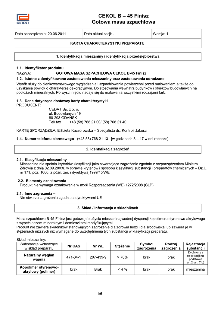 CEKOL B – 45 Finisz Gotowa masa szpachlowa Data sporządzenia: 20.06.2011 Data aktualizacji: - Wersja: 1 KARTA CHARAKTERYSTYKI PREPARATU 1. Identyfikacja mieszaniny i identyfikacja przedsiębiorstwa 1.1. Identyfikator produktu NAZWA: GOTOWA MASA SZPACHLOWA CEKOL B-45 Finisz 1.2. Istotne zidentyfikowane zastosowania mieszaniny oraz zastosowania odradzane Wyrób służy do cienkowarstwowego wygładzania i szpachlowania powierzchni przed malowaniem a także do uzyskania powłok o charakterze dekoracyjnym. Do stosowania wewnątrz budynków i obiektów budowlanych na podłożach mineralnych. Po wyschnięciu nadaje się do malowania wszystkimi rodzajami farb. 1.3. Dane dotyczące dostawcy karty charakterystyki PRODUCENT: CEDAT Sp. z o. o. ul. Budowlanych 19 80-298 GDAŃSK Tel/ fax +48 (58) 768 21 00/ (58) 768 21 40 KARTĘ SPORZĄDZIŁA: Elżbieta Kaczorowska – Specjalista ds. Kontroli Jakości 1.4. Numer telefonu alarmowego (+48 58) 768 21 13 [w godzinach 8 – 17 w dni robocze] 2. Identyfikacja zagrożeń 2.1. Klasyfikacja mieszaniny Mieszanina nie spełnia kryteriów klasyfikacji jako stwarzająca zagrożenie zgodnie z rozporządzeniem Ministra Zdrowia z dnia 02.09.2003r. w sprawie kryteriów i sposobu klasyfikacji substancji i preparatów chemicznych – Dz.U. nr 171, poz. 1666; z późn. zm. i dyrektywą 1999/45/WE 2.2. Elementy oznakowania Produkt nie wymaga oznakowania w myśl Rozporządzenia (WE) 1272/2008 (CLP) 2.1. Inne zagrożenia – Nie stwarza zagrożenia zgodnie z dyrektywami UE 3. Skład / Informacja o składnikach Masa szpachlowa B-45 Finisz jest gotową do użycia mieszaniną wodnej dyspersji kopolimeru styrenowo-akrylowego z wypełniaczem mineralnym i domieszkami modyfikującymi. Produkt nie zawiera składników stanowiących zagrożenie dla zdrowia ludzi i dla środowiska lub zawiera je w stężeniach niższych niż wymagane do uwzględnienia tych substancji w klasyfikacji preparatu. Skład mieszaniny: Substancje wchodzące w skład preparatu Nr CAS Nr WE Stężenie Symbol zagrożenia Rodzaj zagrożenia Rejestracja substancji Naturalny węglan wapnia 471-34-1 207-439-9 > 70% brak brak Zwolniony z rejestracji na podstawie art.2 ust. 7 b) Kopolimer styrenowoakrylowy (polimer) brak Brak <4% brak brak mieszanina 1/6 CEKOL B – 45 Finisz Gotowa masa szpachlowa 4. Środki pierwszej pomocy 4.1. Opis środków pierwszej pomocy 4.1.1. WSKAZÓWKI OGÓLNE Należy przestrzegać ogólnych zasad bhp. W przypadku wystąpienia jakichkolwiek niepokojących objawów wezwać natychmiast lekarza lub odwieźć poszkodowanego do szpitala, pokazać opakowanie. 4.1.2. DROGI ODDECHOWE: Nie dotyczy 4.1.3. KONTAKT ZE SKÓRĄ Zdjąć zanieczyszczoną odzież, przemyć skórę letnią wodą z mydłem i spłukać. Jeżeli objawy podrażnienia utrzymują się zwrócić się o pomoc medyczną. 4.1.4. KONTAKT Z OCZAMI Natychmiast przemywać oczy dużą ilością wody przez ok. 15 min (przy podwiniętych powiekach); unikać silnego strumienia wody ze względu na ryzyko uszkodzenia rogówki. W przypadku zanieczyszczenia jednego oka, w trakcie przemywania chronić drugie oko przed zanieczyszczeniem. Jeżeli objawy podrażnienia utrzymują się wezwać lekarza. 4.1.5. DROGI POKARMOWE Osobie nieprzytomnej lub półprzytomnej nie podawać nic do picia; jeżeli osoba jest przytomna, przepłukać usta i podać wodę do picia. Skonsultować się z lekarzem. W żadnym wypadku nie prowokować wymiotów, ponieważ istnieje ryzyko zachłyśnięcia się i przedostania się treści żołądka do płuc. 4.2. Najważniejsze ostre i opóźnione objawy oraz skutki narażenia Nie prowadzono badań. 4.3. Wskazania dotyczące wszelkiej natychmiastowej pomocy lekarskiej i szczególnego postępowania z poszkodowanym. Brak wskazań. 5. Postępowanie w przypadku pożaru 5.1. Środki gaśnicze Stosować środki gaśnicze właściwe dla danego otoczenia. Środki gaśnicze, których nie wolno używać ze względów bezpieczeństwa - Nie dotyczy 5.2. Szczególne zagrożenia związane z mieszaniną Zagrożenie wynikające z właściwości preparatu, produktów spalania, powstających gazów - Nie dotyczy 5.3. Informacje dla straży pożarnej Środki ochrony indywidualnej dla strażaków - Używać środków właściwych dla pożaru 6. Postępowanie w przypadku niezamierzonego uwolnienia do środowiska 6.1. Indywidualne środki ostrożności, wyposażenie ochronne i procedury w sytuacjach awaryjnych: - unikać zanieczyszczenia oczu - w przypadku zanieczyszczenia oczu przemyć dużą ilością wody - unikać kontaktu ze skórą - nosić odzież ochronną - nosić rękawice ochronne 6.2. Środki ostrożności w zakresie ochrony środowiska Produkt jest gęstą pastą i samorzutnie nie rozprzestrzenia się po powierzchni. Niemniej należy unikać przedostania się mieszaniny do kanalizacji, wód powierzchniowych i gruntowych. 6.3. Metody i materiały zapobiegające rozprzestrzenianiu się skażenia i służące do usuwania skażenia Miejsce awarii można obwałować. Produkt zebrać mechaniczne dostępnymi środkami. Nie są wymagane specjalne środki do usuwania awarii. 2/6 CEKOL B – 45 Finisz Gotowa masa szpachlowa 6.4. Odniesienia do innych sekcji Zebrany materiał usuwać zgodnie z obowiązującymi przepisami i postępować w sposób opisany w sekcji 13 – postępowanie z odpadami. 7. Postępowanie z mieszaniną oraz jej magazynowanie 7.1. Środki ostrożności dotyczące bezpiecznego postępowania - trzymać z daleka od dzieci; - używać środków ochrony osobistej; - postępować zgodnie z zasadami bezpieczeństwa i higieny pracy. 7.2. Warunki bezpiecznego magazynowania, łącznie z informacjami dotyczącymi wszelkich wzajemnych niezgodności - przechowywać mieszaninę w zamkniętym opakowaniu; - zabezpieczyć przed czynnikami atmosferycznymi; - zaleca się przechowywanie substancji w oryginalnych opakowaniach. 7.3. Szczególne zastosowania końcowe Nie dotyczy 8. Kontrola narażenia / środki ochrony indywidualnej 8.1. Param