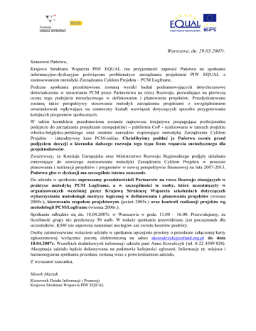 Warszawa, dn. 29.03.2007r. Szanowni Państwo, Krajowa Struktura Wsparcia PIW EQUAL ma przyjemność zaprosić Państwa na spotkanie informacyjno-dyskusyjne poświęcone problematyce zarządzania projektami PIW EQUAL z zastosowaniem metodyki Zarządzania Cyklem Projektu – PCM Logframe. Podczas spotkania przedstawione zostaną wyniki badań podsumowujących dotychczasowe doświadczenia w stosowaniu PCM przez Partnerstwa na rzecz Rozwoju, pozwalające na pierwszą ocenę tego podejścia metodycznego w definiowaniu i planowaniu projektów. Przedyskutowane zostaną także perspektywy stosowania metodyk zarządzania projektami z uwzględnieniem uwarunkowań wpływające na ostateczny kształt rozwiązań dotyczących sposobu przygotowania kolejnych programów społecznych. W takim kontekście przedstawiona zostanie najnowsza inicjatywa propagującą profesjonalne podejście do zarządzania projektami europejskimi – paltforma CoP - realizowana w ramach projektu włosko-belgijsko-polskiego oraz ostatnie narzędzie wspierające metodykę Zarządzania Cyklem Projektu – interaktywny kurs PCM-online. Chcielibyśmy poddać je Państwa ocenie przed podjęciem decyzji o kierunku dalszego rozwoju tego typu form wsparcia metodycznego dla projektodawców. Zważywszy, że Komisja Europejska oraz Ministerstwo Rozwoju Regionalnego podjęły działania zmierzające do szerszego zastosowania metodyki Zarządzania Cyklem Projektu w procesie planowania i realizacji projektów i programów w nowej perspektywie finansowej na lata 2007-2013, Państwa głos w dyskusji ma szczególnie istotne znaczenie. Do udziału w spotkaniu zapraszamy przedstawicieli Partnerstw na rzecz Rozwoju stosujących w praktyce metodykę PCM Logframe, a w szczególności te osoby, które uczestniczyły w organizowanych wcześniej przez Krajową Strukturę Wsparcia szkoleniach dotyczących wykorzystania metodologii matrycy logicznej w definiowaniu i planowaniu projektów (wiosna 2005r.), kierowania zespołem projektowym (jesień 2005r.) oraz kontroli realizacji projektu wg metodologii PCM/Logframe (wiosna 2006r.). Spotkanie odbędzie się dn. 18.04.2007r. w Warszawie w godz. 11.00 – 16.00. Przewidujemy, że liczebność grupy nie przekroczy 50 osób. W trakcie spotkania przewidziany jest poczęstunek dla uczestników. KSW nie zapewnia natomiast noclegów ani zwrotu kosztów podróży. Osoby zainteresowane wzięciem udziału w spotkaniu uprzejmie prosimy o przesłanie załączonej karty zgłoszeniowej wyłącznie pocztą elektroniczną na adres [email protected] do dnia 10.04.2007r. Wszelkich dodatkowych informacji udziela pani Anna Kowalczyk (tel. 0-22 4509 828). Akceptacja udziału będzie dokonywana na podstawie kolejności zgłoszeń. Informacje nt. miejsca i harmonogramu spotkania przesłane zostaną wraz z potwierdzeniem udziału. Z wyrazami szacunku, Marek Maziuk Kierownik Działu Informacji i Promocji Krajowa Struktura Wsparcia PIW EQUAL
