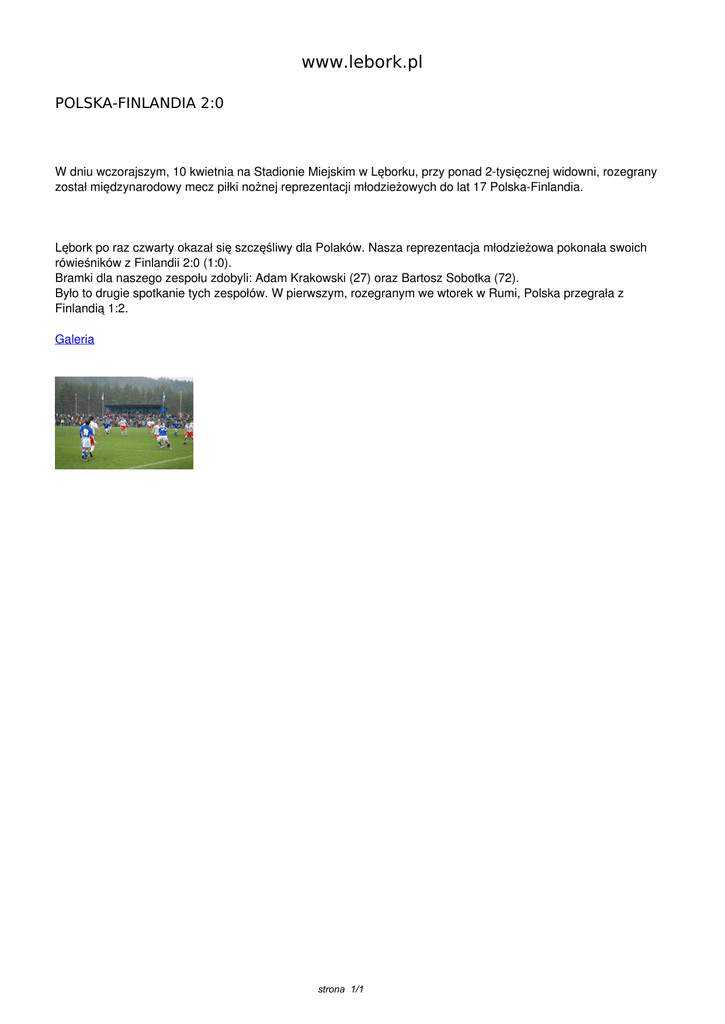 www.lebork.pl POLSKA-FINLANDIA 2:0 W dniu wczorajszym, 10 kwietnia na Stadionie Miejskim w Lęborku, przy ponad 2-tysięcznej widowni, rozegrany został międzynarodowy mecz piłki nożnej reprezentacji młodzieżowych do lat 17 Polska-Finlandia. Lębork po raz czwarty okazał się szczęśliwy dla Polaków. Nasza reprezentacja młodzieżowa pokonała swoich rówieśników z Finlandii 2:0 (1:0). Bramki dla naszego zespołu zdobyli: Adam Krakowski (27) oraz Bartosz Sobotka (72). Było to drugie spotkanie tych zespołów. W pierwszym, rozegranym we wtorek w Rumi, Polska przegrała z Finlandią 1:2. Galeria strona 1/1 Powered by TCPDF (www.tcpdf.org)