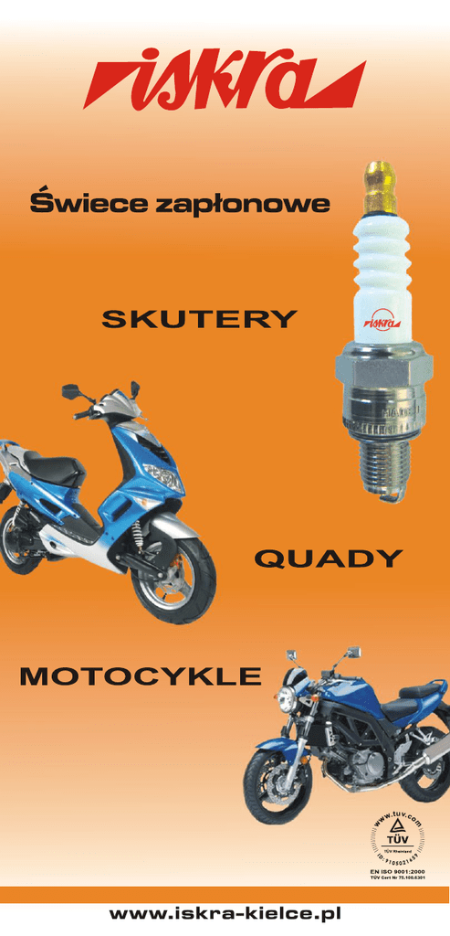 TÜV Cert Nr 75.100.6301 www.iskra-kielce.pl Œwieca zap³onowa ISKRA T90/C7HSA znajduje zastosowanie w wiêkszoœci typów skuterów dostêpnych na polskim rynku. Zapewnia wy¿sz¹ skutecznoœæ zap³onu oraz u³atwia rozruch silnika, zw³aszcza zimnego. Œwieca dostosowana jest do ekstremalnych warunków pracy silnika. ISKRA produkuje szeroki zakres œwiec zap³onowych przeznaczonych do silników motocyklowych i quadów. Pe³ny wykaz zastosowañ œwiec ISKRA do skuterów, motocykli oraz quadów dostêpny jest w materia³ach informacyjnych i w sklepach motoryzacyjnych. ISKRA Zak³ady Precyzyjne jest jedynym polskim producentem œwiec zap³onowych i ¿arowych o ponad 50-cio letniej tradycji. W ofercie firmy znajduje siê ponad 160 typów œwiec do samochodów osobowych wiêkszoœci marek, a tak¿e do skuterów, motocykli i sprzêtu ogrodniczego. Aby uzyskaæ wiêcej informacji prosimy o kontakt: ISKRA Zak³ady Precyzyjne Sp. z o.o. ul. Mielczarskiego 47, 25-709 Kielce tel.: 0-41 365 52 22-23; fax: 0-41 365 52 60 e-mail: [email protected] www.iskra-kielce.pl Ver.1/V.07
