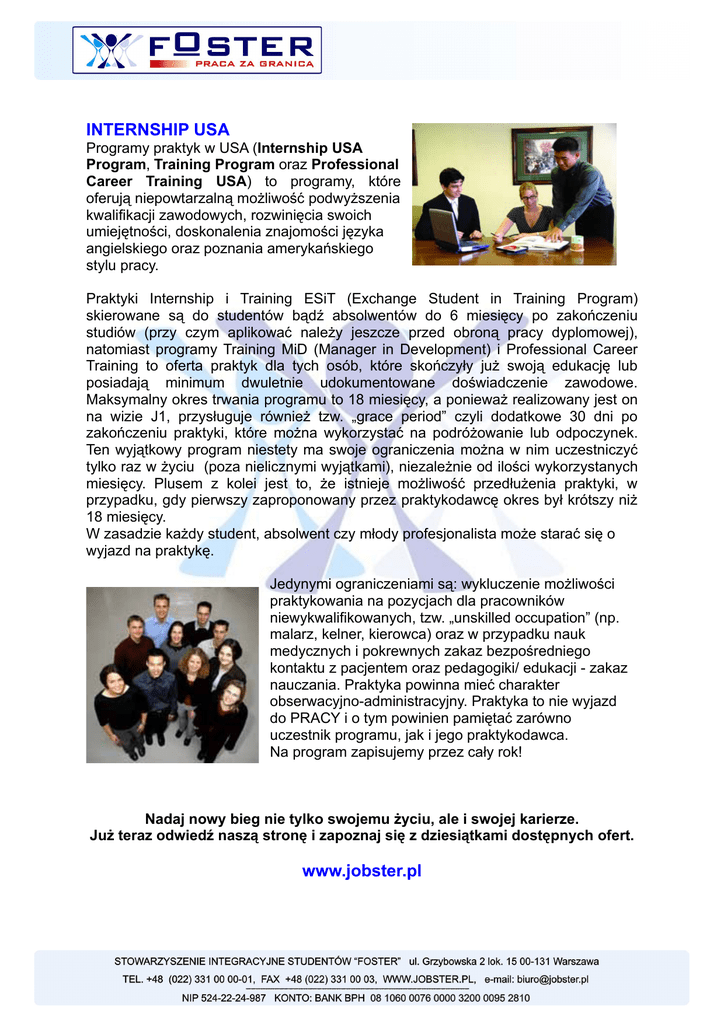 INTERNSHIP USA Programy praktyk w USA (Internship USA Program, Training Program oraz Professional Career Training USA) to programy, które oferują niepowtarzalną możliwość podwyższenia kwalifikacji zawodowych, rozwinięcia swoich umiejętności, doskonalenia znajomości języka angielskiego oraz poznania amerykańskiego stylu pracy. Praktyki Internship i Training ESiT (Exchange Student in Training Program) skierowane są do studentów bądź absolwentów do 6 miesięcy po zakończeniu studiów (przy czym aplikować należy jeszcze przed obroną pracy dyplomowej), natomiast programy Training MiD (Manager in Development) i Professional Career Training to oferta praktyk dla tych osób, które skończyły już swoją edukację lub posiadają minimum dwuletnie udokumentowane doświadczenie zawodowe. Maksymalny okres trwania programu to 18 miesięcy, a ponieważ realizowany jest on na wizie J1, przysługuje również tzw. „grace period” czyli dodatkowe 30 dni po zakończeniu praktyki, które można wykorzystać na podróżowanie lub odpoczynek. Ten wyjątkowy program niestety ma swoje ograniczenia można w nim uczestniczyć tylko raz w życiu (poza nielicznymi wyjątkami), niezależnie od ilości wykorzystanych miesięcy. Plusem z kolei jest to, że istnieje możliwość przedłużenia praktyki, w przypadku, gdy pierwszy zaproponowany przez praktykodawcę okres był krótszy niż 18 miesięcy. W zasadzie każdy student, absolwent czy młody profesjonalista może starać się o wyjazd na praktykę. Jedynymi ograniczeniami są: wykluczenie możliwości praktykowania na pozycjach dla pracowników niewykwalifikowanych, tzw. „unskilled occupation” (np. malarz, kelner, kierowca) oraz w przypadku nauk medycznych i pokrewnych zakaz bezpośredniego kontaktu z pacjentem oraz pedagogiki/ edukacji - zakaz nauczania. Praktyka powinna mieć charakter obserwacyjno-administracyjny. Praktyka to nie wyjazd do PRACY i o tym powinien pamiętać zarówno uczestnik programu, jak i jego praktykodawca. Na program zapisujemy przez cały rok! Nadaj nowy bieg nie tylko swojemu życiu, ale i swojej karierze. Już teraz odwiedź naszą stronę i zapoznaj się z dziesiątkami dostępnych ofert. www.jobster.pl