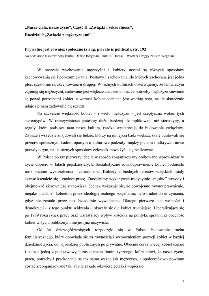 „Nasze ciała, nasze Ŝycie”, Część II „Związki i seksualność”, Rozdział 9 „Związki z męŜczyznami” Prywatne jest równieŜ społeczne (z ang. private is political), str. 192 Na podstawie tekstów: Sary Burke, Denise Bergman, Paula B. Doress – Worters i Peggy Nelson Wegman W procesie wychowania męŜczyźni i kobiety uczeni są róŜnych sposobów zachowywania się i porozumiewania. Postawy i zachowania, do których zachęcana jest jedna płeć, często nie są akceptowane u drugiej. W róŜnych kulturach obserwujemy, Ŝe temu, czym zajmują się męŜczyźni, nadawane jest większe znaczenie oraz Ŝe potrzeby męŜczyzn stawiane są ponad potrzebami kobiet, a wartość kobiet oceniana jest według tego, na ile skutecznie udaje się nam zadowolić męŜczyzn. Na szczęście większość kobiet – i wielu męŜczyzn – jest sceptyczna wobec tych stereotypów. W rzeczywistości jesteśmy duŜo bardziej skomplikowani niŜ stereotypy, a reguły, które podsuwa nam nasza kultura, rzadko wystarczają do budowania związków. Zawsze i wszędzie znajdowali się ludzie, którzy na mniejszą bądź większą skalę buntowali się przeciw społecznym kodom opartym o kulturowe podziały między płciami i odkrywali nowe prawdy o tym, na ile róŜnych sposobów człowiek moŜe Ŝyć i się realizować. W Polsce po raz pierwszy idee te w sposób zorganizowany próbowano wprowadzać w Ŝycie dopiero w latach pięćdziesiątych. Socjalistyczne równouprawnienie kobiet podniosło nasz poziom wykształcenia i zatrudnienia. Kobiety z biednych terenów wiejskich miały szanse kształcić się i znaleźć pracę. Zaczęłyśmy wykonywać tradycyjnie „męskie” zawody i obejmować kierownicze stanowiska. Jednak wskazuje się, Ŝe powojenne równouprawnienie, niejako „nadane” kobietom przez ideologię realnego socjalizmu, było trudne do utrzymania, gdyŜ nie zostało przez nas świadomie wywalczone. Dlatego pierwsze lata wolności i demokracji – z tego punktu widzenia – okazały się dla kobiet trudniejsze. Liberalizujący się po 1989 roku rynek pracy oraz wzrastający wpływ kościoła na politykę sprawił, iŜ obecność kobiet w Ŝyciu publicznym nie jest juŜ oczywista. Od lat dziewięćdziesiątych rozpoczęło się w Polsce budowanie ruchu feministycznego, który opowiada się za równością i wzmocnieniem pozycji kobiet w kaŜdej dziedzinie Ŝycia, od najbardziej publicznych po prywatne. Obecnie coraz więcej kobiet uznaje i stosuje jedną z podstawowych zasad ruchu feministycznego, która mówi, Ŝe nasze Ŝycie, praca, potrzeby i przekonania są tak samo waŜne jak męŜczyzn, a społeczeństwo powinno zostać zreorganizowane tak, aby tę zasadę odzwierciedlało i wspierało. 1 Odkrycie kobiecej siły, która potwierdzi tę zasadę, moŜe się dokonać wszędzie – w grupie przyjaciółek, w pracy, na szkoleniu, na wakacjach. Kiedy działamy razem, moŜemy docenić nasze umiejętności, wzmocnić pewność siebie, dzielić się doświadczeniami i strategiami, uczyć się ufać innym kobietom. Skądkolwiek płynie impuls, bez względu na to, czy nazywamy to feminizmem, czy nie, przypominamy sobie o naszej niezaleŜności i wartości. Wówczas mniej chętnie godzimy się na to, Ŝeby nasza wolność stała na drugim miejscu, za męską. Podnosimy wyŜej głowy i przekraczamy stare wzorce, które powodowały, Ŝe czułyśmy się zawstydzone, odrzucone lub zagroŜone. Odzyskiwana siła często napotyka na opór w relacjach z męŜczyznami, którzy mogą czuć się zagroŜeni przez nasz rozwój i przemianę. Warto wtedy się przyjrzeć, czym są dla nas te związki – a to moŜe okazać się trudne dla kaŜdej ze stron. Hasło „Ŝycie prywatne kobiet jest równieŜ społeczne” (z ang. „private is political”) wyraŜa przekonanie, Ŝe problemy pozornie prywatne okazują się często symptomami większych problemów społecznych. Na przykład: bicie Ŝony i dzieci to dla wielu ludzi wstydliwy problem rodzinny, w który ani sąsiedzi, ani policja tradycyjnie się nie wtrącali. Tymczasem takie „prywatne” sytuacje ujawniają problemy społeczne (dziś nazywamy je przemocą domową) o nie zbadanej do dziś skali. Inny przykład: kiedy kobiety nie zgadzają się z męŜczyznami i wyraŜają swoje sądy wprost, bez zbędnego przepraszania i pokory, często się zdarza, Ŝe męŜczyźni, zamiast ustosunkować się do treści naszej wypowiedzi, podejmują polemikę ze sposobem, w jaki została sformułowana. Zostajemy wtedy oskarŜone na przykład o nieuzasadnioną agresję, wyrachowanie, arogancję. Słowa takie jak „walcząca”, „agresywna”, „kastrująca” padają po to, Ŝeby pokazać nam, iŜ przekroczyłyśmy pewną ściśle wyznaczoną przez społeczeństwo granicę. W ten sposób, często podświadomie, narzuca się odmienne kryteria oceny: tylko męŜczyznom wolno wyraŜać zdecydowane opinie, a kobiety powinny się z nimi godzić. Wzorce, wpajane nam od dzieciństwa, utrwalane na wiele róŜnych sposobów, utrudniają rozmowę o zmianach światopoglądu nawet z tymi męŜczyznami, których darzymy przyjaźnią bądź uczuciem. W szkole średniej miałam chłopaka, którego bardzo kochałam, ale czasami chciał, Ŝebyśmy razem oglądali magazyny pornograficzne – uwaŜał, Ŝe robienie tego we dwoje świadczy o wyrafinowaniu i udawał, Ŝe wcale nie chodzi o podniecanie się. Ale mi się to nie podobało i w końcu powiedziałam mu, Ŝe moŜe sobie oglądać Playboya, jeŜeli chce, ale ja nie zamierzam tego z nim robić i zajmę się czymś innym do czasu, aŜ skończy. Niedługo potem zerwał ze mną za to, Ŝe byłam taką „radykalną feministką”. 2 Zarówno w związkach z męŜczyznami, jak i w innych sferach Ŝycia kobiety muszą brać pod uwagę nie tylko płeć. Status społeczny, wyznanie, wiek, przekonania polityczne, orientacja seksualna – to tylko niektóre z nieskończonej ilości zmiennych, które splatają się w niepowtar
