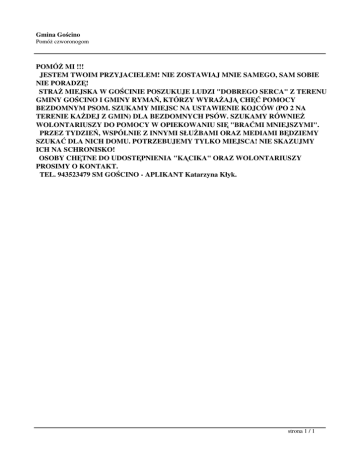 Gmina Gościno Pomóż czworonogom POMÓŻ MI !!! JESTEM TWOIM PRZYJACIELEM! NIE ZOSTAWIAJ MNIE SAMEGO, SAM SOBIE NIE PORADZĘ! STRAŻ MIEJSKA W GOŚCINIE POSZUKUJE LUDZI "DOBREGO SERCA" Z TERENU GMINY GOŚCINO I GMINY RYMAŃ, KTÓRZY WYRAŻAJĄ CHĘĆ POMOCY BEZDOMNYM PSOM. SZUKAMY MIEJSC NA USTAWIENIE KOJCÓW (PO 2 NA TERENIE KAŻDEJ Z GMIN) DLA BEZDOMNYCH PSÓW. SZUKAMY RÓWNIEŻ WOLONTARIUSZY DO POMOCY W OPIEKOWANIU SIĘ "BRAĆMI MNIEJSZYMI". PRZEZ TYDZIEŃ, WSPÓLNIE Z INNYMI SŁUŻBAMI ORAZ MEDIAMI BĘDZIEMY SZUKAĆ DLA NICH DOMU. POTRZEBUJEMY TYLKO MIEJSCA! NIE SKAZUJMY ICH NA SCHRONISKO! OSOBY CHĘTNE DO UDOSTĘPNIENIA "KĄCIKA" ORAZ WOLONTARIUSZY PROSIMY O KONTAKT. TEL. 943523479 SM GOŚCINO - APLIKANT Katarzyna Kłyk. strona 1 / 1