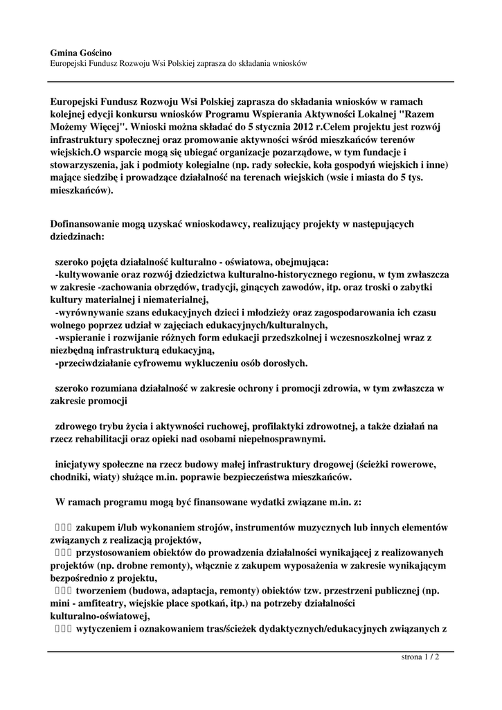 Gmina Gościno Europejski Fundusz Rozwoju Wsi Polskiej zaprasza do składania wniosków Europejski Fundusz Rozwoju Wsi Polskiej zaprasza do składania wniosków w ramach kolejnej edycji konkursu wniosków Programu Wspierania Aktywności Lokalnej "Razem Możemy Więcej". Wnioski można składać do 5 stycznia 2012 r.Celem projektu jest rozwój infrastruktury społecznej oraz promowanie aktywności wśród mieszkańców terenów wiejskich.O wsparcie mogą się ubiegać organizacje pozarządowe, w tym fundacje i stowarzyszenia, jak i podmioty kolegialne (np. rady sołeckie, koła gospodyń wiejskich i inne) mające siedzibę i prowadzące działalność na terenach wiejskich (wsie i miasta do 5 tys. mieszkańców). Dofinansowanie mogą uzyskać wnioskodawcy, realizujący projekty w następujących dziedzinach: szeroko pojęta działalność kulturalno - oświatowa, obejmująca: -kultywowanie oraz rozwój dziedzictwa kulturalno-historycznego regionu, w tym zwłaszcza w zakresie -zachowania obrzędów, tradycji, ginących zawodów, itp. oraz troski o zabytki kultury materialnej i niematerialnej, -wyrównywanie szans edukacyjnych dzieci i młodzieży oraz zagospodarowania ich czasu wolnego poprzez udział w zajęciach edukacyjnych/kulturalnych, -wspieranie i rozwijanie różnych form edukacji przedszkolnej i wczesnoszkolnej wraz z niezbędną infrastrukturą edukacyjną, -przeciwdziałanie cyfrowemu wykluczeniu osób dorosłych. szeroko rozumiana działalność w zakresie ochrony i promocji zdrowia, w tym zwłaszcza w zakresie promocji zdrowego trybu życia i aktywności ruchowej, profilaktyki zdrowotnej, a także działań na rzecz rehabilitacji oraz opieki nad osobami niepełnosprawnymi. inicjatywy społeczne na rzecz budowy małej infrastruktury drogowej (ścieżki rowerowe, chodniki, wiaty) służące m.in. poprawie bezpieczeństwa mieszkańców. W ramach programu mogą być finansowane wydatki związane m.in. z: zakupem i/lub wykonaniem strojów, instrumentów muzycznych lub innych elementów związanych z realizacją projektów, przystosowaniem obiektów do prowadzenia działalności wynikającej z realizowanych projektów (np. drobne remonty), włącznie z zakupem wyposażenia w zakresie wynikającym bezpośrednio z projektu, tworzeniem (budowa, adaptacja, remonty) obiektów tzw. przestrzeni publicznej (np. mini - amfiteatry, wiejskie place spotkań, itp.) na potrzeby działalności kulturalno-oświatowej, wytyczeniem i oznakowaniem tras/ścieżek dydaktycznych/edukacyjnych związanych z strona 1 / 2 Gmina Gościno Europejski Fundusz Rozwoju Wsi Polskiej zaprasza do składania wniosków dziedzictwem historycznym i przyrodniczym regionu (np. tablice informacyjne, miejsca postoju i odpoczynku, itp.) Regulamin programu, zasady kwalifikacji oraz formularz wniosku są dostępne na stronie www.efrwp.pl w zakładce Dotacje. Pozdrawiam Magdalena Pieczyńska Wieloosobowe stanowisko ds. organizacji pozarządowych Wydział Współpracy Społecznej Urząd Marszałkowski WZ tel. ( 0-91) 44 16 224 [email protected] Adres do korespondencji: Urząd Marszałkowski WZ ul. Korsarzy 34 70 - 540 Szczecin strona 2 / 2