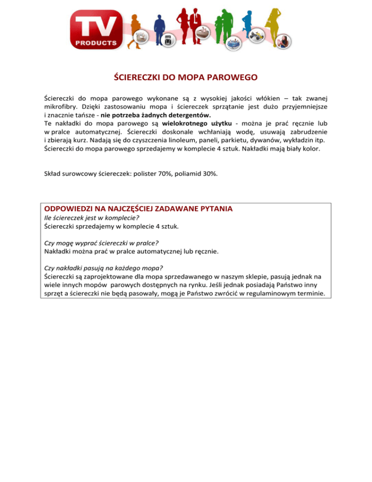 ŚCIERECZKI DO MOPA PAROWEGO Ściereczki do mopa parowego wykonane są z wysokiej jakości włókien – tak zwanej mikrofibry. Dzięki zastosowaniu mopa i ściereczek sprzątanie jest dużo przyjemniejsze i znacznie tańsze ‐ nie potrzeba żadnych detergentów. Te nakładki do mopa parowego są wielokrotnego użytku ‐ można je prać ręcznie lub w pralce automatycznej. Ściereczki doskonale wchłaniają wodę, usuwają zabrudzenie i zbierają kurz. Nadają się do czyszczenia linoleum, paneli, parkietu, dywanów, wykładzin itp. Ściereczki do mopa parowego sprzedajemy w komplecie 4 sztuk. Nakładki mają biały kolor. Skład surowcowy ściereczek: polister 70%, poliamid 30%. ODPOWIEDZI NA NAJCZĘŚCIEJ ZADAWANE PYTANIA Ile ściereczek jest w komplecie? Ściereczki sprzedajemy w komplecie 4 sztuk. Czy mogę wyprać ściereczki w pralce? Nakładki można prać w pralce automatycznej lub ręcznie. Czy nakładki pasują na każdego mopa? Ściereczki są zaprojektowane dla mopa sprzedawanego w naszym sklepie, pasują jednak na wiele innych mopów parowych dostępnych na rynku. Jeśli jednak posiadają Państwo inny sprzęt a ściereczki nie będą pasowały, mogą je Państwo zwrócić w regulaminowym terminie.