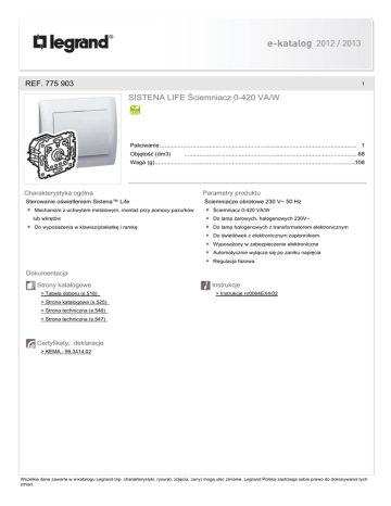 REF. 775 903 1 SISTENA LIFE Ściemniacz 0-420 VA/W Pakowanie .......................................................................................................................................... 1 Objętość (dm3) .......................................................................................................................................... 68 Waga (g) .......................................................................................................................................... 108 Charakterystyka ogólna Parametry produktu Sterowanie oświetleniem Sistena™ Life Ściemniacze obrotowe 230 V~ 50 Hz Mechanizm z uchwytem metalowym, montaż przy pomocy pazurków Ściemniacz 0-420 VA/W lub wkrętów Do lamp żarowych, halogenowych 230V~ Do wyposażenia w klawisz/plakietkę i ramkę Do lamp halogenowych z transformatorem elektronicznym Do świetlówek z elektronicznym zapłonnikiem Wyposażony w zabezpieczenie elektroniczne Automatycznie wyłącza się po zaniku napięcia Regulacja fazowa Dokumentacja Strony katalogowe > Tabela doboru (s.518) Instrukcje > Instrukcje nr0064EX4/02 > Strona katalogowa (s.525) > Strona techniczna (s.546) > Strona techniczna (s.547) Certyfikaty, deklaracje > KEMA - 99.3414.02 Wszelkie dane zawarte w e-katalogu Legrand (np. charakterystyki, rysunki, zdjęcia, ceny) mogą ulec zmianie. Legrand Polska zastrzega sobie prawo do dokonywania tych zmian.
