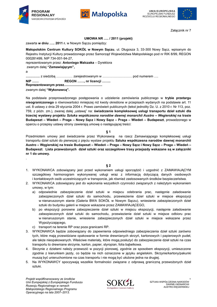 Muzeum Sztuki Współczesnej w Krakowie Załącznik nr 7 UMOWA NR ..... / 2011 (projekt) zawarta w dniu ….. 2011 r. w Nowym Sączu pomiędzy: Małopolskim Centrum Kultury SOKÓŁ w Nowym Sączu, ul. Długosza 3, 33-300 Nowy Sącz, wpisanym do Rejestru Instytucji Kultury prowadzonego przez Samorząd Województwa Małopolskiego pod nr RIK 8/99, REGON 000281499, NIP 734-001-94-27, reprezentowanym przez: Antoniego Malczaka – Dyrektora zwanym dalej “Zamawiającym”, a …………. z siedzibą …………… zarejestrowanym w ……………………… pod numerem …. NIP …… REGON ……, nr licencji …….. Reprezentowanym przez.......................................... zwanym dalej “Wykonawcą”. Na podstawie przeprowadzonego postępowania o udzielenie zamówienia publicznego w trybie przetargu nieograniczonego o równowartości mniejszej niż kwoty określone w przepisach wydanych na podstawie art. 11 ust. 8 ustawy z dnia 29 stycznia 2004 r. Prawo zamówień publicznych (tekst jednolity Dz. U. z 2010 r. Nr 113, poz. 759, z późn. zm.), zwanej dalej „ustawą” na: świadczenie kompleksowej usługi transportu dzieł sztuki dla trzeciej wystawy projektu Sztuka współczesna narodów dawnej monarchii Austro – Wegierskiej na trasie Budapeszt – Wiedeń – Praga – Nowy Sącz i Nowy Sącz – Praga – Wiedeń – Budapeszt, prowadzonego w oparciu o przepisy ustawy strony zawierają umowę o następującej treści: §1 Przedmiotem umowy jest świadczenie przez Wykonawcę na rzecz Zamawiającego kompleksowej usługi transportu dzieł sztuki do pierwszej z pięciu wystaw projektu Sztuka współczesna narodów dawnej monarchii Austro – Węgierskiej na trasie Budapeszt – Wiedeń – Praga – Nowy Sącz i Nowy Sącz – Praga – Wiedeń – Budapeszt. Lista przewożonych dzieł sztuki oraz szczegółowe trasy przejazdy wskazane są w załączniki nr 1 do umowy. . 1. 2. 3. 4. 5. §2 WYKONAWCA zobowiązany jest przed wykonaniem usługi sporządzić i uzgodnić z ZAMAWIAJĄCYM szczegółowy harmonogram wykonywanej usługi wraz z informacją dotyczącą danych osobowych i kontaktowych osób uczestniczących w transporcie, jak również zastosowanych środków bezpieczeństwa. WYKONAWCA zobowiązany jest do wykonania wszystkich czynności związanych z należytym wykonaniem umowy, w tym: a) odpowiednie zabezpieczenie dzieł sztuki w miejscu odebrania prac, następnie załadowanie zabezpieczonych dzieł sztuki do samochodu, przewiezienie dzieł sztuki w miejsce ekspozycji w nienaruszonym stanie (Galeria BWA SOKÓŁ w Nowym Sączu), wniesienie zabezpieczonych dzieł sztuki do budynku galerii w miejsce wskazane przez ZAMAWIAJĄCEGO, b) po ekspozycji ponowne zabezpieczenie dzieł sztuki w miejscu ekspozycji, następnie załadowanie zabezpieczonych dzieł sztuki do samochodu, przewiezienie dzieł sztuki w miejsce odbioru prac w nienaruszonym stanie, wniesienie zabezpieczonych dzieł sztuki w miejsce wskazane przez Wypożyczającego, c) transport na terenie RP oraz poza granicami RP. WYKONAWCA będzie zobowiązany do zapewnienia odpowiedniego zabezpieczenia dzieł sztuki zarówno tych, które mają przewidziane opakowanie w formie drewnianych skrzyń, kartonowych i papierowych pudeł, ale także nieopakowanych. Właściwe materiały, które mogą posłużyć do zabezpieczenie dzieł sztuki na czas transportu to drewniane skrzynie, karton, papier, styropian, folia bąbelkowa. Skrzynie z dziełami należy przewozić w pozycji pionowej, zgodnie ze sposobem ekspozycji, umieszczone zgodnie z kierunkiem jazdy, co będzie na nich oznaczone w języku angielskim. Skrzynie/kartony/pakunki muszą być unieruchomione na czas transportu i nie mogą być ułożone jedna na drugiej. Na WYKONAWCY spoczywają wszelkie formalności związane z odprawą graniczną przewożonych dzieł sztuki. Projekt współfinansowany ze środków Unii Europejskiej z Europejskiego Funduszu Rozwoju Regionalnego w ramach Małopolskiego Regionalnego Programu Operacyjnego na lata 2007–2013. SZTUKA WSPÓŁCZESNA NARODÓW DAWNEJ MONARCHII AUSTRO-WĘGIERSKIEJ MŁODA PUBLICZNOŚĆ W OPERZE – przystąpienie MCK SOKÓŁ do organizacji OPERA EUROPA 1 Muzeum Sztuki Współczesnej w Krakowie 6. 7. 8. 9. 10. 11. 12. 13. 1. 2. 3. 4. 1. 2. 3. 1. 2. 3. 4. 5. 6. 7. 8. 9. WYKONAWCA jest materialnie odpowiedzialny za zaginięcie, uszkodzenie lub zniszczenie dzieł sztuki podczas transportu – do ich pełnej wartości. W wypadku stwierdzenia uszkodzenia dzieł sztuki, odbieranych od osób trzecich, WYKONAWCA zobowiązany jest do zawiadomienia o tym ZAMAWIAJĄCEGO oraz sporządzenia stosownego protokołu. W przypadku zaistnienia jakiegokolwiek zagrożenia przewożonych dzieł sztuki, WYKONAWCA zobowiązany jest do natychmiastowego powiadomienia o tym ZAMAWIAJĄCEGO i innych organów (policji, straży pożarnej, itp.) oraz zabezpieczenia miejsca zdarzenia do czasu przybycia tych organów. Odbiór wykonania usługi dokonywany będzie w siedzibie ZAMAWIAJĄCEGO, na podstawie protokołu odbioru. Osobą upoważnioną przez ZAMAWIAJĄCEGO do podpisywania protokołów odbioru jest …………………….. Nad wykonaniem przedmiotu umowy nadzór ze strony ZAMAWIAJĄCEGO sprawować będzie: ……………... Nad realizacją przedmiotu umowy nadzór ze strony WYKONAWCY sprawować będzie: ………………………. O każdej zmianie osób upoważnionych strony poinformują się pisemnie – niezwłocznie po zaistnieniu zmiany. §3 WYKONAWCA oświadcza, iż posiada niezbędne uprawnienia do wykonania przedmiotu niniejszej umowy i zobowiązuje się wykonać umowę z najwyższą starannością, w szczególności odpowiada za jakość i terminowość wykonania niniejszej umowy i bezpieczeństwo przewożonych dzieł sztuki. Przeniesienie przez WYKONAWCĘ na osobę trzecią jakichkolwiek praw związanych z wykonaniem umowy bez pisemnej zgody ZAMAWIAJĄCEGO jest nieważne. WYKONAWCA ponosi odpowiedzialność cywilną za szkody na osobach i r