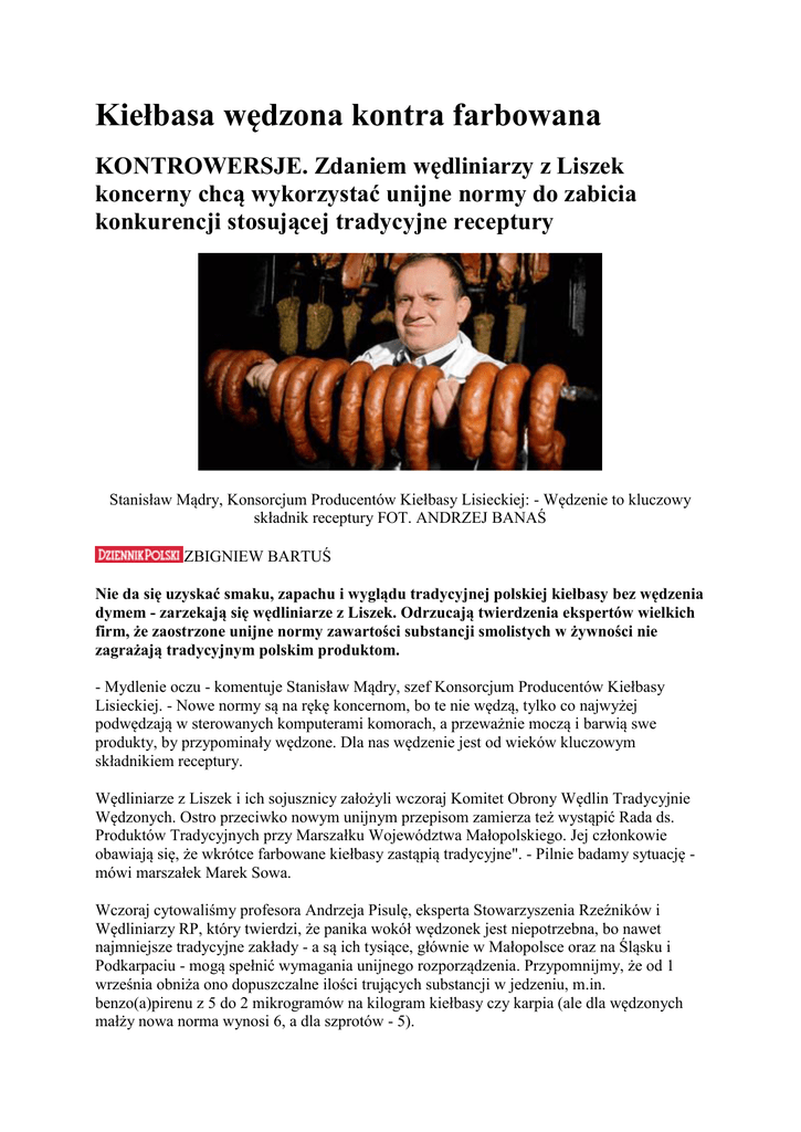 Kiełbasa wędzona kontra farbowana KONTROWERSJE. Zdaniem wędliniarzy z Liszek koncerny chcą wykorzystać unijne normy do zabicia konkurencji stosującej tradycyjne receptury Stanisław Mądry, Konsorcjum Producentów Kiełbasy Lisieckiej: - Wędzenie to kluczowy składnik receptury FOT. ANDRZEJ BANAŚ ZBIGNIEW BARTUŚ Nie da się uzyskać smaku, zapachu i wyglądu tradycyjnej polskiej kiełbasy bez wędzenia dymem - zarzekają się wędliniarze z Liszek. Odrzucają twierdzenia ekspertów wielkich firm, że zaostrzone unijne normy zawartości substancji smolistych w żywności nie zagrażają tradycyjnym polskim produktom. - Mydlenie oczu - komentuje Stanisław Mądry, szef Konsorcjum Producentów Kiełbasy Lisieckiej. - Nowe normy są na rękę koncernom, bo te nie wędzą, tylko co najwyżej podwędzają w sterowanych komputerami komorach, a przeważnie moczą i barwią swe produkty, by przypominały wędzone. Dla nas wędzenie jest od wieków kluczowym składnikiem receptury. Wędliniarze z Liszek i ich sojusznicy założyli wczoraj Komitet Obrony Wędlin Tradycyjnie Wędzonych. Ostro przeciwko nowym unijnym przepisom zamierza też wystąpić Rada ds. Produktów Tradycyjnych przy Marszałku Województwa Małopolskiego. Jej członkowie obawiają się, że wkrótce farbowane kiełbasy zastąpią tradycyjne". - Pilnie badamy sytuację mówi marszałek Marek Sowa. Wczoraj cytowaliśmy profesora Andrzeja Pisulę, eksperta Stowarzyszenia Rzeźników i Wędliniarzy RP, który twierdzi, że panika wokół wędzonek jest niepotrzebna, bo nawet najmniejsze tradycyjne zakłady - a są ich tysiące, głównie w Małopolsce oraz na Śląsku i Podkarpaciu - mogą spełnić wymagania unijnego rozporządzenia. Przypomnijmy, że od 1 września obniża ono dopuszczalne ilości trujących substancji w jedzeniu, m.in. benzo(a)pirenu z 5 do 2 mikrogramów na kilogram kiełbasy czy karpia (ale dla wędzonych małży nowa norma wynosi 6, a dla szprotów - 5). Profesor Pisula zwraca uwagę na preparaty dymu wędzarniczego, oczyszczone ze szkodliwych substancji. Koncerny stosują je masowo. - Przecież to nie to samo co tradycyjne wędzenie! Czy zamiast grillować, Polacy też mają moczyć kiełbasy w roztworze? - oponuje prezes Mądry. Prof. Pisula odpowiada, że tradycyjną metodą też można wytworzyć dym, który pozwoli się zmieścić w normie, czyli poniżej 2 mikrogramów benzo(a)pirenu. Trzeba tylko stosować odpowiednie rodzaje drewna (liściastego) oraz pilnować temperatury (poniżej 400 stopni) i wilgotności. Podkrakowscy wytwórcy informują Stanisława Mądrego o niewielkich, ale jednak, przekroczeniach nowej normy w swych tradycyjnych produktach. - Gdyby dla naszych wędlin dopuszczono 3 mikrogramy benzo(a)pirenu, w ogóle nie byłoby problemu - szacuje Mądry. Komisja Europejska ustaliła 2 mikrogramy, bo z danych, jakie napłynęły do niej ze wszystkich państw Unii, w tym z Polski, wynikało, że nie zagrozi to zdecydowanej większości producentów. W naszym kraju produkty i wytwórców monitorowała inspekcja sanitarna wespół z Państwowym Zakładem Higieny. - Nie prowadziły jednak badań w małych zakładach stosujących tradycyjne metody - ustalił europoseł Bogusław Sonik. Dodaje, że polscy deputowani nie wiedzieli o tym, bo "dyrektywa w ogóle nie przeszła przez parlament". Witold Choiński, szef skupiającego branżowych potentatów stowarzyszenia Polskie Mięso, przyznaje, że tradycyjni wędliniarze faktycznie zostali "niefortunnie pominięci" w monitoringu. Zapewnia, że nikt tego - ani nowych norm - z branżą nie konsultował. - Tak naprawdę nikt nie przeprowadził dotąd u tradycyjnych producentów rzetelnych pomiarów - dziwi się Sonik. - Panikujemy więc trochę w ciemno. Badanie produktów na zawartość substancji smolistych kosztuje w jednej firmie 700 zł.