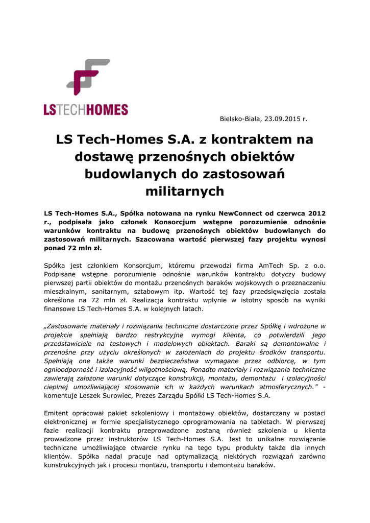Bielsko-Biała, 23.09.2015 r. LS Tech-Homes S.A. z kontraktem na dostawę przenośnych obiektów budowlanych do zastosowań militarnych LS Tech-Homes S.A., Spółka notowana na rynku NewConnect od czerwca 2012 r., podpisała jako członek Konsorcjum wstępne porozumienie odnośnie warunków kontraktu na budowę przenośnych obiektów budowlanych do zastosowań militarnych. Szacowana wartość pierwszej fazy projektu wynosi ponad 72 mln zł. Spółka jest członkiem Konsorcjum, któremu przewodzi firma AmTech Sp. z o.o. Podpisane wstępne porozumienie odnośnie warunków kontraktu dotyczy budowy pierwszej partii obiektów do montażu przenośnych baraków wojskowych o przeznaczeniu mieszkalnym, sanitarnym, sztabowym itp. Wartość tej fazy przedsięwzięcia została określona na 72 mln zł. Realizacja kontraktu wpłynie w istotny sposób na wyniki finansowe LS Tech-Homes S.A. w kolejnych latach. „Zastosowane materiały i rozwiązania techniczne dostarczone przez Spółkę i wdrożone w projekcie spełniają bardzo restrykcyjne wymogi klienta, co potwierdzili jego przedstawiciele na testowych i modelowych obiektach. Baraki są demontowalne i przenośne przy użyciu określonych w założeniach do projektu środków transportu. Spełniają one także warunki bezpieczeństwa wymagane przez odbiorcę, w tym ognioodporność i izolacyjność wilgotnościową. Ponadto materiały i rozwiązania techniczne zawierają założone warunki dotyczące konstrukcji, montażu, demontażu i izolacyjności cieplnej umożliwiającej stosowanie ich w każdych warunkach atmosferycznych.” komentuje Leszek Surowiec, Prezes Zarządu Spółki LS Tech-Homes S.A. Emitent opracował pakiet szkoleniowy i montażowy obiektów, dostarczany w postaci elektronicznej w formie specjalistycznego oprogramowania na tabletach. W pierwszej fazie realizacji kontraktu przeprowadzone zostaną również szkolenia u klienta prowadzone przez instruktorów LS Tech-Homes S.A. Jest to unikalne rozwiązanie techniczne umożliwiające otwarcie rynku na tego typu produkty także dla innych klientów. Spółka nadal pracuje nad optymalizacją niektórych rozwiązań zarówno konstrukcyjnych jak i procesu montażu, transportu i demontażu baraków. „Rozważamy stosowanie podobnych rozwiązań dla domów na terenach katastroficznych, np. po powodziach, huraganach, trzęsieniach ziemi czy konfliktach zbrojnych, a także dla osiedli dla uchodźców. Posiadamy odpowiednie zaplecze produkcyjne do realizacji kontraktu, a wkrótce obecnie budowane nowe hale pozwolą na zwielokrotnienie produkcji i rozszerzenie oferty o obiekty modułowe mieszkalne i komercyjne, a także rekreacyjne, całoroczne domy mobilne.” - ocenia Surowiec. W sierpniu br. Emitent podpisał umowę inwestycyjną o charakterze intencyjnym z Partnerem, który zadeklarował inwestycję w Spółkę w kwocie nieprzekraczającej 15 mln zł poprzez objęcie akcji nowej emisji oraz udzielenie finansowania dłużnego. Obecnie przeprowadzane jest badanie due diligence, którego pozytywny wynik będzie jednym z warunków koniecznych do podpisania ostatecznej umowy inwestycyjnej. Partner posiada wyłączność na prowadzenie negocjacji do dnia 30.10.2015 r. Nawiązana współpraca ma się przyczynić do zwiększenia wartości Spółki. LS Tech-Homes S.A. jest Spółką notowaną na rynku NewConnect od czerwca 2012 r. Zajmuje się ona wdrażaniem nowoczesnych technologii kompozytowych dla różnych gałęzi przemysłu. Głównymi produktami Spółki są płyty magnezowe MgO GREEN oraz płyty kompozytowe - SIP MgO GREEN. *** Kontakt: Artur Górski LS Tech-Homes S.A. - Relacje Inwestorskie www.lstechhomes.com [email protected] tel. +48 501-215-243