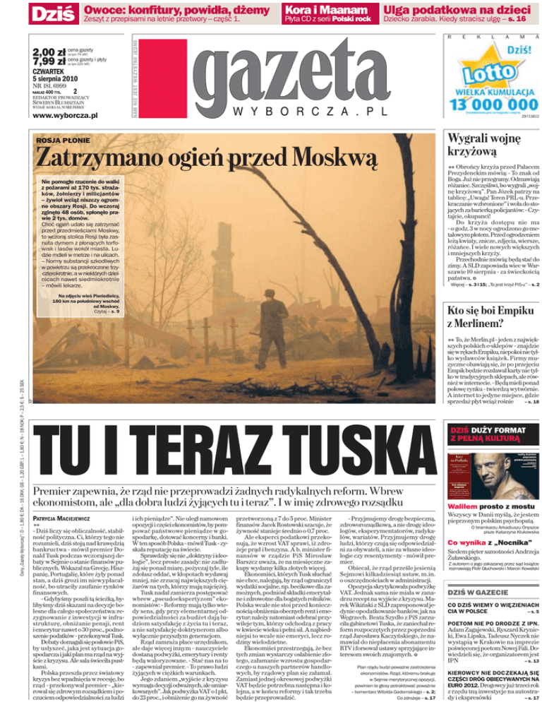 Dziś Owoce: konfitury, powidła, dżemy Kora i Maanam Ulga podatkowa na dzieci Zeszyt z przepisami na letnie przetwory – część 1. Płyta CD z serii Polski rock Dziecko zarabia. Kiedy stracisz ulgę – s. 16 gazety 2,00 zł cena cena gazety i płyty 7,99 zł (w tym 7% VAT) (w tym 22% VAT) CZWARTEK 5 sierpnia 2010 NR 181. 6999 NAKŁAD 400 TYS. 2 REDAKTOR PROWADZĄCY SEWERYN BLUMSZTAJN WYDAJE AGORA SA, NUMER INDEKSU www.wyborcza.pl K L A M A 29713812 ROSJA PŁONIE Zatrzymano ogień przed Moskwą Nie pomogło rzucenie do walki z pożarami aż 170 tys. strażaków, żołnierzy i milicjantów – żywioł wciąż niszczy ogromne obszary Rosji. Do wczoraj zginęło 48 osób, spłonęło prawie 2 tys. domów. Choć ogień udało się zatrzymać przed przedmieściami Moskwy, to wczoraj stolica Rosji była zasnuta dymem z płonących torfowisk i lasów wokół miasta. Ludzie mdleli w metrze i na ulicach. – Normy substancji szkodliwych w powietrzu są przekroczone trzy-czterokrotnie, a w niektórych dzielnicach nawet siedmiokrotnie – mówili lekarze. Wygrali wojnę krzyżową Obrońcy krzyża przed Pałacem Prezydenckim mówią: – To znak od Boga. Już nie przegramy. Odmawiają różaniec. Szczęśliwi, bo wygrali „wojnę krzyżową”. Pan Józek patrzy na tablicę: „Uwaga! Teren PRL-u. Przekraczanie wzbronione” i woła do stojących za barierką policjantów: – Czytajcie, okupanci! Do krzyża dostępu nie ma – o godz. 3 w nocy ogrodzono go metalowym płotem. Przed ogrodzeniem leżą kwiaty, znicze, zdjęcia, wiersze, różańce. I wiele nowych większych i mniejszych krzyży. Przechodnie mówią: będą stać do zimy. A SLD zapowiada wiec w Warszawie 10 sierpnia – za świeckością państwa. Więcej – s. 3 i 15; „To jest krzyż PiS-u” – s. 2 Na zdjęciu wieś Pieriedielcy, 180 km na południowy wschód od Moskwy. Czytaj – s. 9 Kto się boi Empiku z Merlinem? To, że Merlin.pl – jeden z największych polskich e-sklepów – znajdzie się wrękach Empiku, niepokoi nie tylko wydawców książek. Firmy muzyczne obawiają się, że po przejęciu Empik będzie rozdawał karty nie tylko w tradycyjnych sklepach, ale również winternecie. – Będą mieli ponad połowę rynku – twierdzą wytwórnie. A internet to jedyne miejsce, gdzie sprzedaż płyt wciąż rośnie – s. 18 AP Ceny „Gazety Wyborczej”: D – 1,80 ¤; DK – 16 DKK; GB – 1,20 GBP; L – 1,80 ¤; N – 18 NOK; P – 2,5 ¤; S – 25 SEK E NAM NIE JEST WSZYSTK WSZYSTKO JEDNO R TU I TERAZ TUSKA DZIŚ DUŻY FORMAT Z PEŁNĄ KULTURĄ myślą, że jestem pieprzonym polskim psychopatą Kicz na Podhalu O bramkarzu Arkadiuszu Onyszce pisze Katarzyna Klukowska, s.2 Dlaczego górale uważają brzydkie za piękne Wyjaśniają TOMASZ WIECH (ZDJĘCIA) i GRZEGORZ SROCZYŃSKI (ŚLEDZTWO) strona 4 Król chińskich blogerów Premier zapewnia, że rząd nie przeprowadzi żadnych radykalnych reform. Wbrew ekonomistom, ale „dla dobra ludzi żyjących tu i teraz”. I w imię zdrowego rozsądku Waliłem prosto z mostu PATRYCJA MACIEJEWICZ Wszyscy w Danii myślą, że jestem pieprzonym polskim psychopatą. – Dziś liczy się obliczalność, stabilność polityczna. Ci, którzy tego nie rozumieli, dziś stoją nad krawędzią bankructwa – mówił premier Donald Tusk podczas wczorajszej debaty w Sejmie o stanie finansów publicznych. Wskazał na Grecję, Hiszpanię, Portugalię, które żyły ponad stan, a dziś grozi im niewypłacalność, bo utraciły zaufanie rynków finansowych. – Gdybyśmy poszli tą ścieżką, bylibyśmy dziś skazani na decyzje bolesne dla całego społeczeństwa: rezygnowanie z inwestycji w infrastrukturę, obniżanie pensji, rent i emerytur nawet o 30 proc., podnoszenie podatków – przekonywał Tusk. Debaty domagali się posłowie PiS, by usłyszeć, jaka jest sytuacja gospodarcza i jaki plan ma rząd na wyjście z kryzysu. Ale sala świeciła pustkami. Polska przeszła przez światowy kryzys bez wpadnięcia w recesję, bo rząd – przekonywał premier – „kierował się zdrowym rozsądkiem i poczuciem odpowiedzialności za ludzi i ich pieniądze”. Nie uległ namowom opozycji i części ekonomistów, by pompować państwowe pieniądze w gospodarkę, dotować koncerny i banki. W ten sposób Polska – mówił Tusk – zyskała reputację na świecie. Sprawdziły się nie „doktryny i ideologie”, lecz proste zasady: nie zadłużaj się ponad miarę, pożyczaj tyle, ile zdołasz oddać, w kłopotach wydawaj mniej, nie zrzucaj największych ciężarów na tych, którzy mają najciężej. Tusk nadal zamierza postępować wbrew „pseudoekspertyzom” ekonomistów: – Reformy mają tylko wtedy sens, gdy przy elementarnej odpowiedzialności za budżet dają ludziom satysfakcję z życia tu i teraz, a nie satysfakcję doktrynerom albo wyłącznie przyszłym generacjom. Rząd zamraża płace urzędnikom, ale daje więcej innym – nauczyciele dostaną podwyżki, emerytury i renty będą waloryzowane. – Stać nas na to – zapewniał premier. – To prawo ludzi żyjących w ciężkich warunkach. Jego zdaniem „wyjście z kryzysu wymaga decyzji odważnych, ale umiarkowanych”. Jak podwyżka VAT o 1 pkt, do 23 proc., i obniżenie go na żywność przetworzoną z 7 do 5 proc. Minister finansów Jacek Rostowski szacuje, że żywność stanieje średnio o 0,7 proc. Ale eksperci podatkowi przekonują, że wzrost VAT sprawi, iż zdrożeje prąd i benzyna. A b. minister finansów w rządzie PiS Mirosław Barszcz uważa, że na miesięczne zakupy wydamy kilka złotych więcej. Ekonomiści, których Tusk słuchać nie chce, nalegają, by rząd ograniczył wydatki socjalne, np. becikowe dla zamożnych, podniósł składki emerytalne i zdrowotne dla bogatych rolników. Polska wcale nie stoi przed koniecznością obniżenia obecnych rent i emerytur; należy natomiast odebrać przywileje tym, którzy odchodzą z pracy w kwiecie wieku i pełni sił. A najbiedniejsi to wcale nie emeryci, lecz 