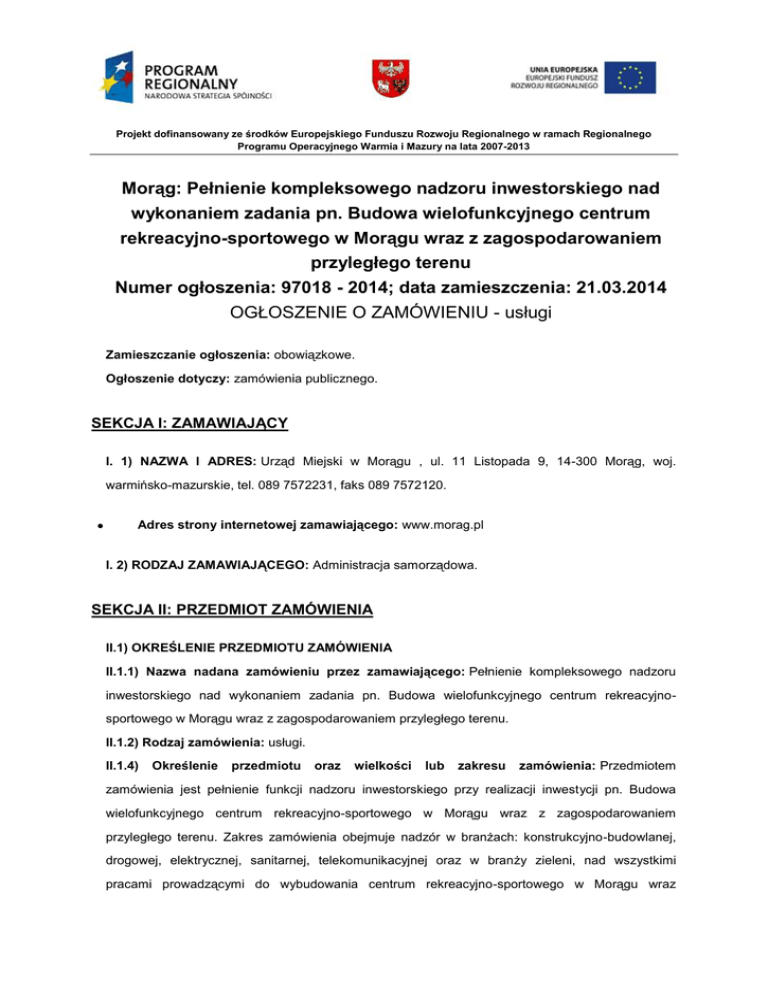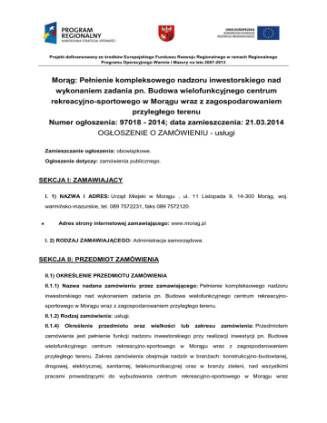Projekt dofinansowany ze środków Europejskiego Funduszu Rozwoju Regionalnego w ramach Regionalnego Programu Operacyjnego Warmia i Mazury na lata 2007-2013 Morąg: Pełnienie kompleksowego nadzoru inwestorskiego nad wykonaniem zadania pn. Budowa wielofunkcyjnego centrum rekreacyjno-sportowego w Morągu wraz z zagospodarowaniem przyległego terenu Numer ogłoszenia: 97018 - 2014; data zamieszczenia: 21.03.2014 OGŁOSZENIE O ZAMÓWIENIU - usługi Zamieszczanie ogłoszenia: obowiązkowe. Ogłoszenie dotyczy: zamówienia publicznego. SEKCJA I: ZAMAWIAJĄCY I. 1) NAZWA I ADRES: Urząd Miejski w Morągu , ul. 11 Listopada 9, 14-300 Morąg, woj. warmińsko-mazurskie, tel. 089 7572231, faks 089 7572120. Adres strony internetowej zamawiającego: www.morag.pl I. 2) RODZAJ ZAMAWIAJĄCEGO: Administracja samorządowa. SEKCJA II: PRZEDMIOT ZAMÓWIENIA II.1) OKREŚLENIE PRZEDMIOTU ZAMÓWIENIA II.1.1) Nazwa nadana zamówieniu przez zamawiającego: Pełnienie kompleksowego nadzoru inwestorskiego nad wykonaniem zadania pn. Budowa wielofunkcyjnego centrum rekreacyjnosportowego w Morągu wraz z zagospodarowaniem przyległego terenu. II.1.2) Rodzaj zamówienia: usługi. II.1.4) Określenie przedmiotu oraz wielkości lub zakresu zamówienia: Przedmiotem zamówienia jest pełnienie funkcji nadzoru inwestorskiego przy realizacji inwestycji pn. Budowa wielofunkcyjnego centrum rekreacyjno-sportowego w Morągu wraz z zagospodarowaniem przyległego terenu. Zakres zamówienia obejmuje nadzór w branżach: konstrukcyjno-budowlanej, drogowej, elektrycznej, sanitarnej, telekomunikacyjnej oraz w branży zieleni, nad wszystkimi pracami prowadzącymi do wybudowania centrum rekreacyjno-sportowego w Morągu wraz Projekt dofinansowany ze środków Europejskiego Funduszu Rozwoju Regionalnego w ramach Regionalnego Programu Operacyjnego Warmia i Mazury na lata 2007-2013 zagospodarowaniem przyległego terenu. Szczegółowy zakres przedmiotu zamówienia określa wzór/projekt umowy i zawarte w nim zapisy. UWAGA: 1. Szczegółowy zakres robót budowlanych objętych niniejszym kompleksowym nadzorem inwestorskim określa dokumentacja techniczna, STWIOR, przedmiary oraz udzielone odpowiedzi na zapytania do SIWZ (wraz z załącznikami) zamieszczone na stronie internetowej (do pobrania): http://bip.warmia.mazury.pl/morag_gmina_miejska/zamowienia_publiczne/110/status/rodzaj/wzp/ - zadanie z Budowa wielofunkcyjnego centrum rekreacyjno-sportowego w Morągu wraz zagospodarowaniem przyległego terenu 2. Niedoszacowanie, pominięcie oraz brak rozpoznania zakresu przedmiotu umowy nie może być podstawą do żądania zmiany wynagrodzenia ryczałtowego. Zamawiający informuje, że zadanie dofinansowane jest przez Unię Europejską z Europejskiego Funduszu Rozwoju Regionalnego w ramach Regionalnego Programu Operacyjnego Warmia i Mazury na lata 2007-2013. Informacja dotycząca płatności: Zamawiający dokona płatności w roku 2014 maksymalnie na kwotę 189 739,73 zł brutto. Pozostała kwota ceny ofertowej Wykonawcy zostanie opłacona w roku 2015.. II.1.5) przewiduje się udzielenie zamówień uzupełniających: Określenie przedmiotu oraz wielkości lub zakresu zamówień uzupełniających Zamawiający przewiduje udzielenie zamówień uzupełniających stanowiących nie więcej niż 50 % wartości zamówienia podstawowego i polegających na powtórzeniu zamówień tego samego rodzaju, zgodnie z art. 67 ust. 1 pkt. 6 ustawy Prawo zamówień publicznych. II.1.6) Wspólny Słownik Zamówień (CPV): 71.24.70.00-1. II.1.7) Czy dopuszcza się złożenie oferty częściowej: nie. II.1.8) Czy dopuszcza się złożenie oferty wariantowej: nie. II.2) CZAS TRWANIA ZAMÓWIENIA LUB TERMIN WYKONANIA: Zakończenie: 22.06.2015. SEKCJA III: INFORMACJE O CHARAKTERZE PRAWNYM, EKONOMICZNYM, FINANSOWYM I TECHNICZNYM III.1) WADIUM Projekt dofinansowany ze środków Europejskiego Funduszu Rozwoju Regionalnego w ramach Regionalnego Programu Operacyjnego Warmia i Mazury na lata 2007-2013 Informacja na temat wadium: Warunkiem udziału w postępowaniu przetargowym jest wniesienie wadium w wysokości: 5 000.00 PLN (słownie: pięć tysięcy 00/100 PLN) Wadium należy wnieść w terminie do dnia 2014-03-31 do godz. 09:00. Wadium może być wniesione w następującej formie: 1. pieniądzu: przelewem na rachunek bankowy Zamawiającego: Bank Millennium S.A. Warszawa o/Morąg 32116022020000000061934146;o uznaniu przez zamawiającego, że wadium w pieniądzu wpłacono w terminie decyduje data wpływu środków na rachunek zamawiającego. Wniesienie wadium w pieniądzu będzie skuteczne, jeżeli znajdzie się na rachunku bankowym Zamawiającego, przed upływem terminu (godziny) przewidzianego na wniesienie wadium. 2. Poręczeniach bankowych lub poręczeniach spółdzielczej kasy oszczędnościowo-kredytowej, z tym że poręczenie kasy jest zawsze poręczeniem pieniężnym. 3. Gwarancji bankowej. 4. Gwarancji ubezpieczeniowej. 5. Poręczeniach udzielanych przez podmioty, o których mowa w art. 6b ust. 5 pkt 2 ustawy z dnia 9 listopada 2000 r. o utworzeniu Polskiej Agencji Rozwoju Przedsiębiorczości (Dz. U. Nr 109, poz. 1158 z późn. zm.). W zależności od wybranej formy wadium (ust.9.3 pkt 1-5) - zaleca się kserokopię dokumentu potwierdzającego wniesienie wadium dołączyć do oferty, a oryginał należy złożyć w siedzibie Zamawiającego w kasie zamawiającego pok. nr 10 (pn. - pt. 07.00-15,00). Jeżeli kasa będzie nieczynna oryginał gwarancji należy złożyć w Sekretariacie. Gwarancja bankowa lub ubezpieczeniowa, stanowiąca formę wniesienia wadium, winna spełniać co najmniej następujące wymogi (pod rygorem wykluczenia wykonawcy): 1. ustalać beneficjenta gwarancji, tj. Gminę Morąg reprezentowaną przez Burmistrza Morąga, 2. określać kwotę gwarantowaną w zł (ustaloną w SIWZ), 3. określać termin ważności (wynikający z SIWZ), 4. określać przedmiot gwarancji (wynikający z SIWZ), 5. musi zawierać klauzule gwarantujące bezwarunkową wypłatę 